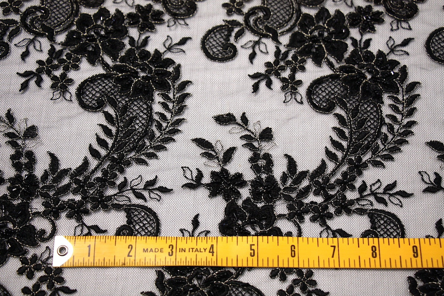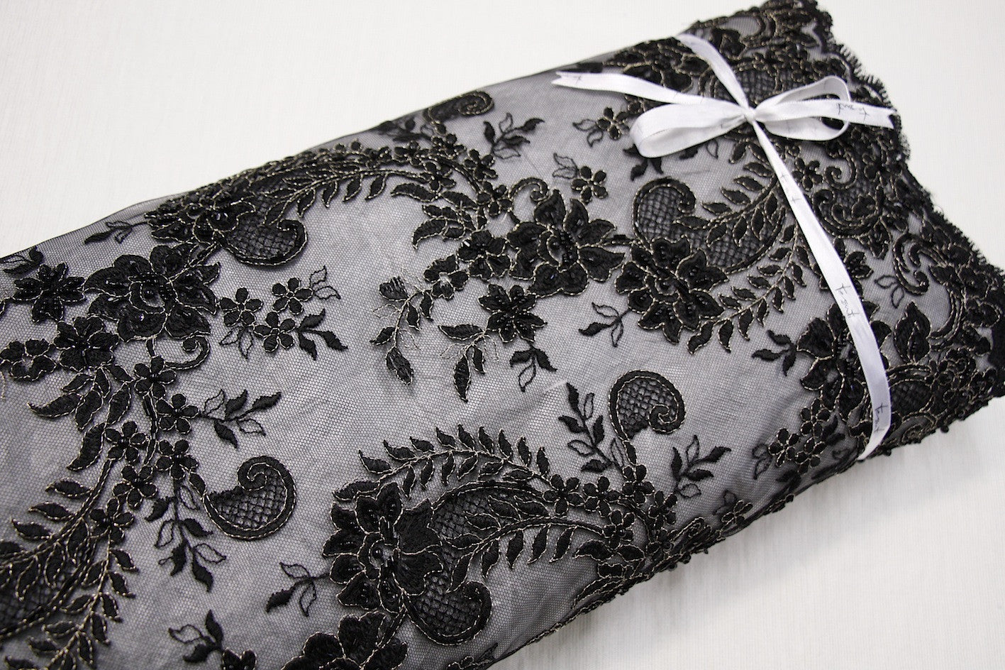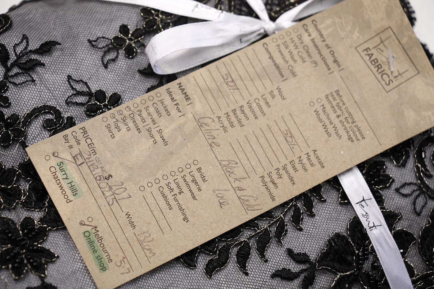 Black/gold 50% Rayon 50% Nylon beaded tulle lace. Width 132cm