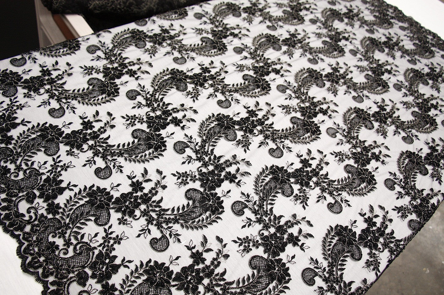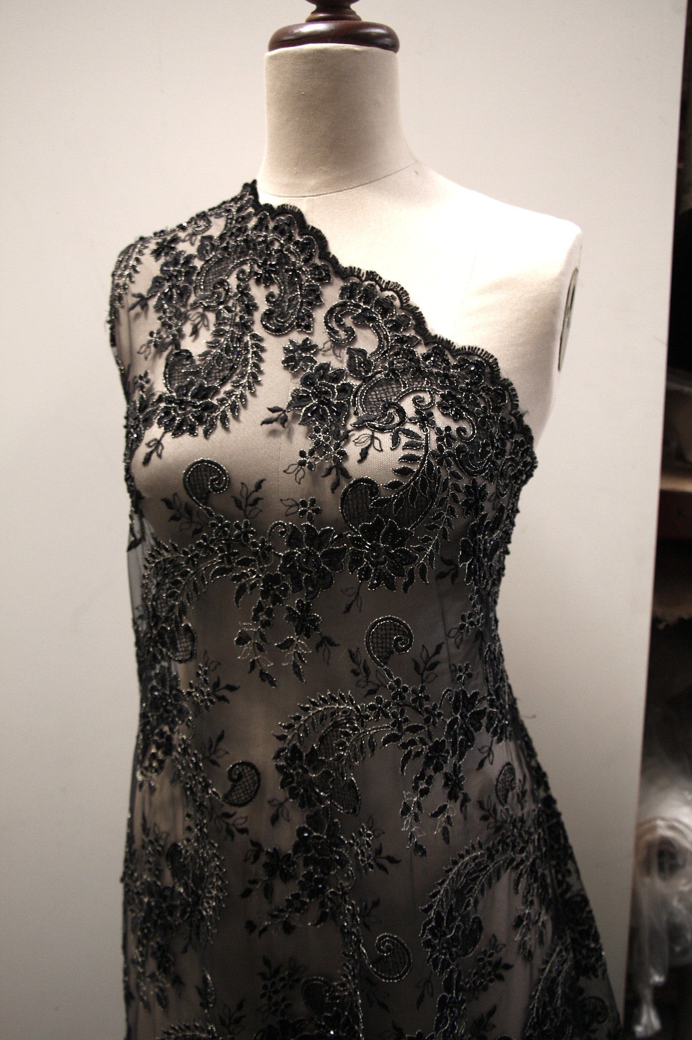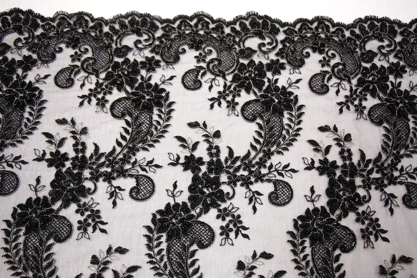 Black/gold 50% Rayon 50% Nylon beaded tulle lace. Width 132cm