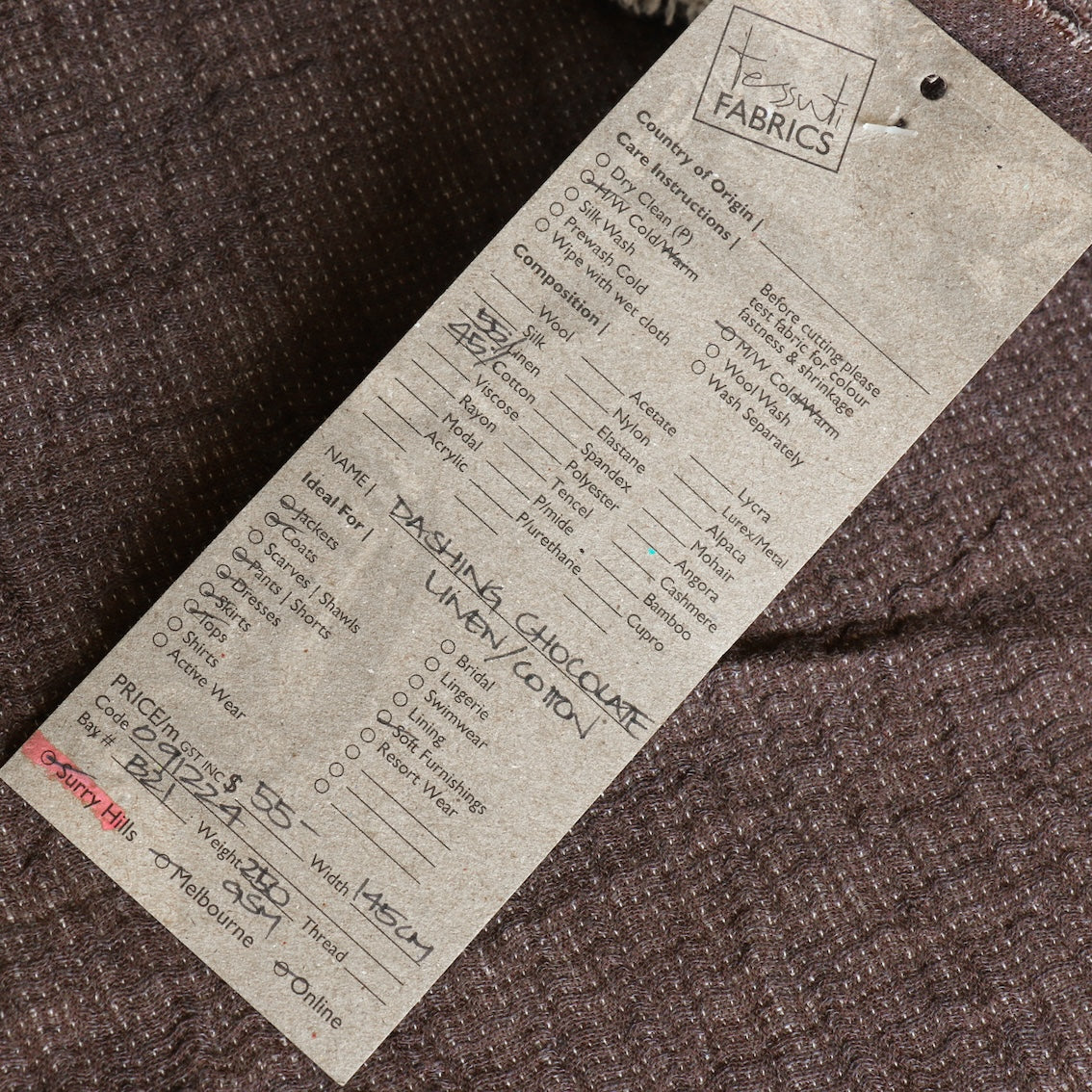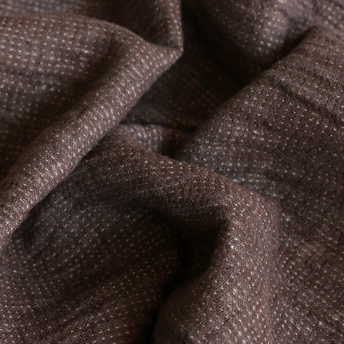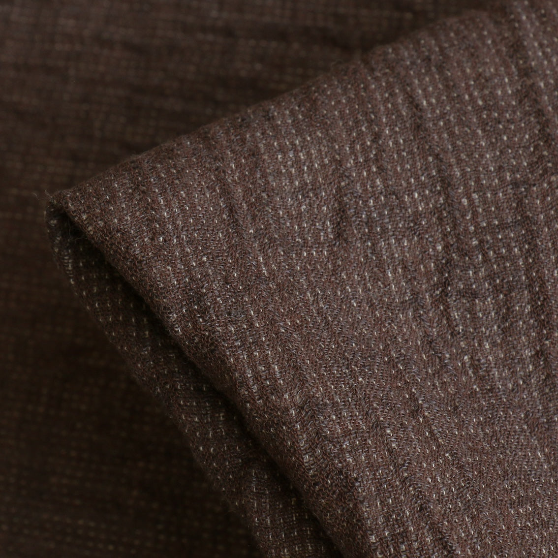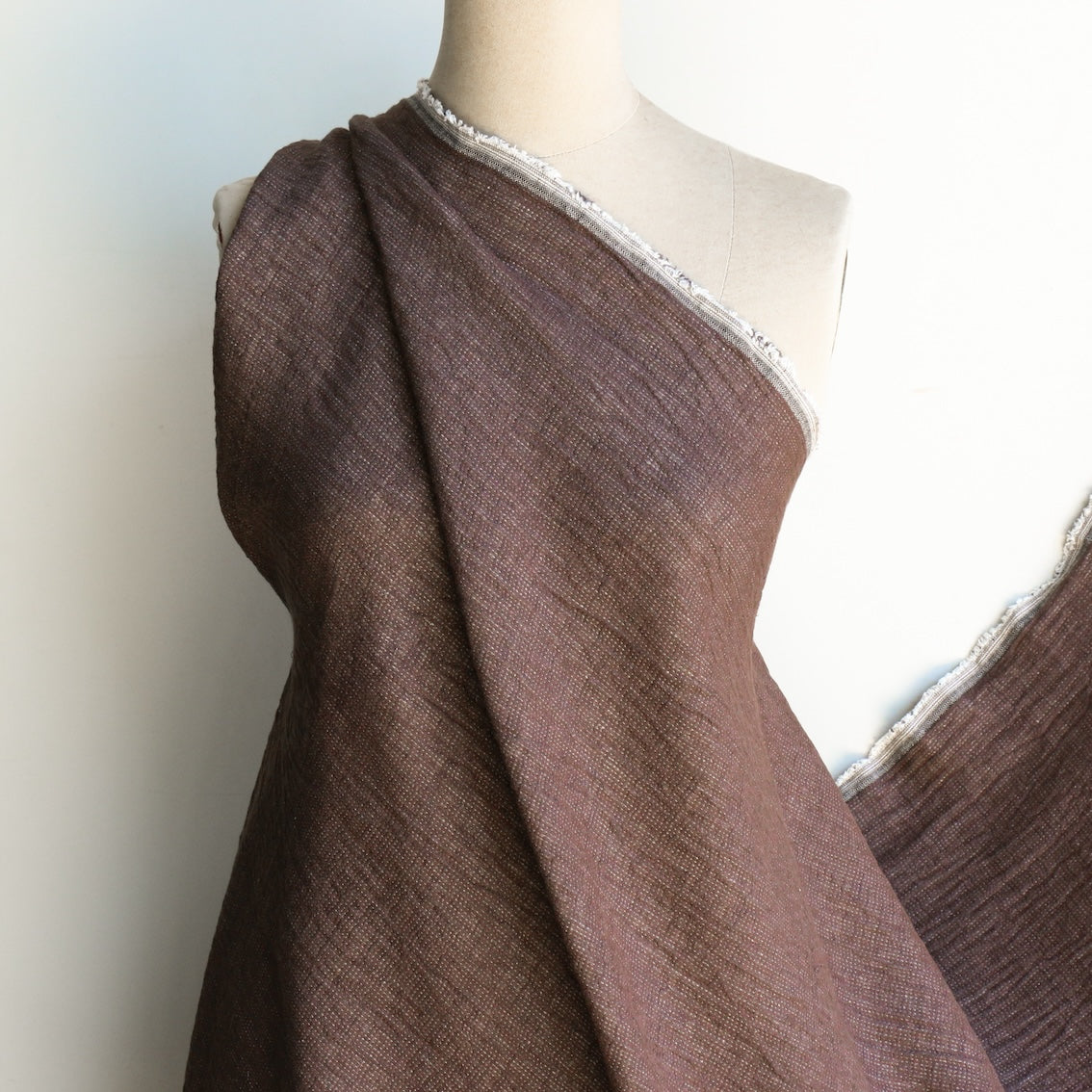 Chocolate yarn-dyed washed textured 55% linen 45% cotton with ecru backing and pin stitch detail