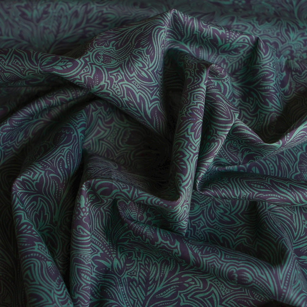 Travelling back to the late 1870s when Thomas Wardle provided Liberty with their first ever printed fabrics, Dramatic Bloom honours the beginning of the brand's textile journey. Discovered as fabric fragments in the archive, these pieces were meticulously assembled and redrawn by the design studio. Inspired by Indian wood blocks, this monochrome floral is in constant shift, giving rise to a mesmerising canvas of bold, stylised blooms amongst swirling foliage.