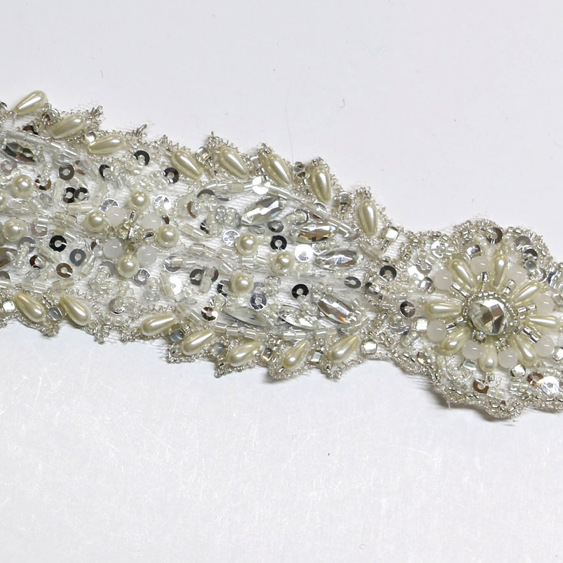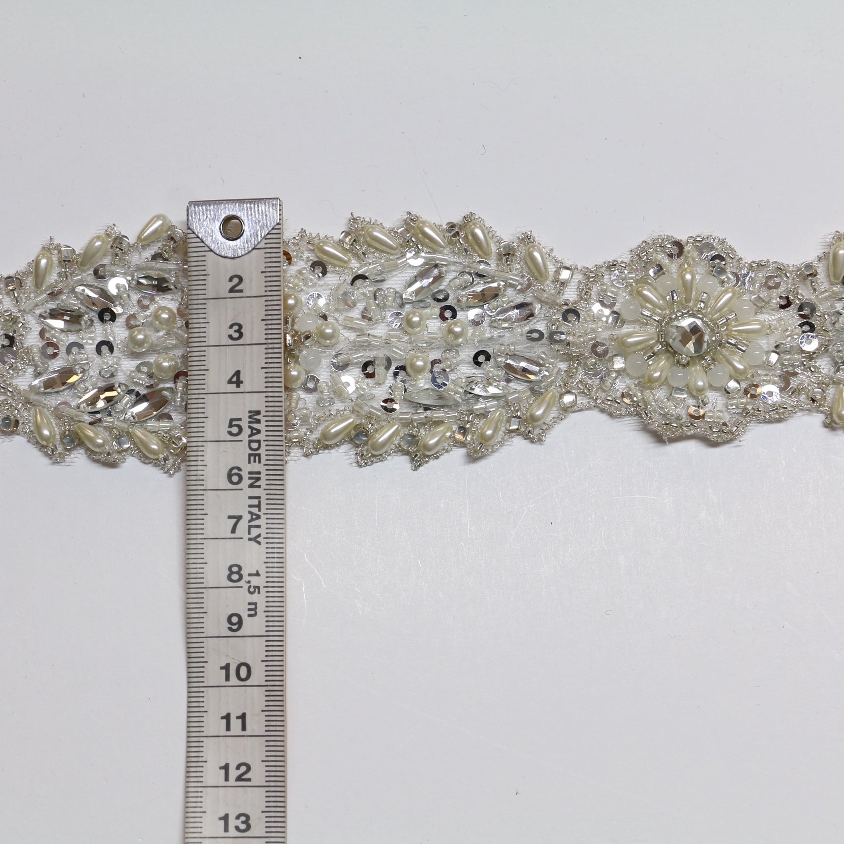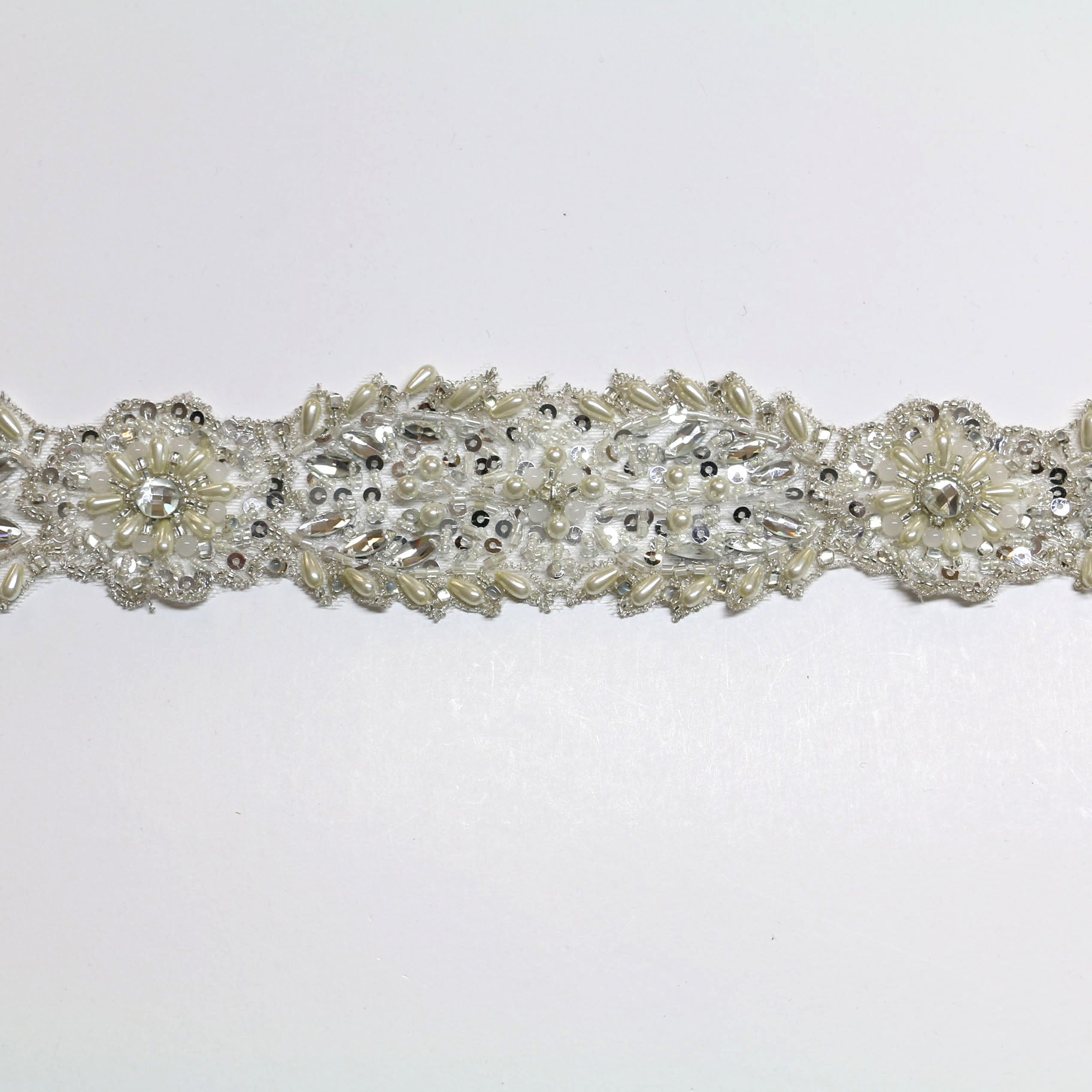 Ivory beaded, pearl and crystal trim.