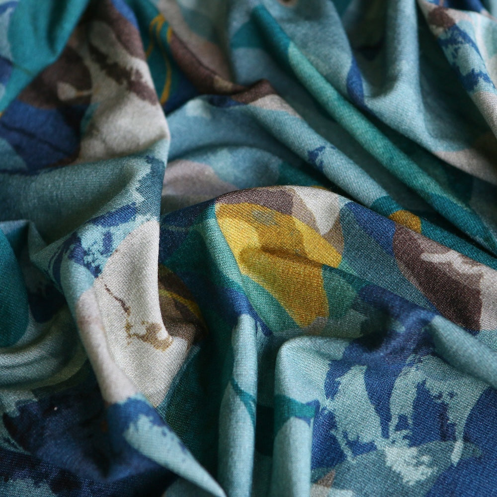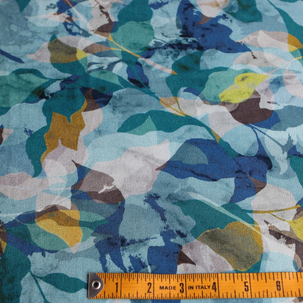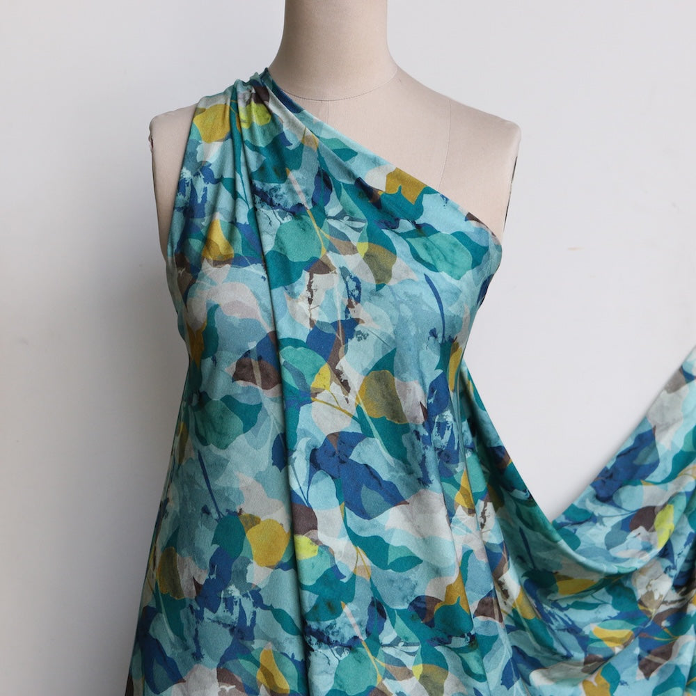 Italian teal/blue/citrene printed leaves 94% viscose 6% elastane jersey knit