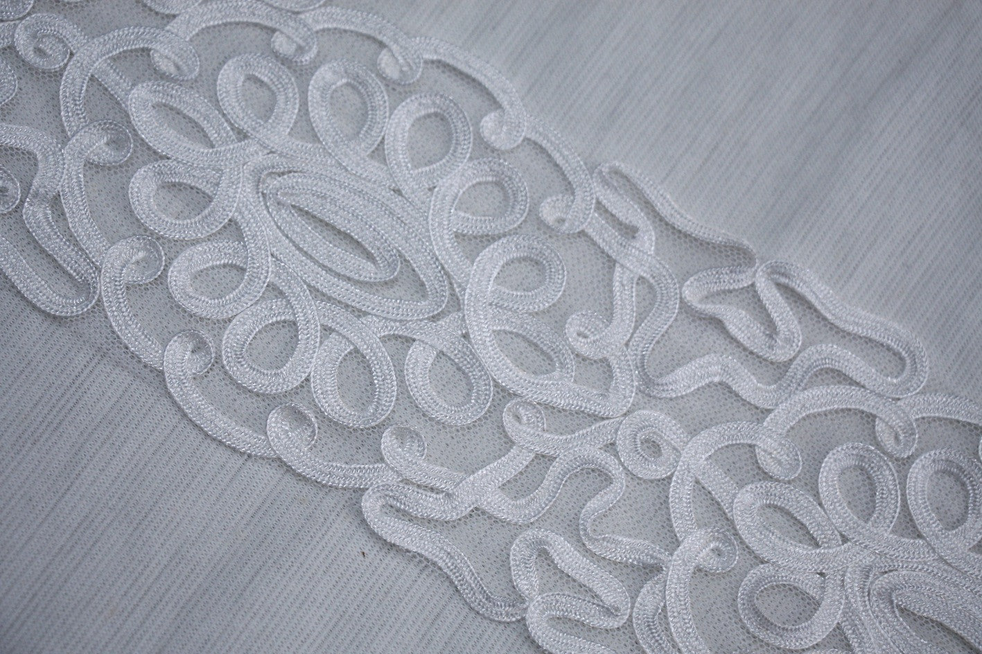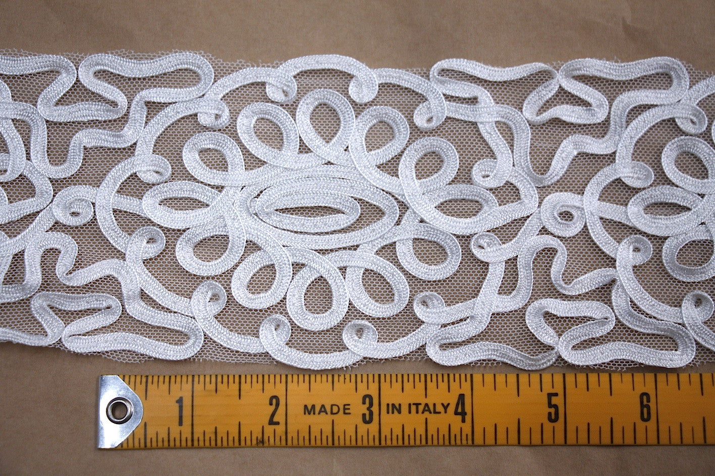 Off white rayon ribbon on nylon tulle trim. Width: 9cm wide.