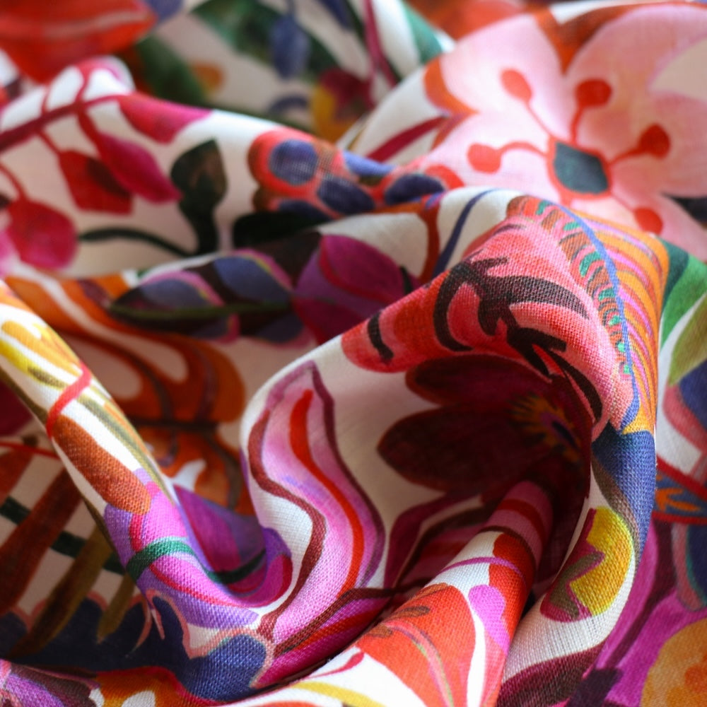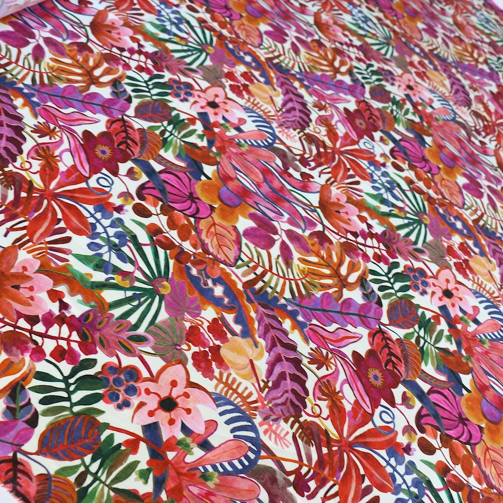 In Jungle Trip, intense tones and expressive paint marks create a layered tangle of foliage and flowers. A richly imaginative tropical landscape emerges, its stylised elements depicted in a riot of colour – painted by hand in the Liberty Fabrics studio.