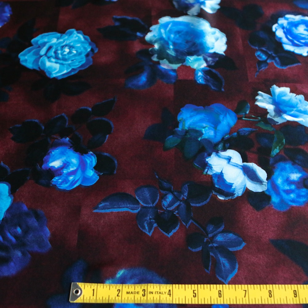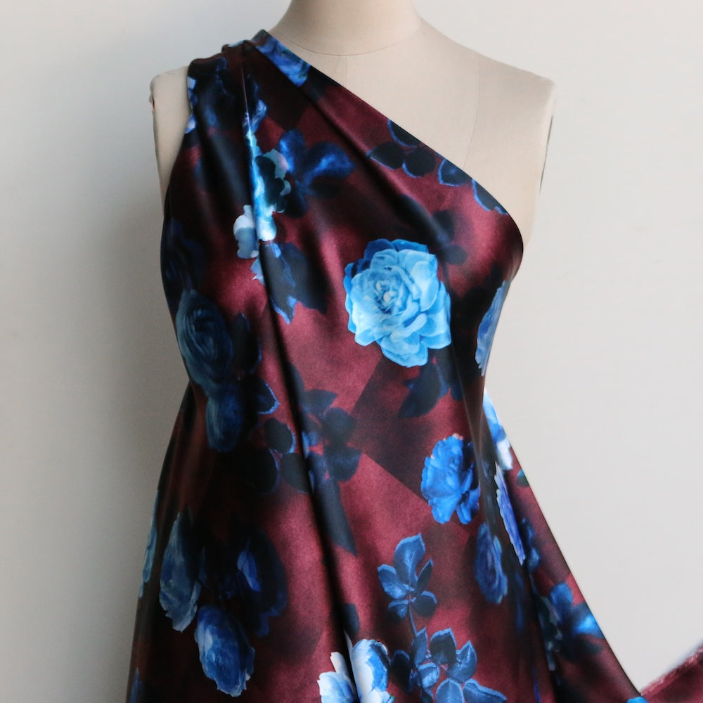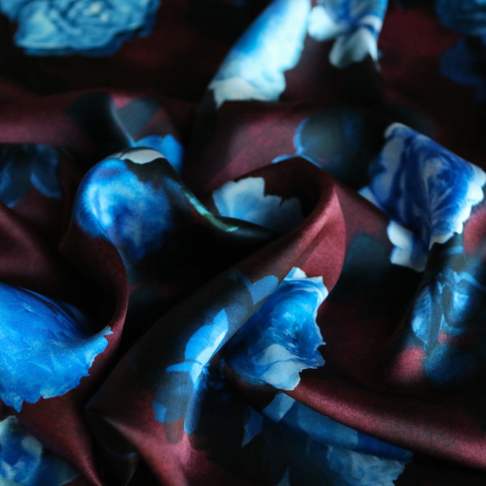 Liberty Fabrics plum/blue floral digitally printed 100% silk satin