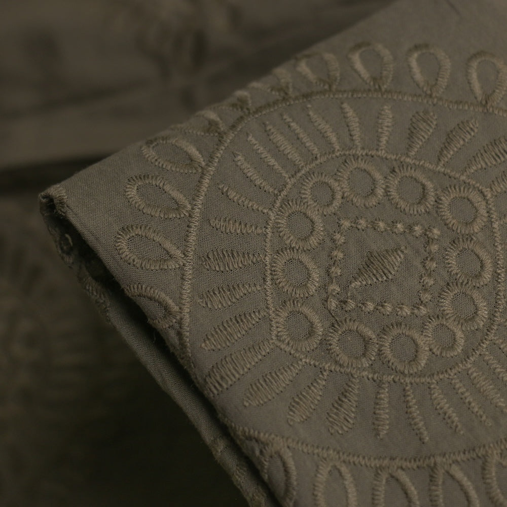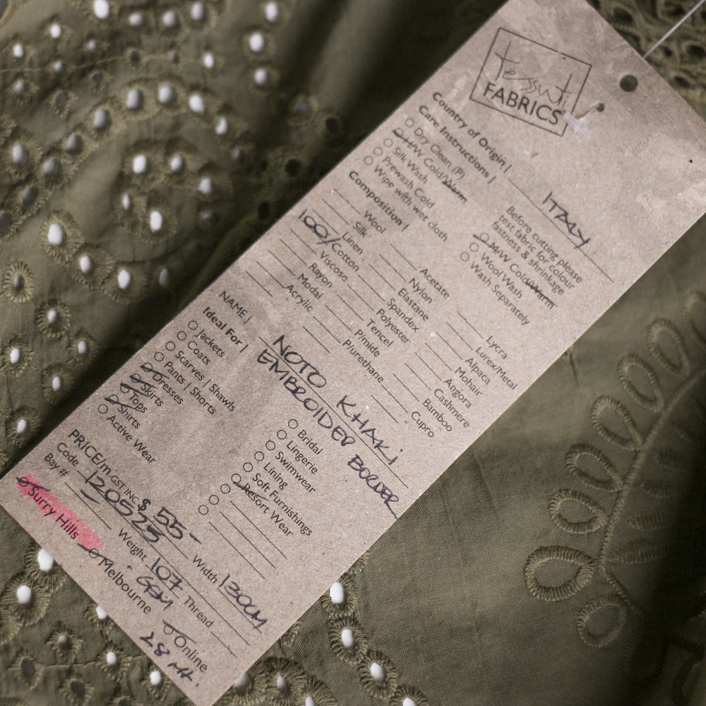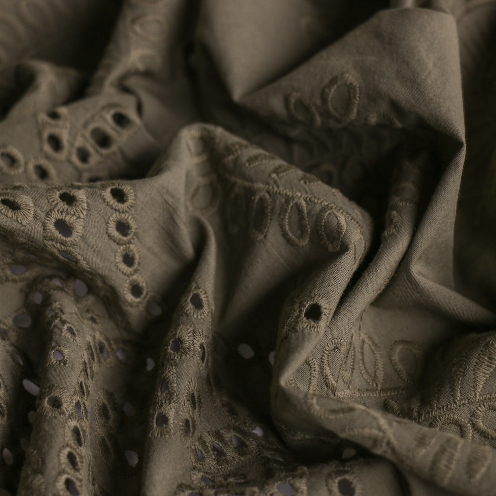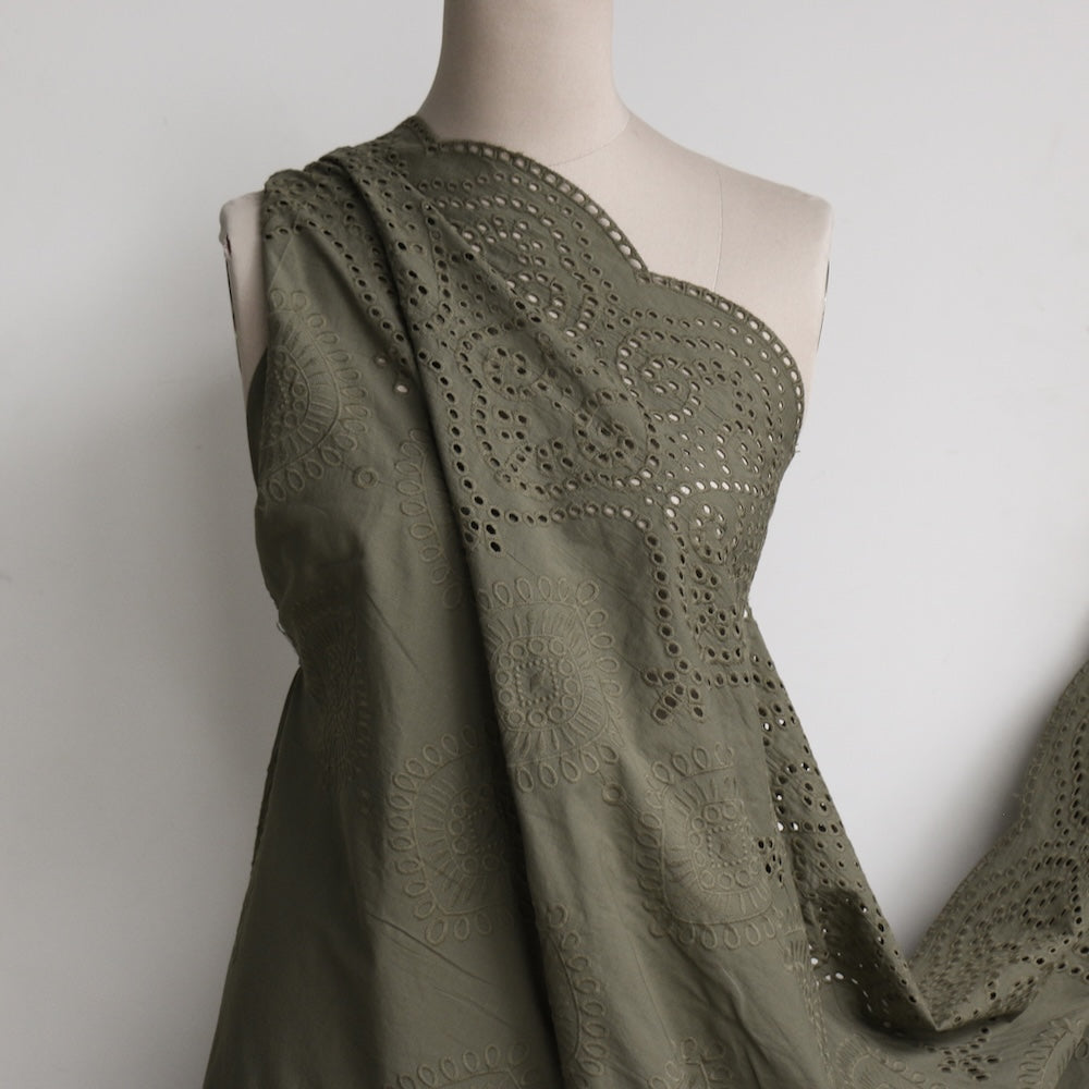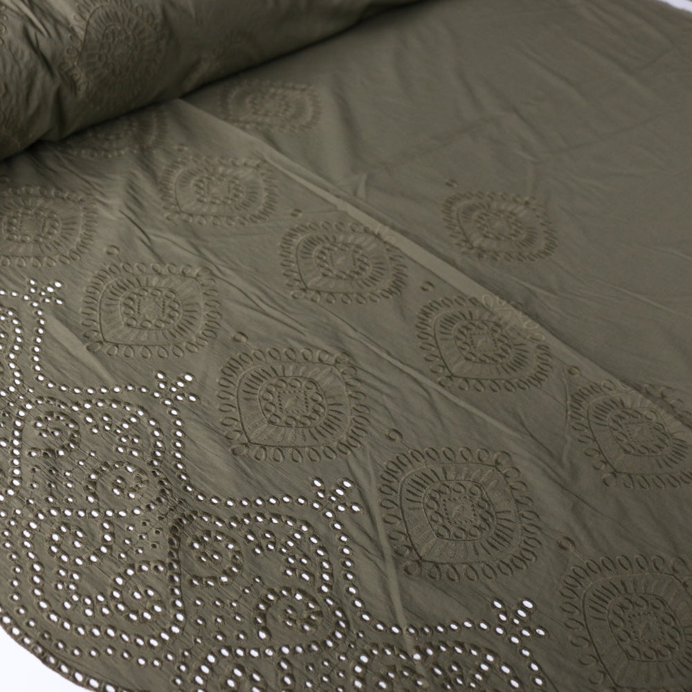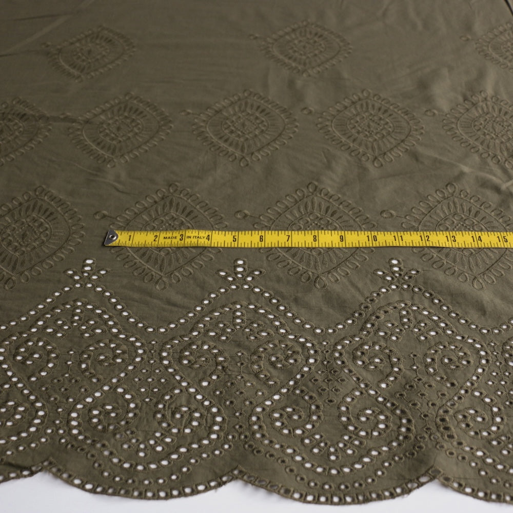 Italian khaki 100% cotton with khaki embroidered motif and scalloped eyelet border on one selvedge (Note: garments to be cut on the crossgrain)
