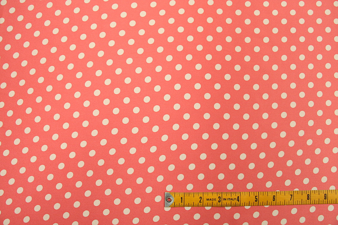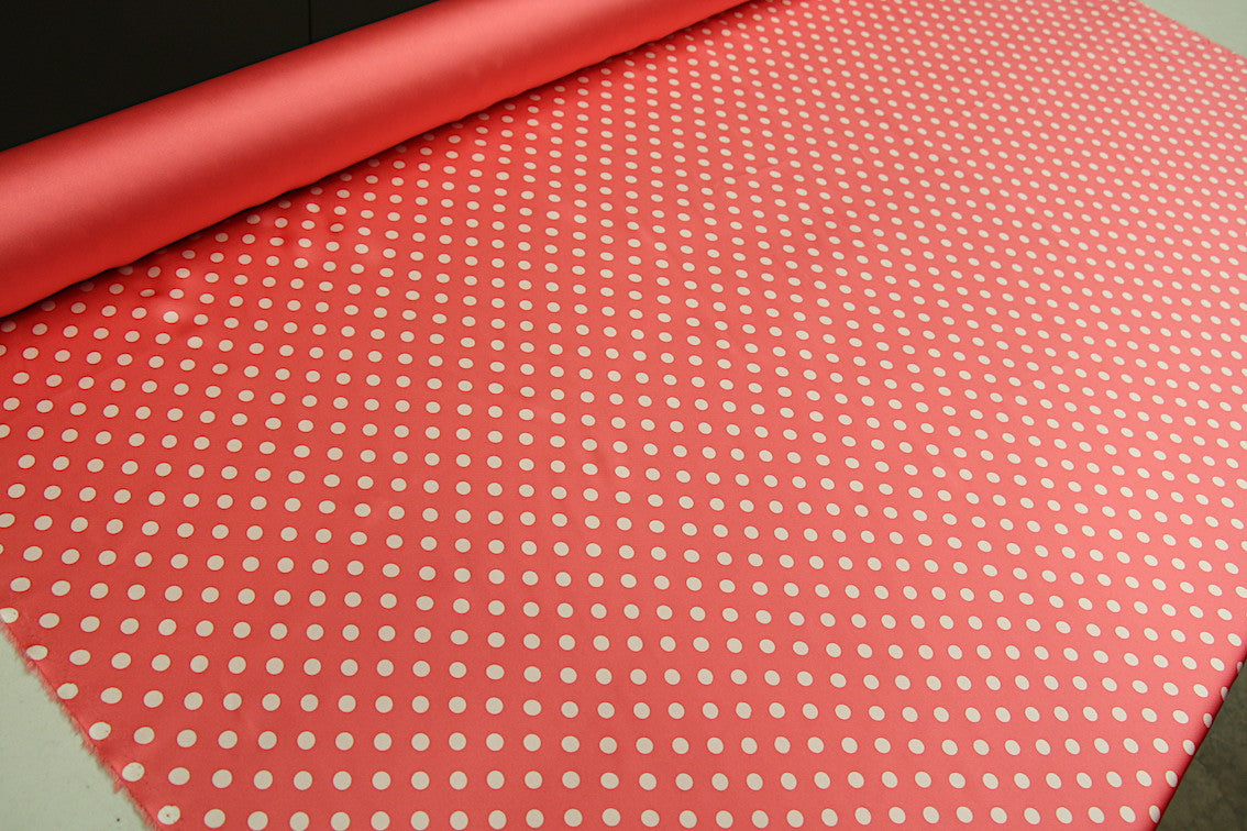 Italian designer coral pink/white medium spot 100% silk double sided crepe satin. Width: 125cm Weight: 210gsm