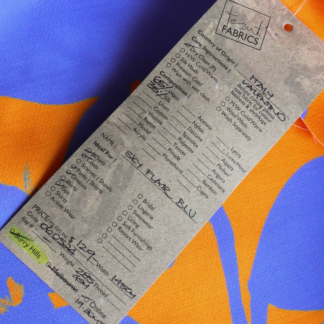 Italian designer bluette/orange 65% wool 35% silk double crepe