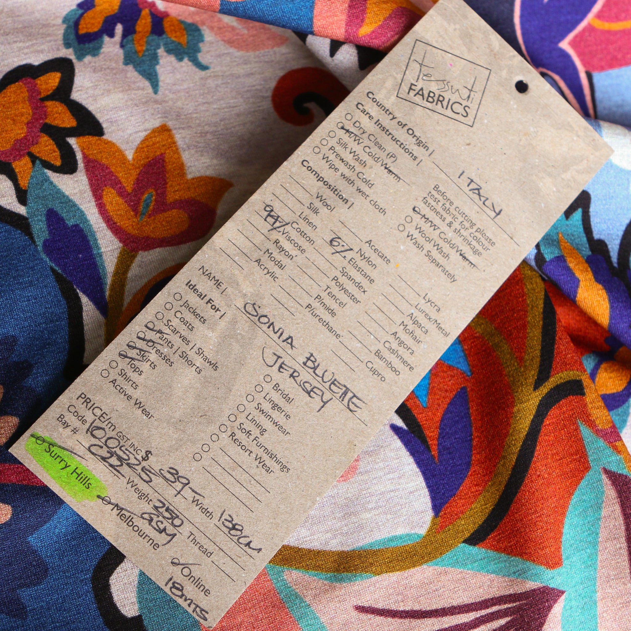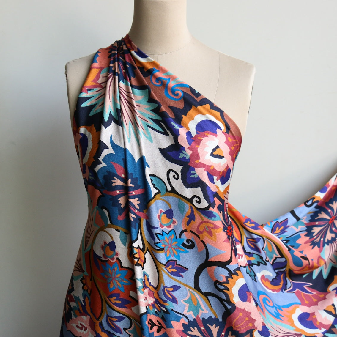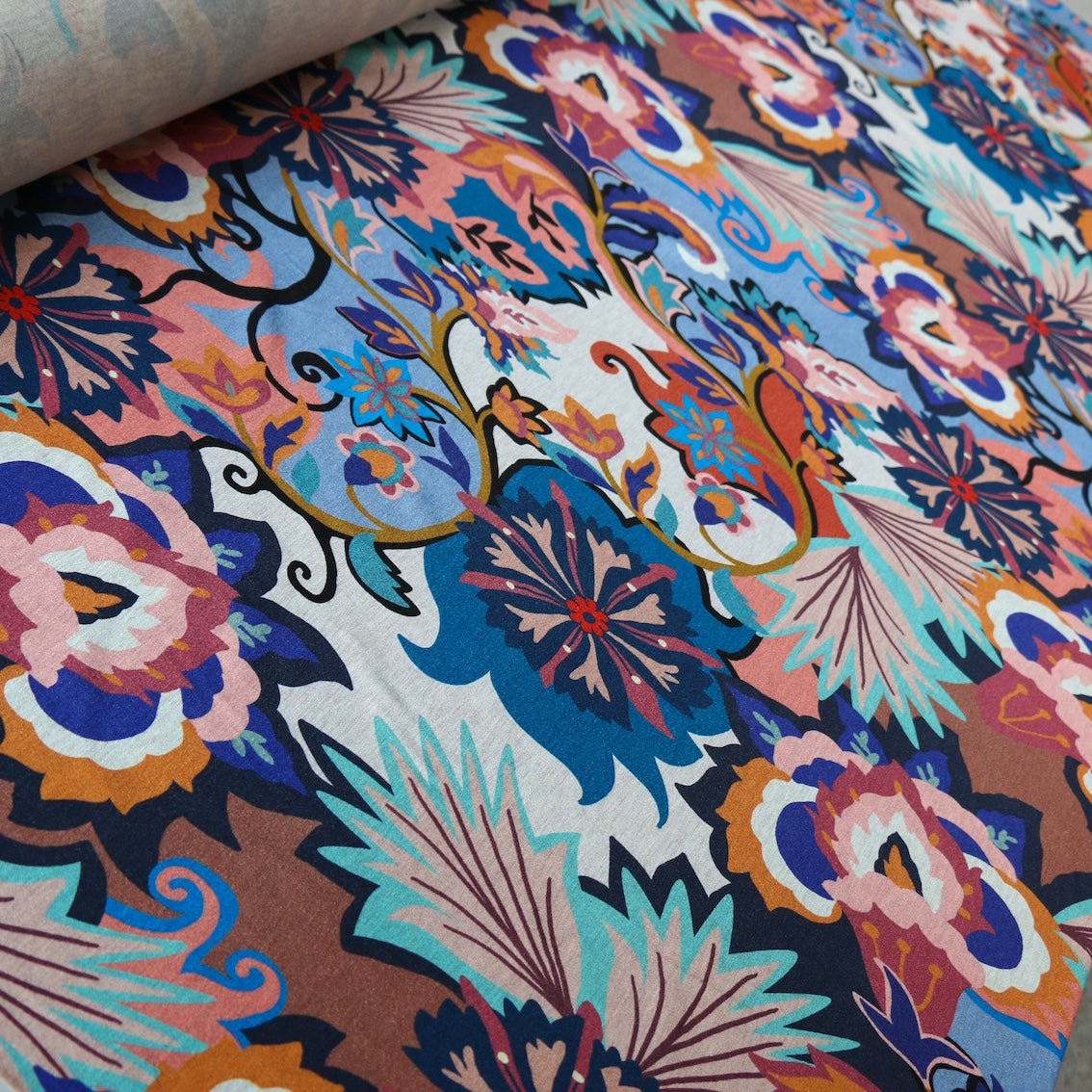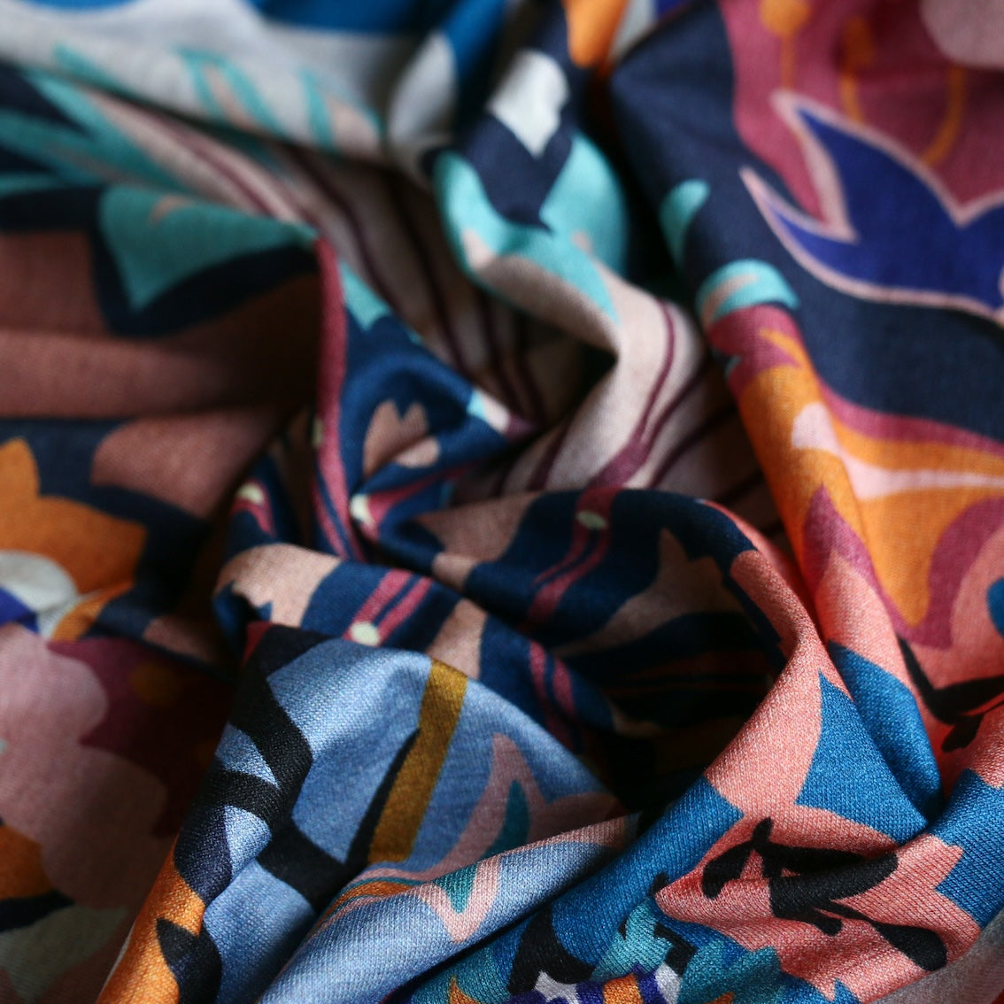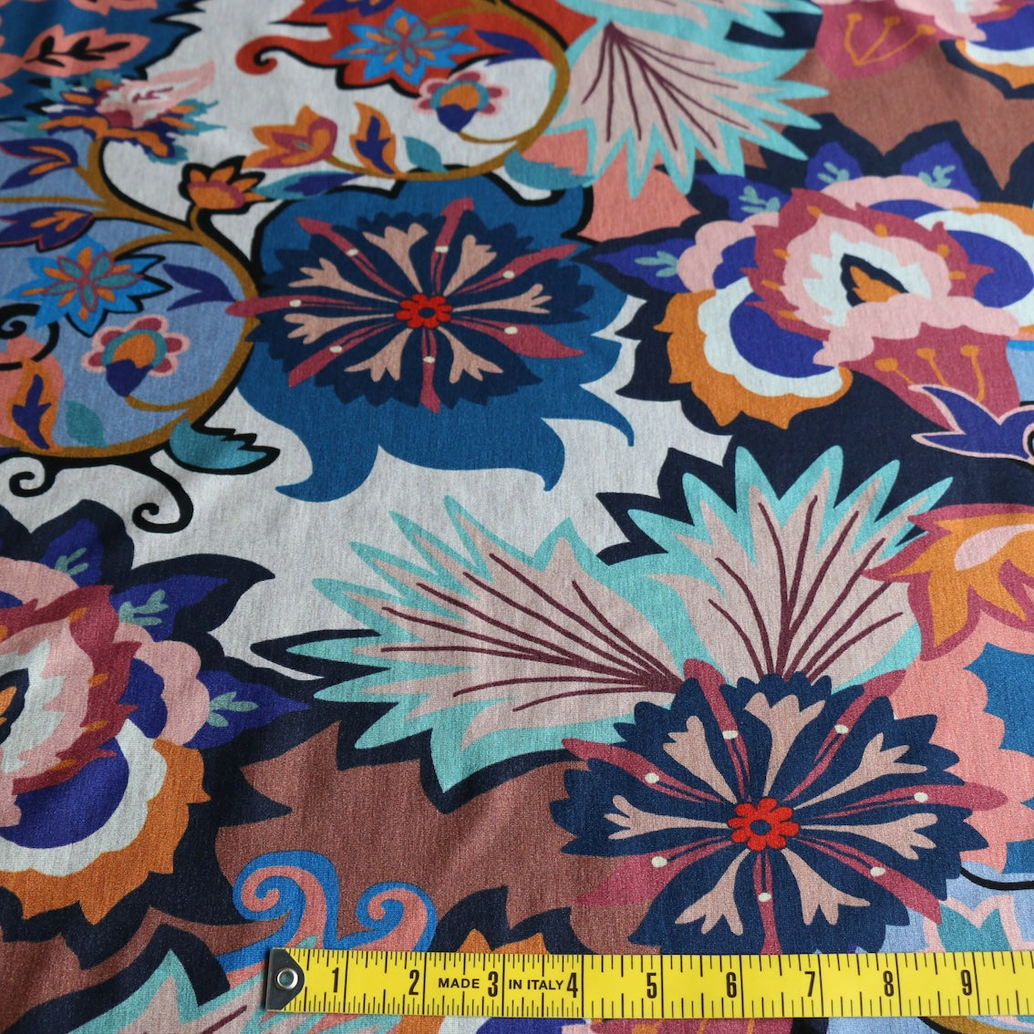Italian navy/rust/aqua/wedgewood blue printed 94% viscose 6% elastane jersey