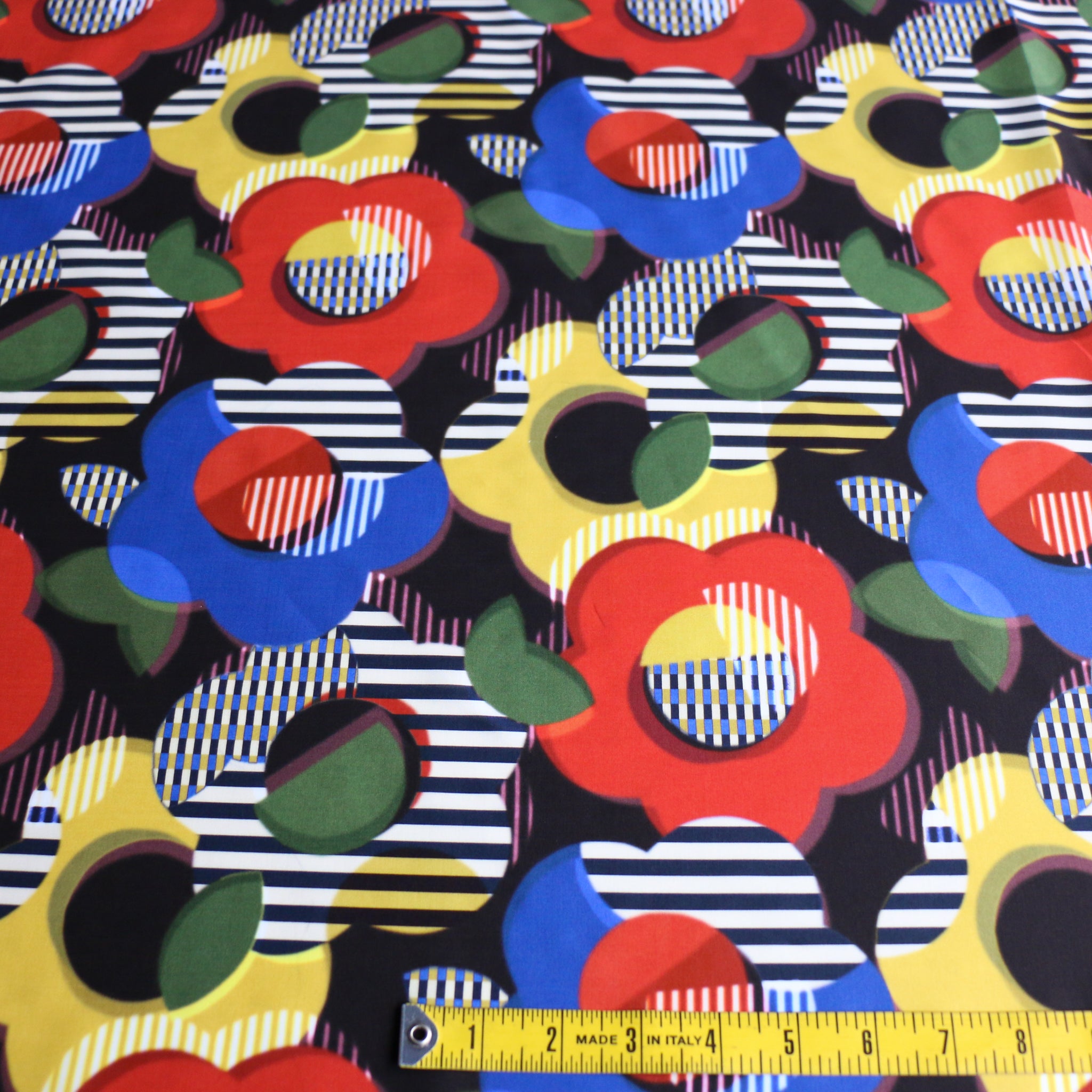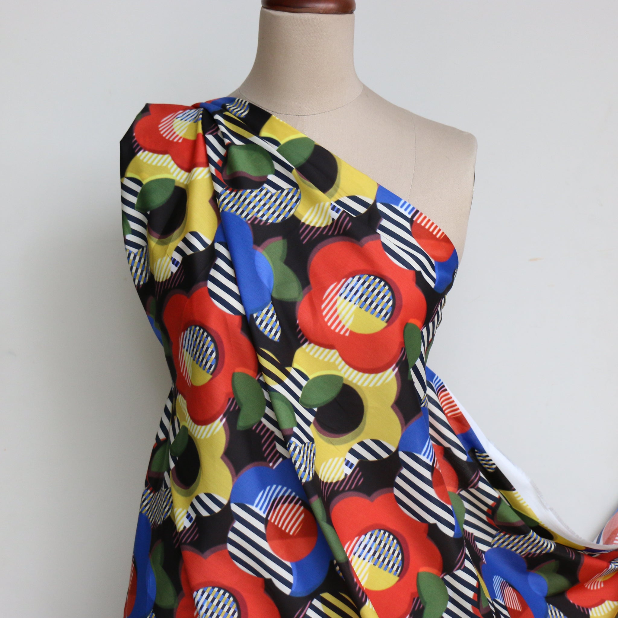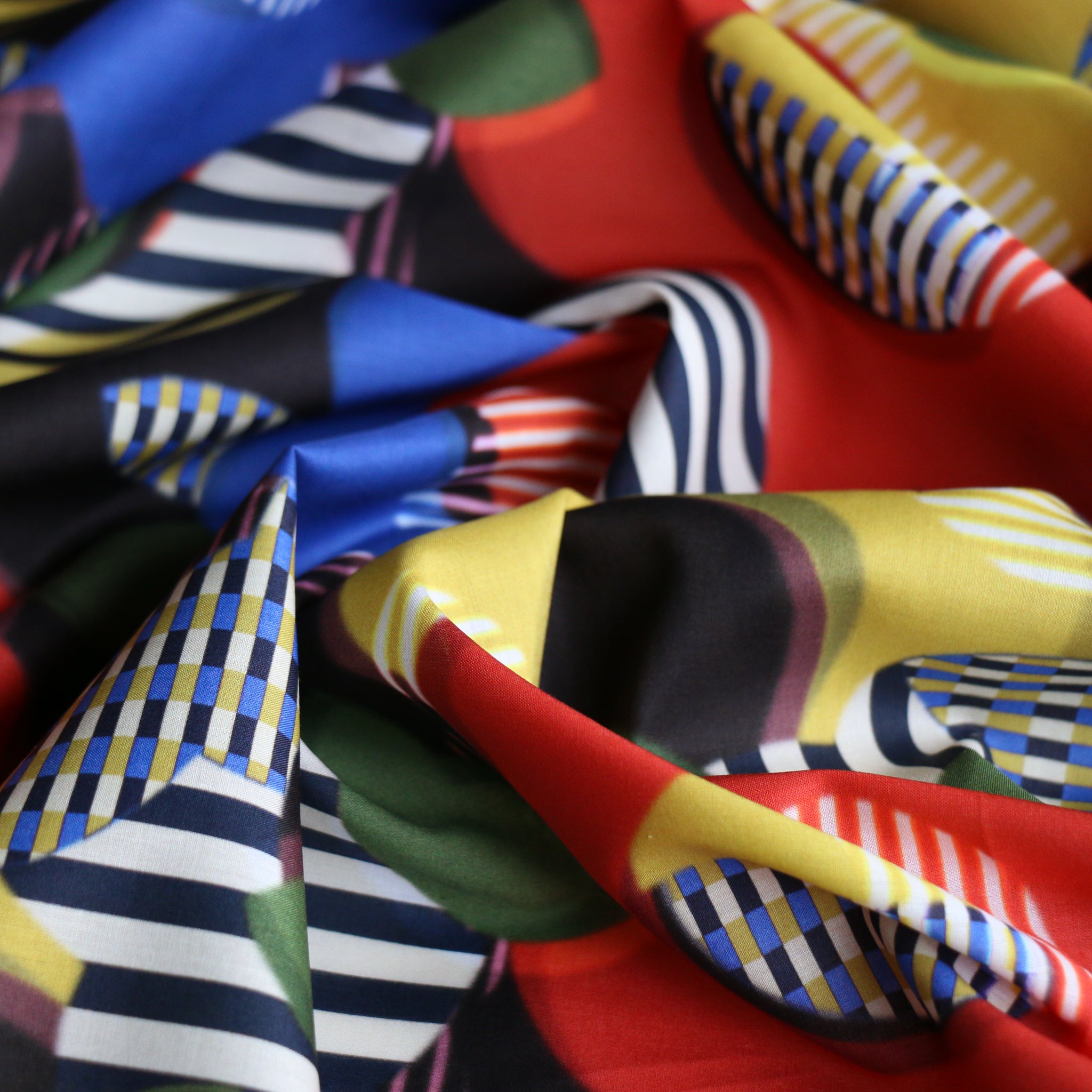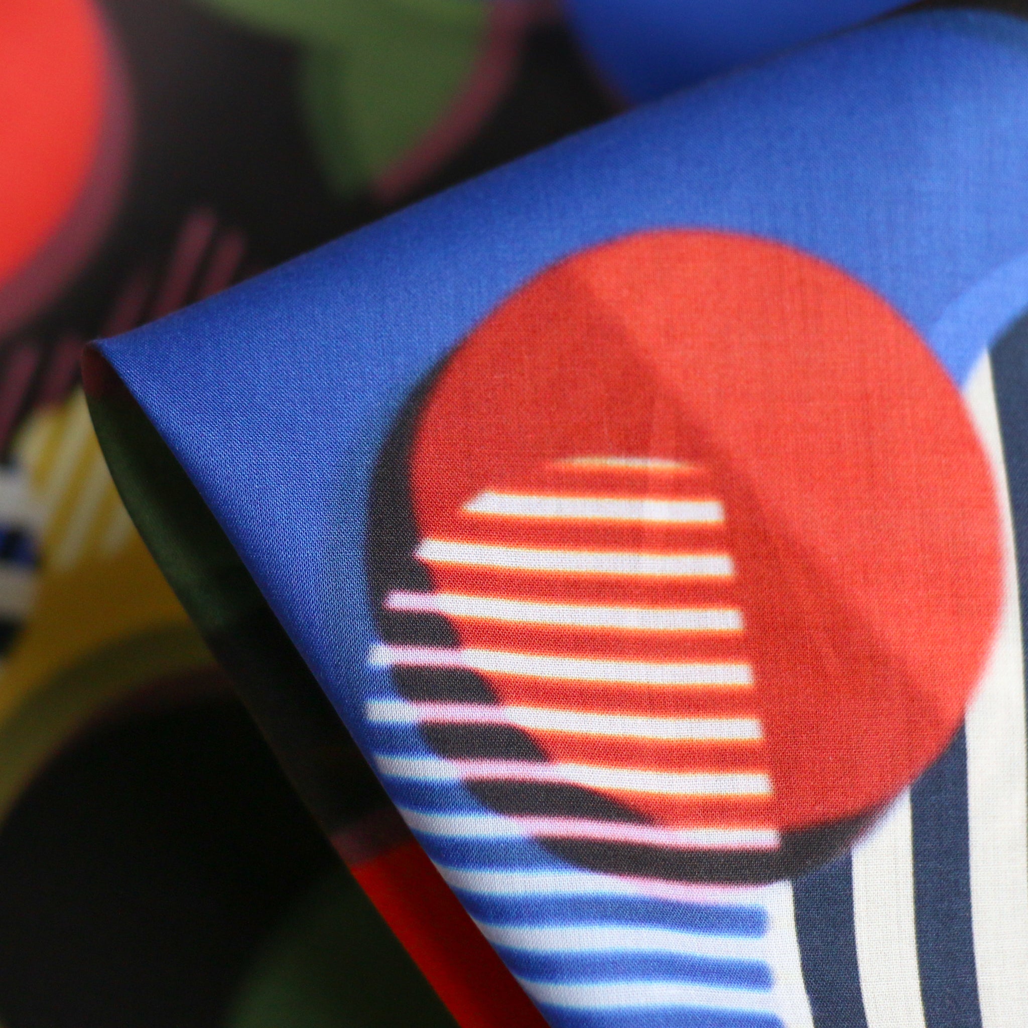 In 1983, Liberty showcased its avant-garde spirit by hosting an exhibition of the radical design group, Memphis Milano. Inspired by the group's hallmarks of playful, sculptural forms and optical, clashing patterns, Memphis Style stands out as a visually arresting design brimming with dazzling vitality. Spherical daisies cast soft overlapping shadows, while graphic cutouts dance amidst contrasting stripes, captivating the eye with a riot of illusory geometries.