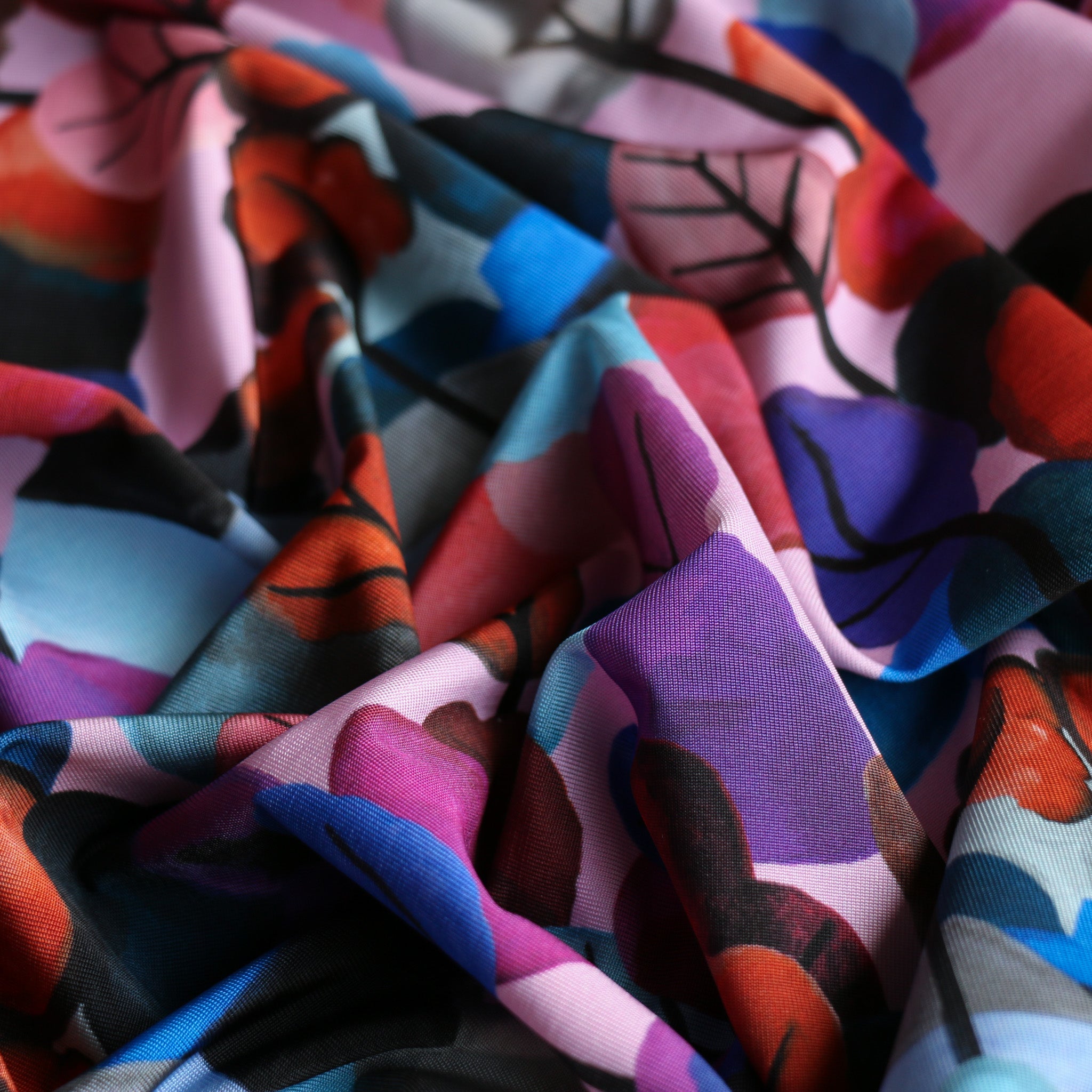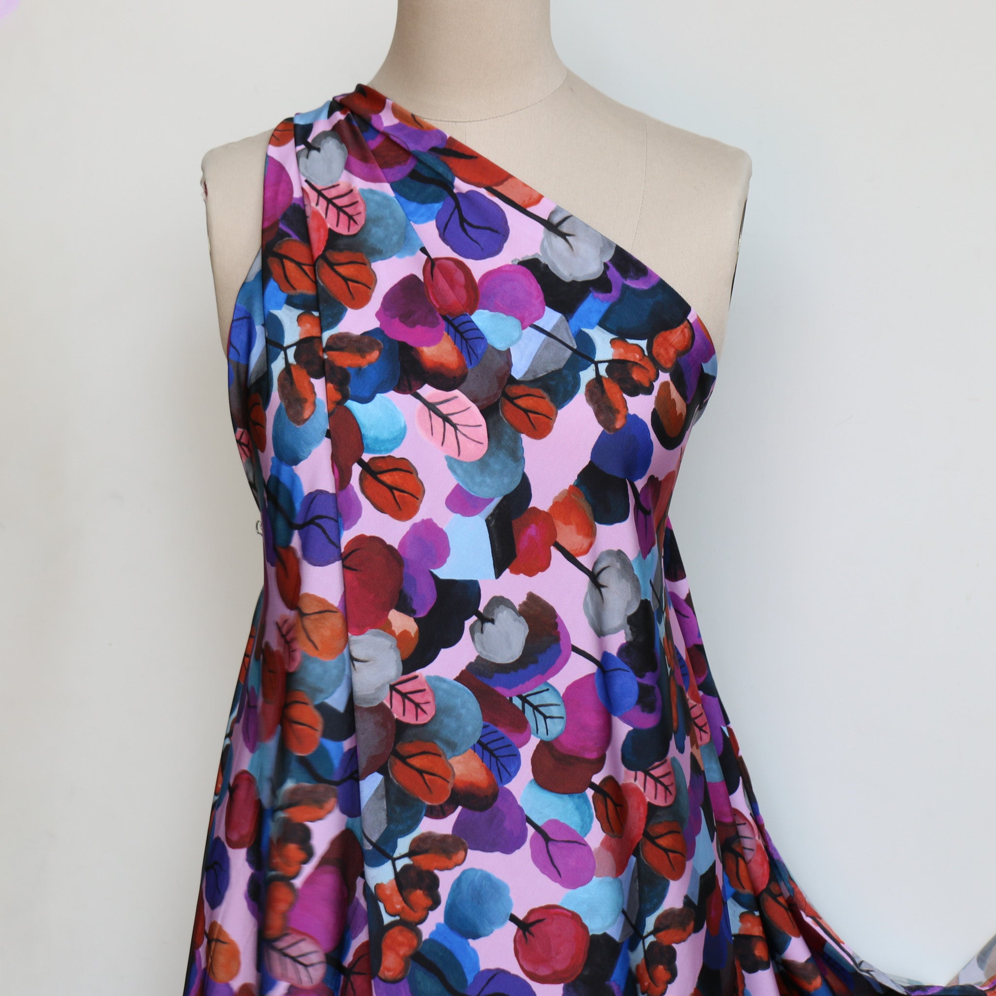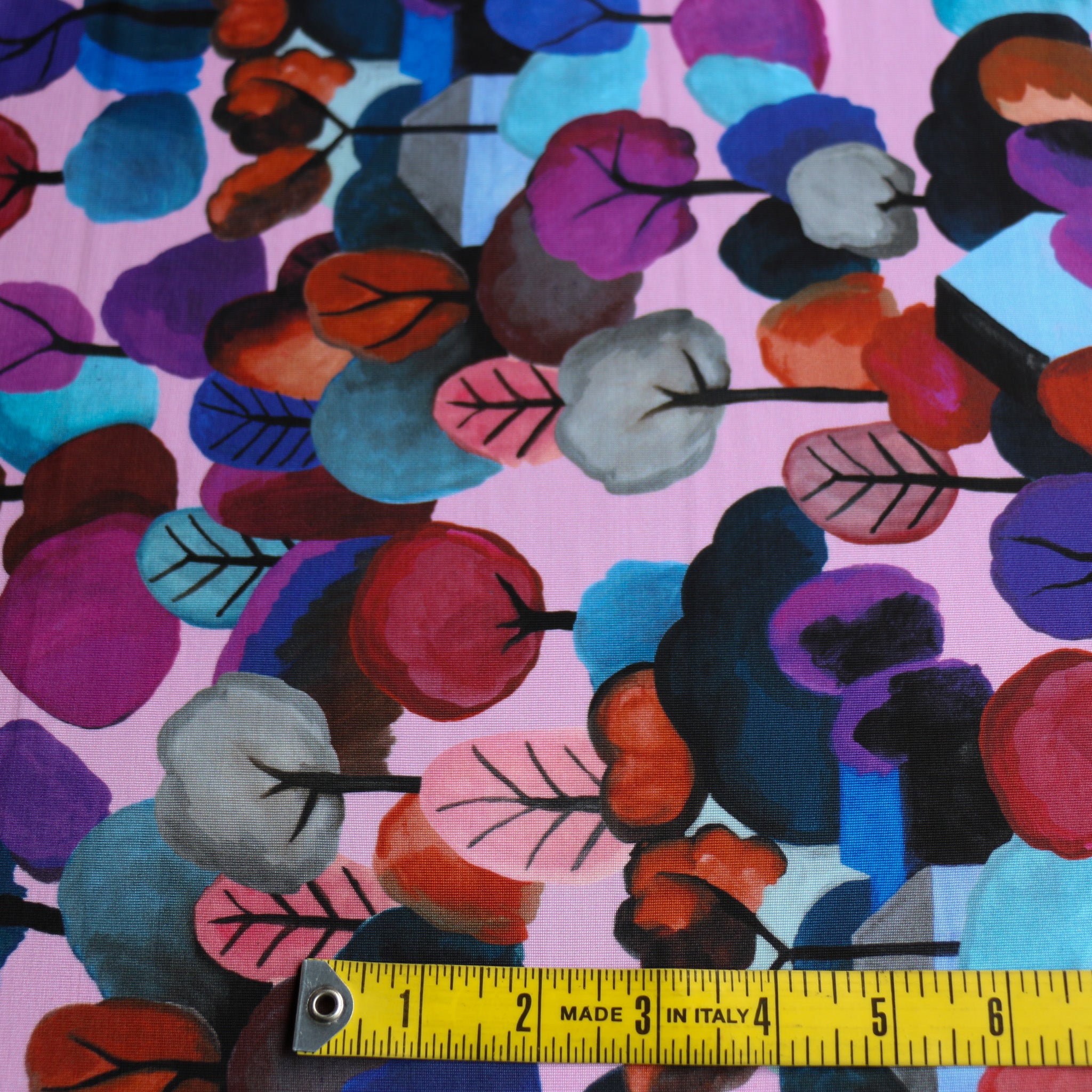 Italian plum/wedgewood blue/lavender printed trees 94% viscose 6% elastane slinky jersey