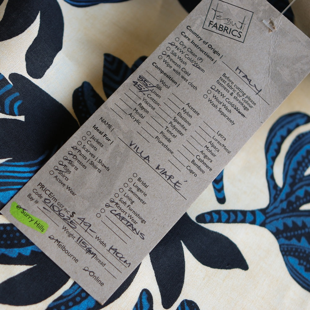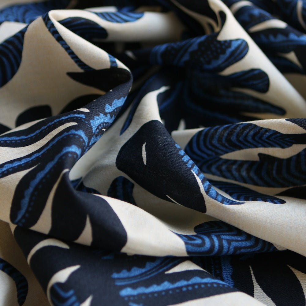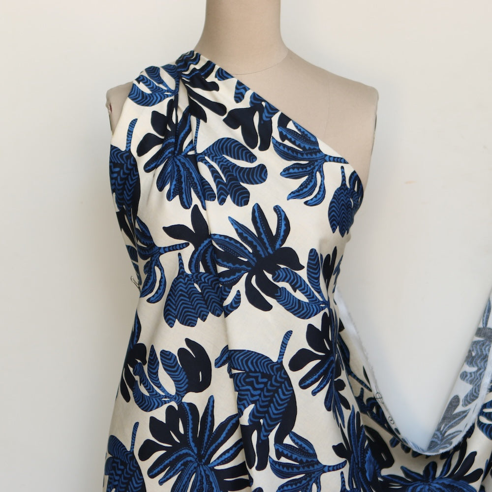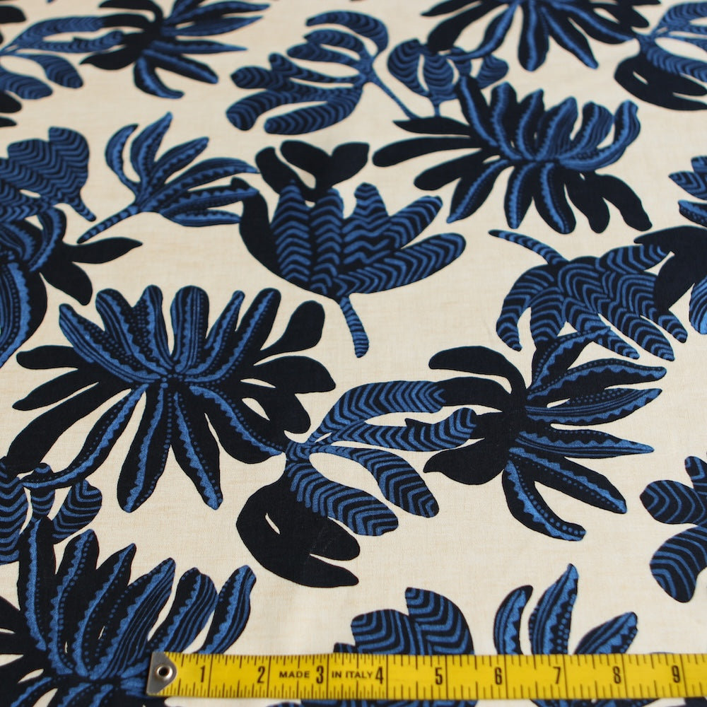 Italian blue/black floral on cream printed 55% linen 45% cotton