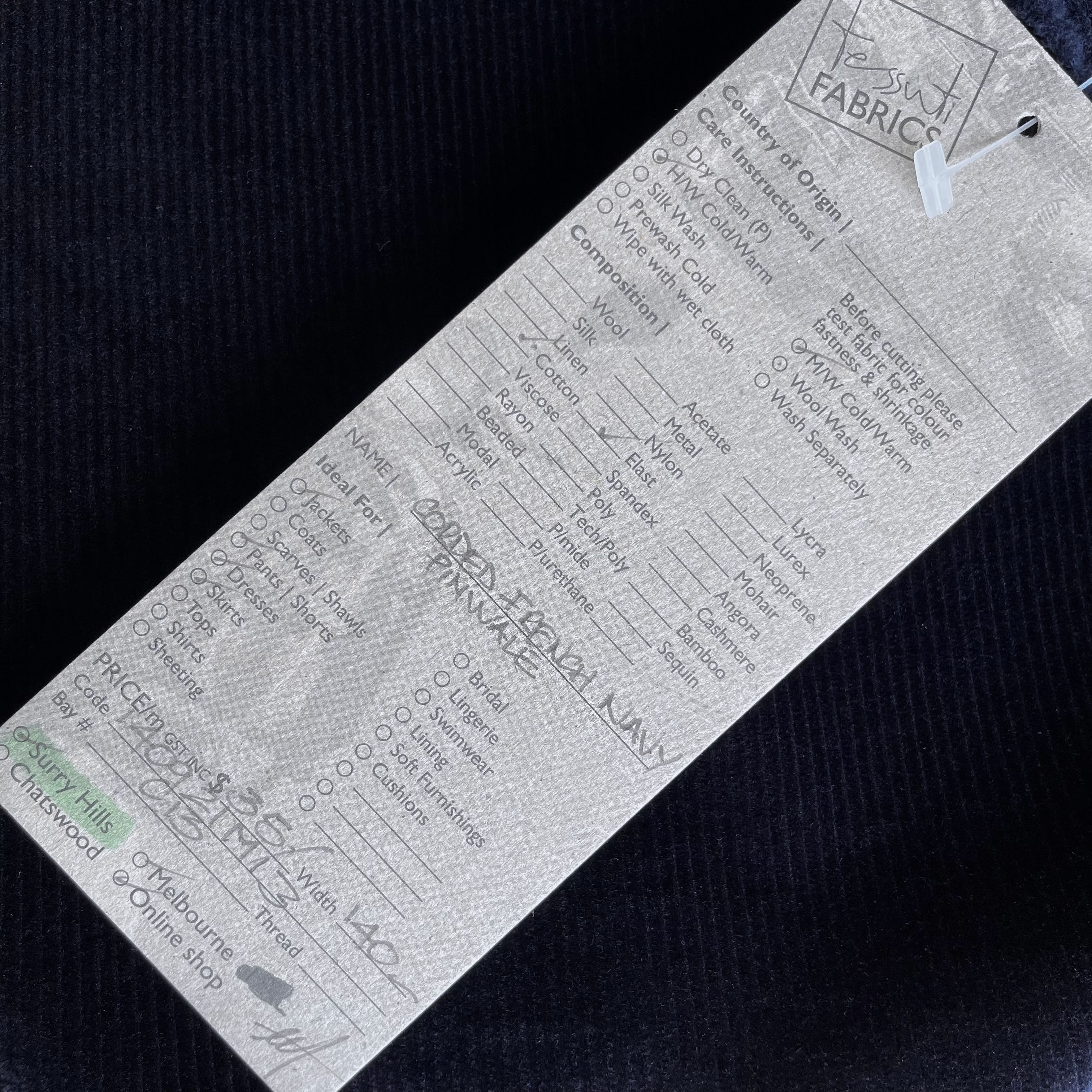 French navy 98% cotton 2% elastane stretch 11 pinwale corduroy
