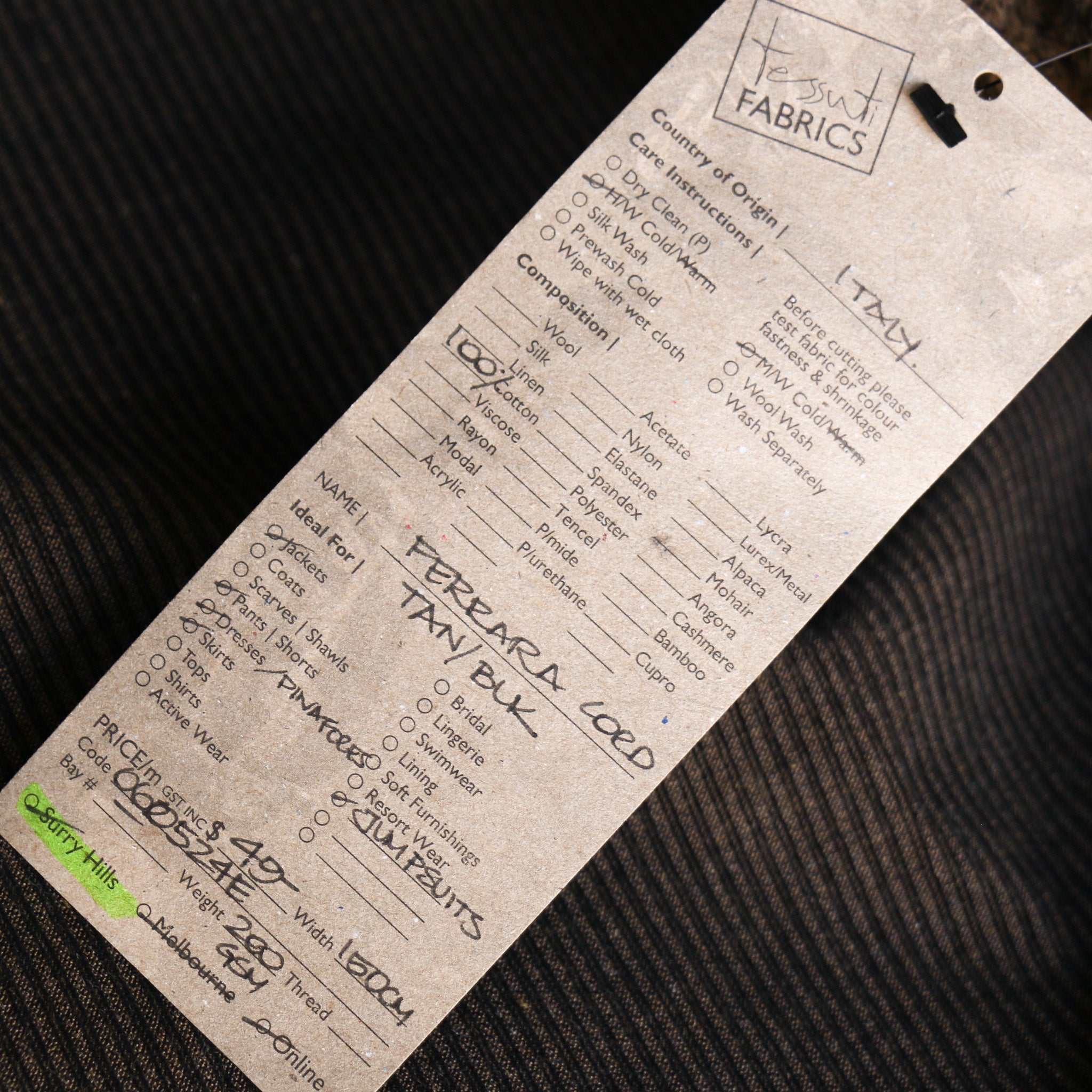 Italian black/tan 100% cotton corduroy