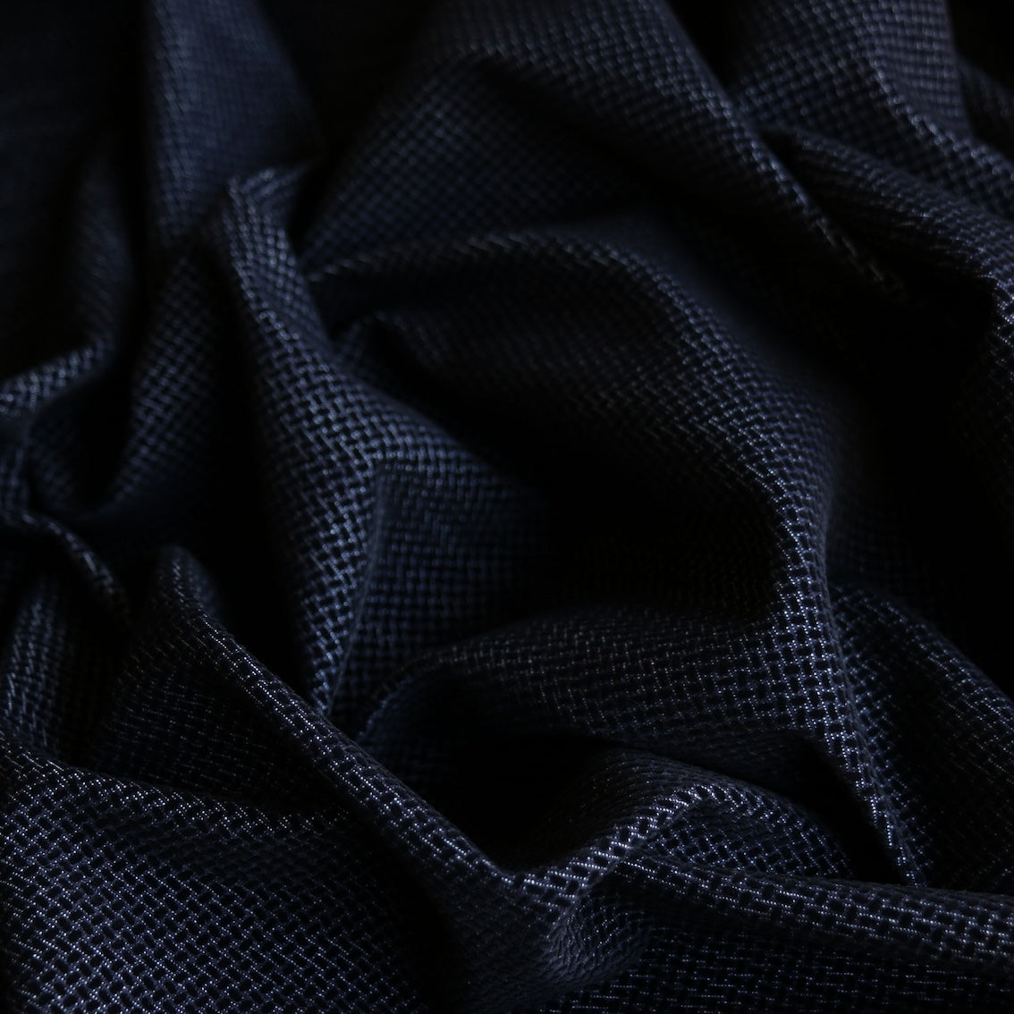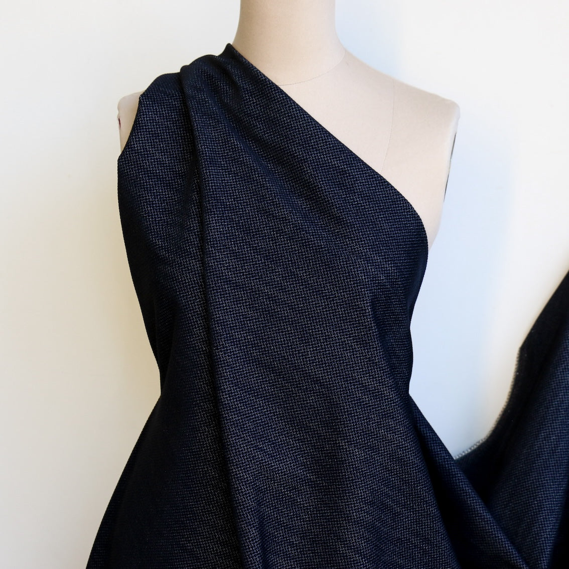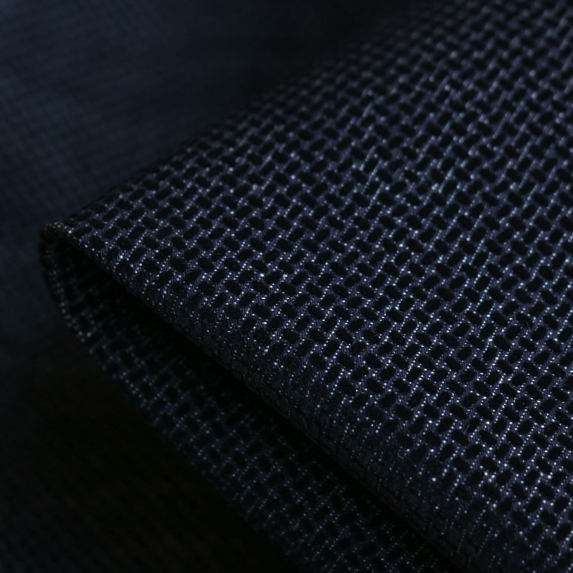 Designer Italian navy denim with flocked black basketweave 98% cotton 2% elastane stretch woven