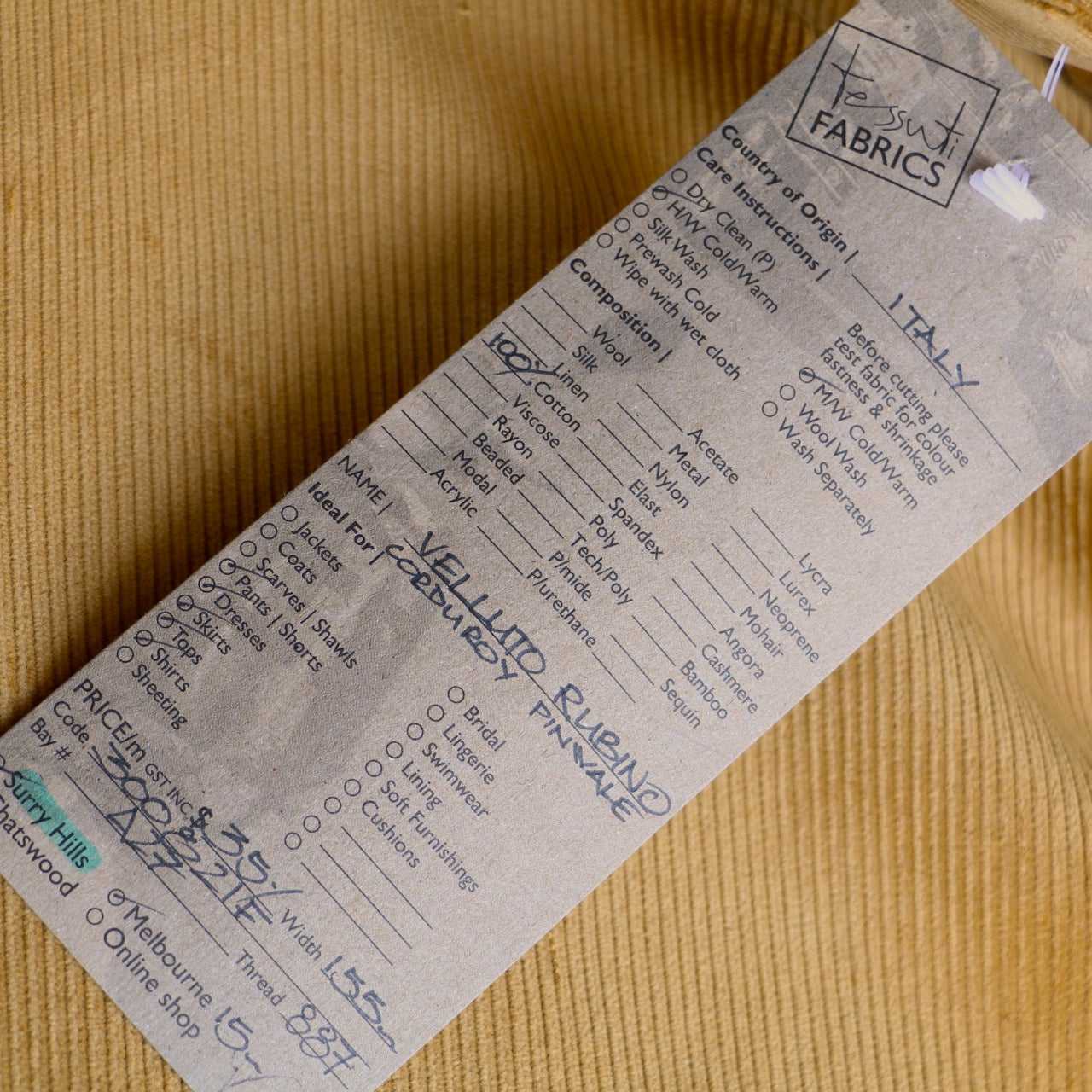 Italian designer camel 100% cotton 11 pinwale corduroy.