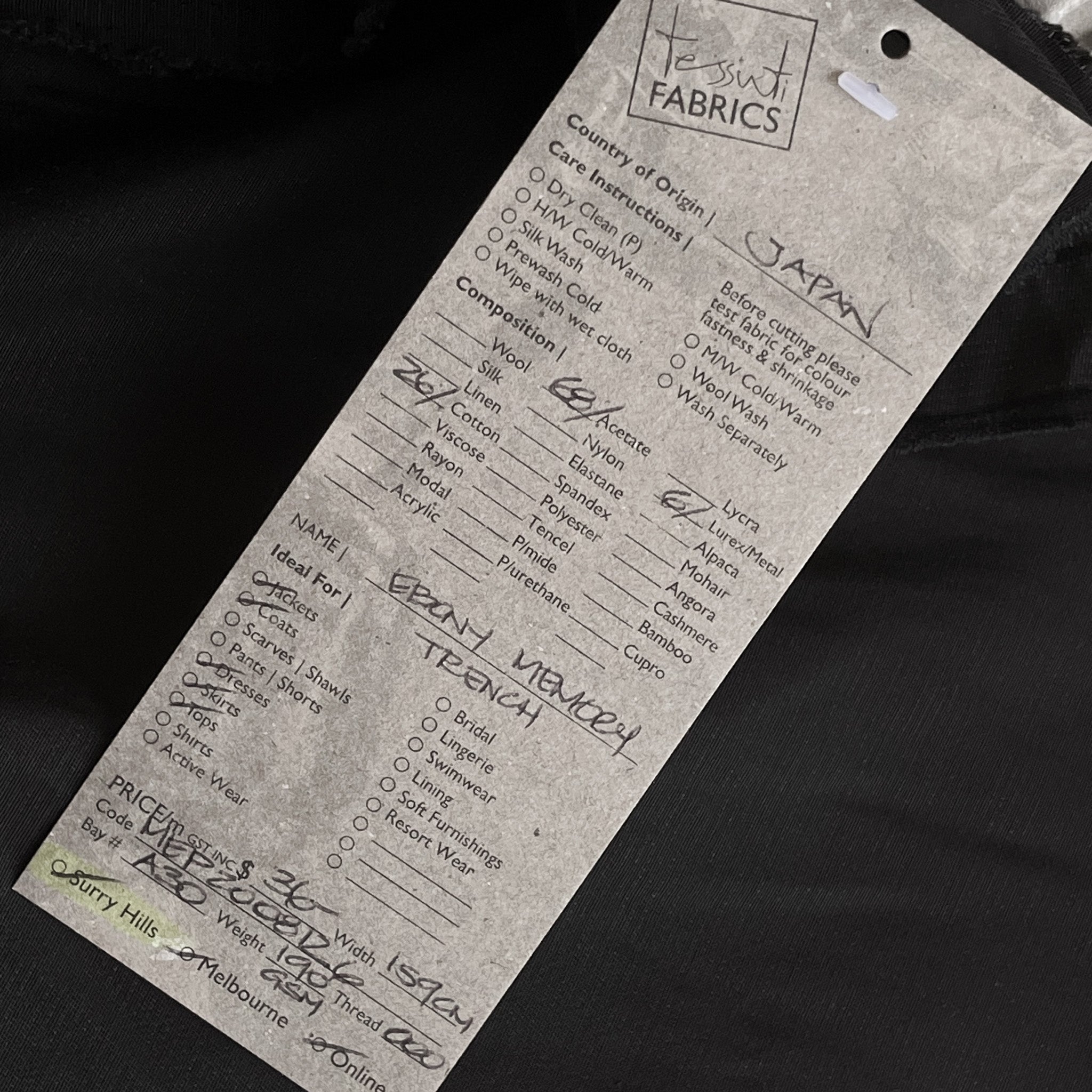 Japanese black 68% acetate 26% cotton 6% metal