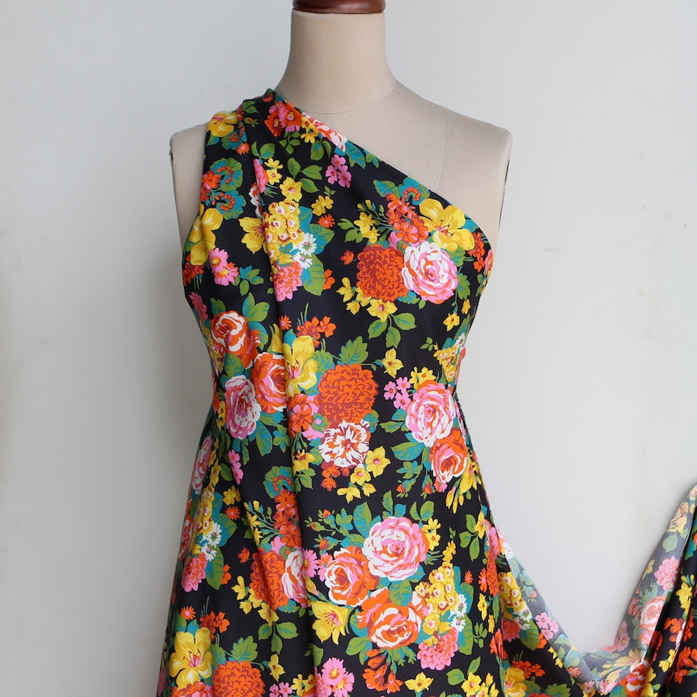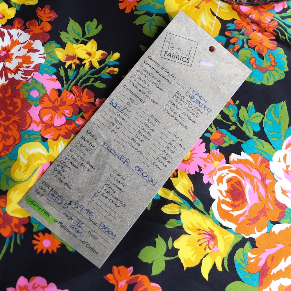 Originally hand-painted in 1990 and printed for Liberty's seasonal collections in 1992 and 1995, Flower Crown has been reimagined for the 21st century. Inspired by the legendary artist, Frida Kahlo, this design celebrates the vibrant floral crowns she often wore in her self-portraits. These remarkable bouquets showcase roses, daisies, geraniums and lilies among many other flowers.