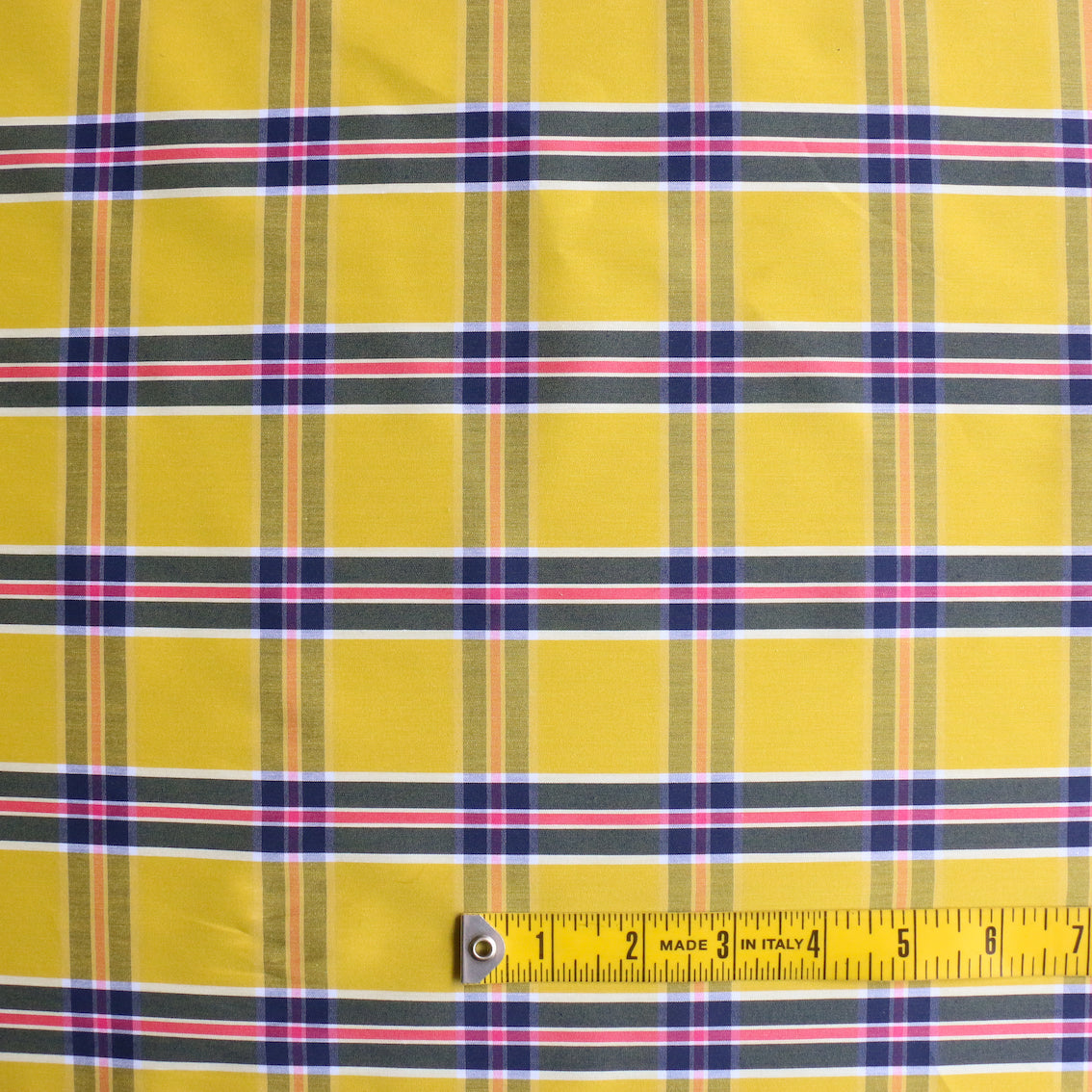 Designer Italian yellow/navy/red checked stretch 98% cotton 2% elastane shirting