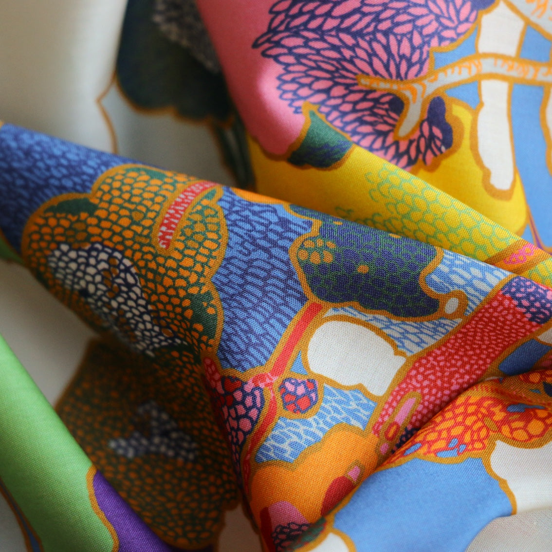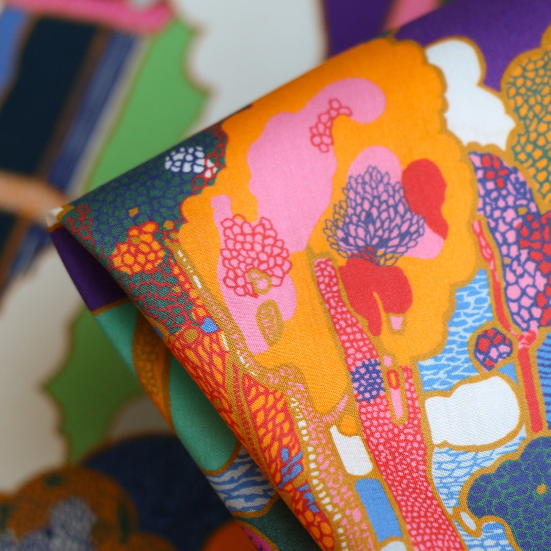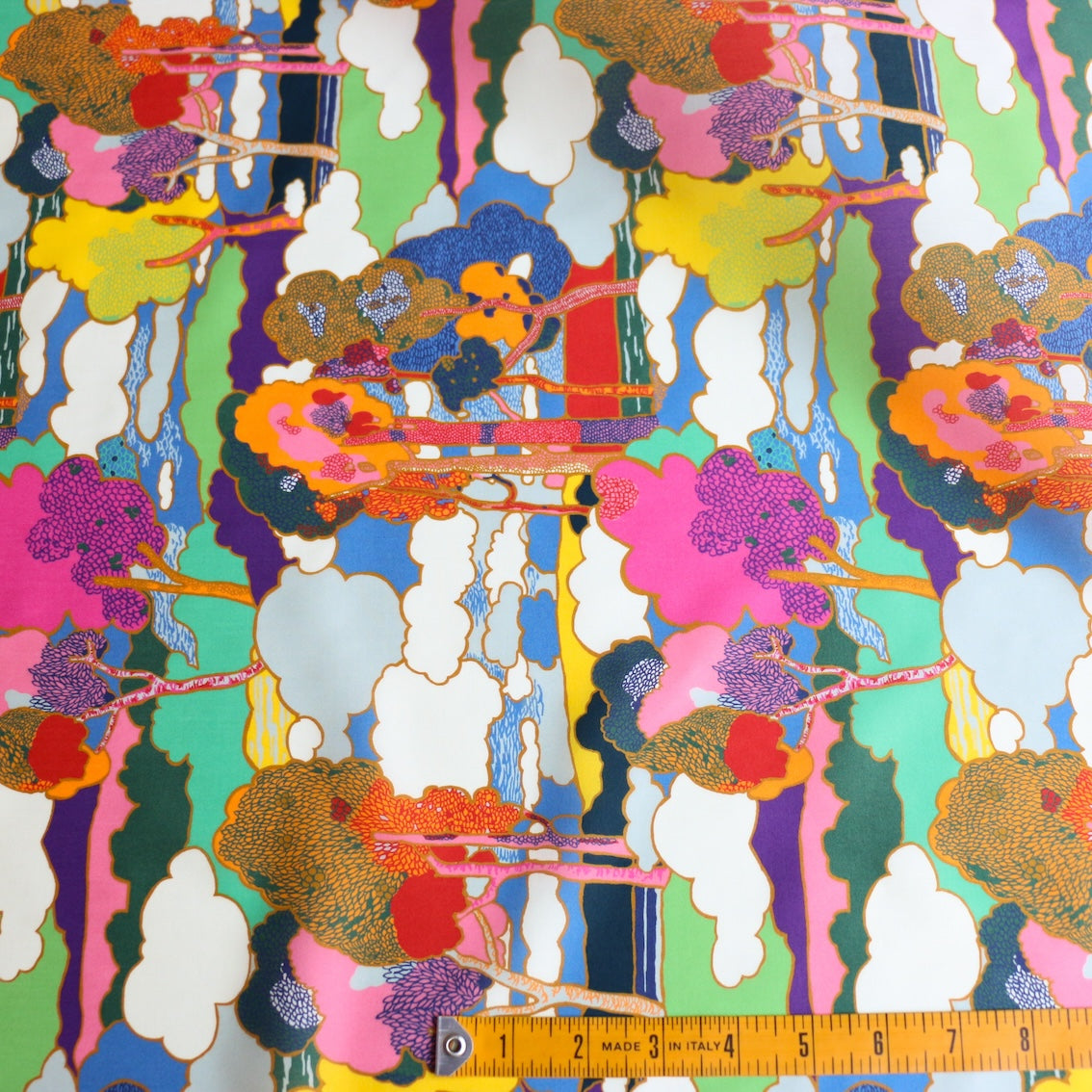 Prospect Road is an archival classic, based on a Liberty design from 1968. A revival of traditional Art Nouveau landscape prints, it features subtly arranged clusters of trees in a dreamy, jewel-toned setting