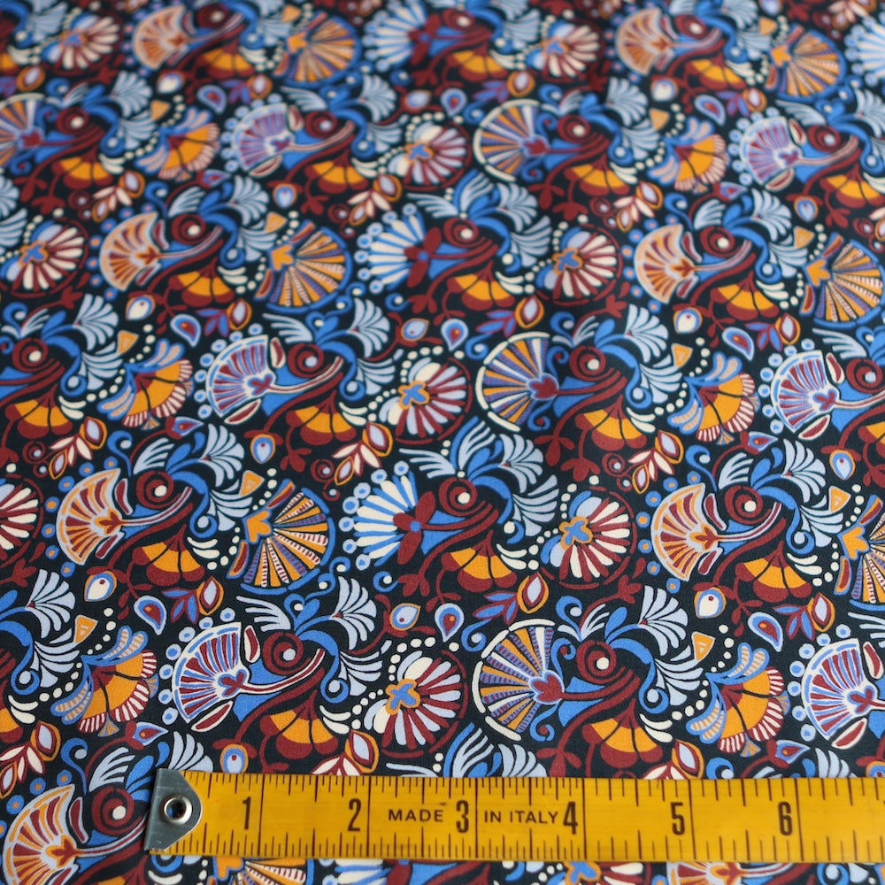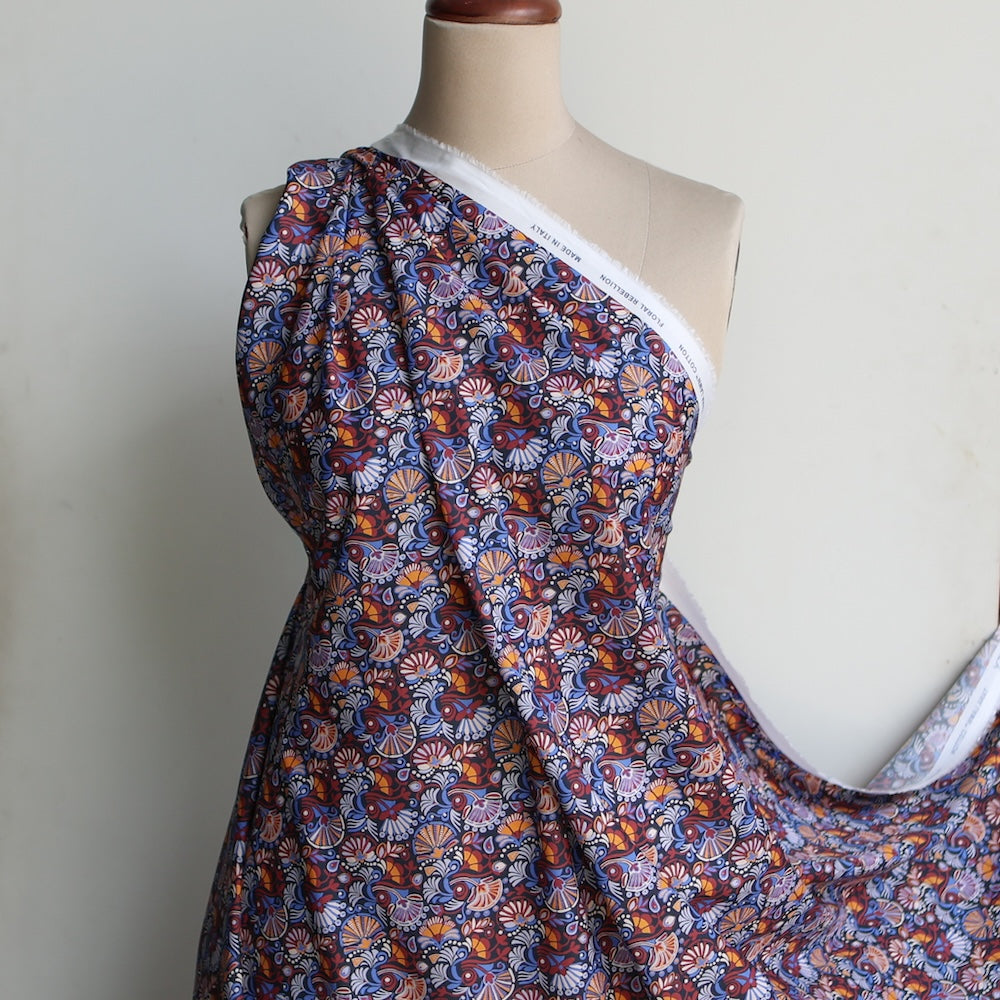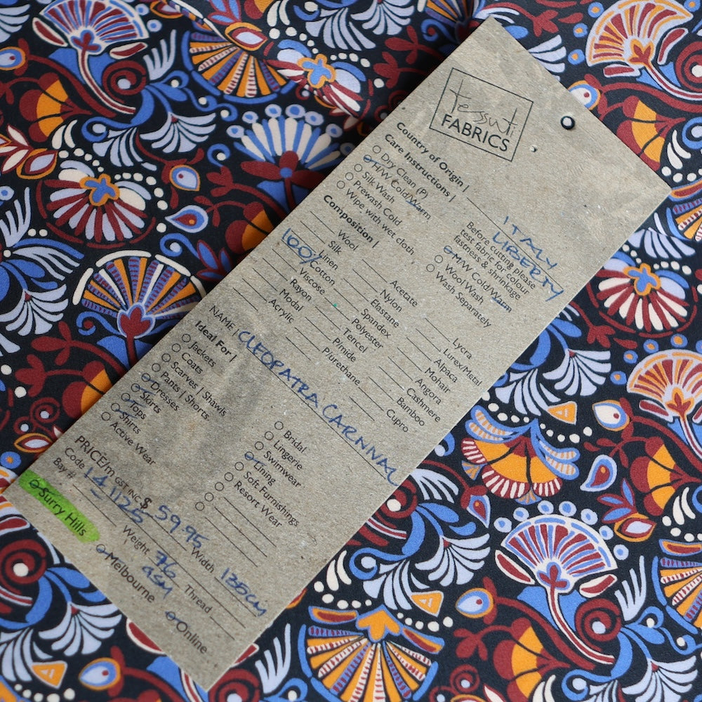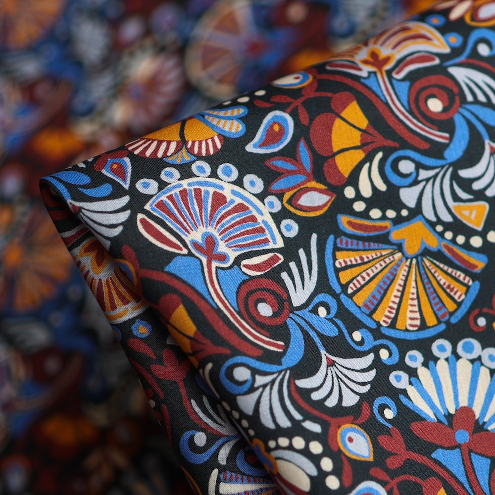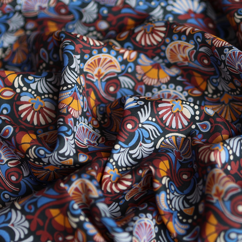 Inspired by the rich history and opulent legacy of Cleopatra, the famous Egyptian queen, Cleopatra Carnival is a captivating print that blends stylised florals with fan-shaped motifs reminiscent of ancient Egyptian art. Hand-painted in the Liberty design studio, this expressive pattern is a vibrant celebration of culture and femininity.