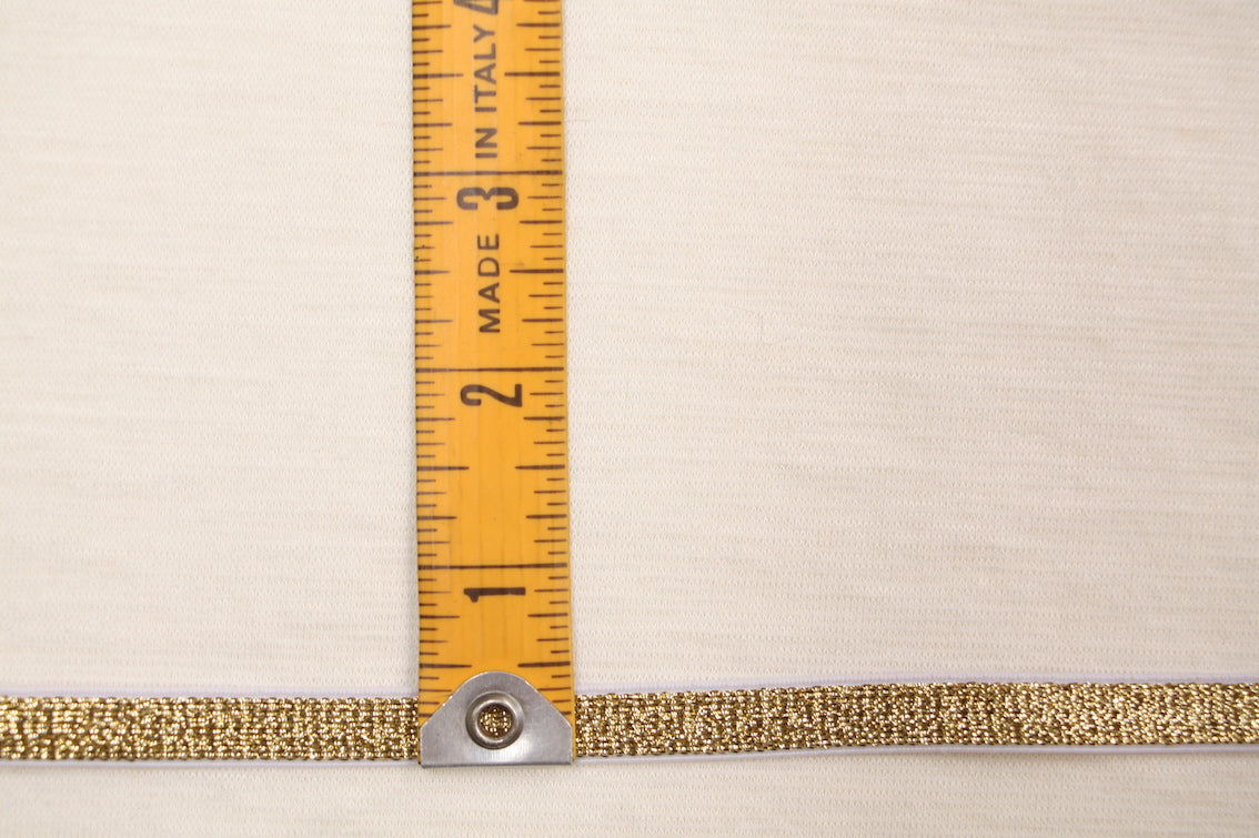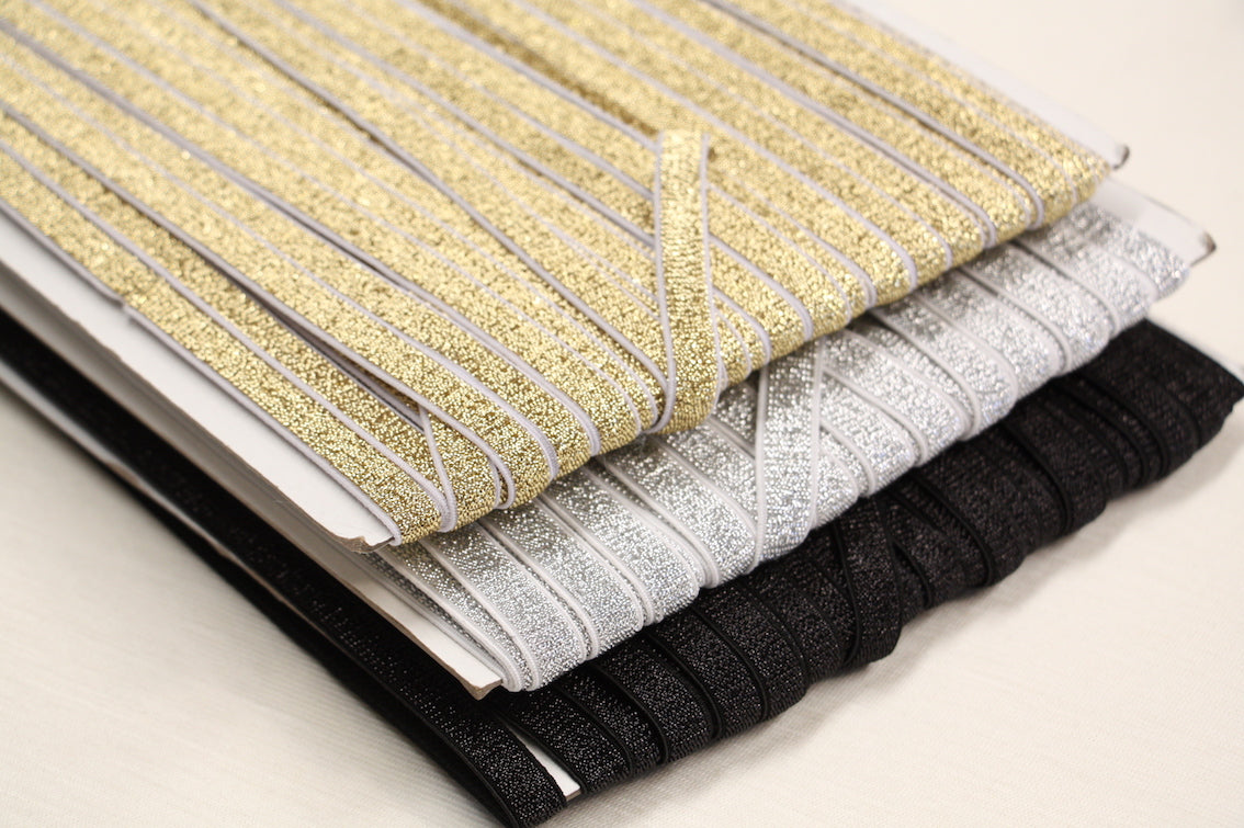 This trim is perfect for stretch straps on tops or dresses. Available in Metallic Black, Gold and Silver.