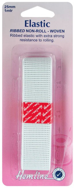 Hemline Non Roll Ribbed Elastic White 25mm x 1 mtr