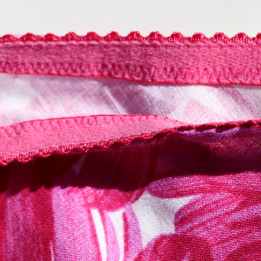 This trim is perfect for waistline of skirts or can be inserted into a seam. When inserted, shows a small, delicate scalloped edge. Note: This elastic can be dyed with iDye Poly Dyes (see image of elastic dyed pink to match fabric)