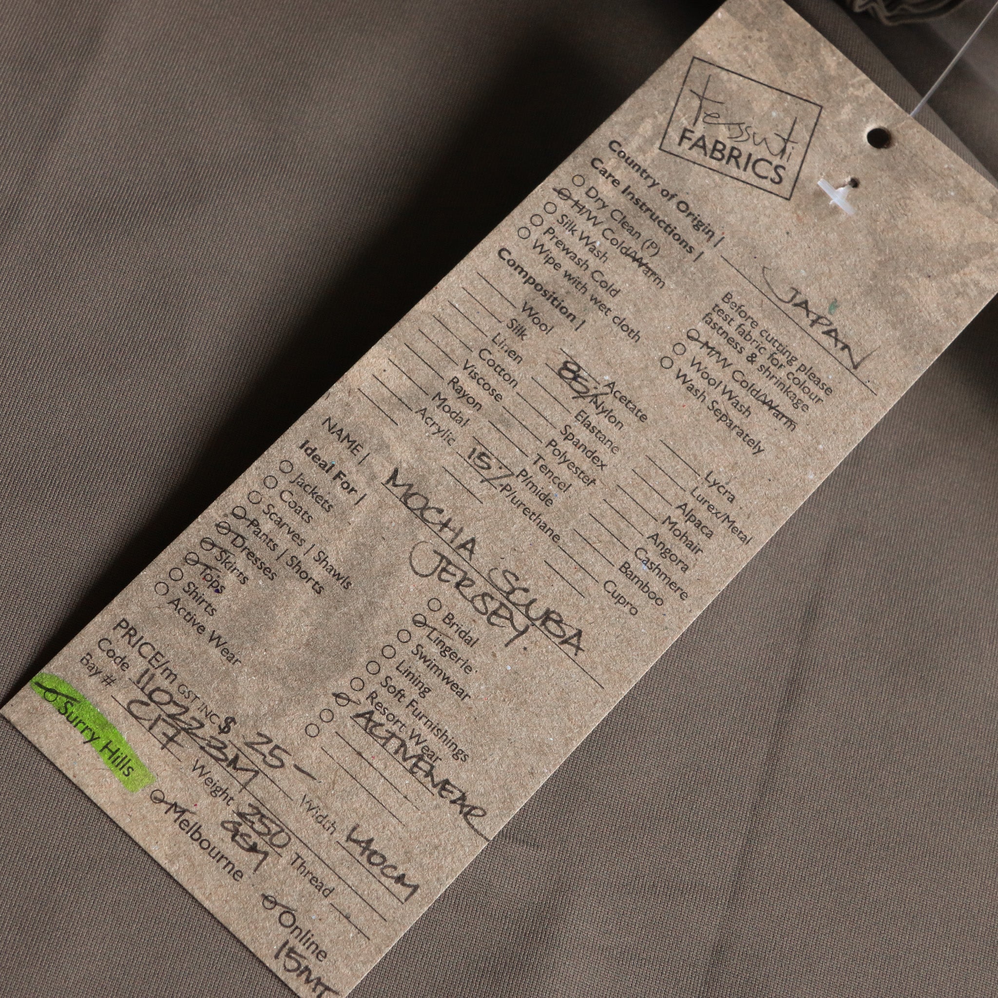 Japanese mocha 85% nylon 15% polyurethane firm stretch scuba with four way stretch
