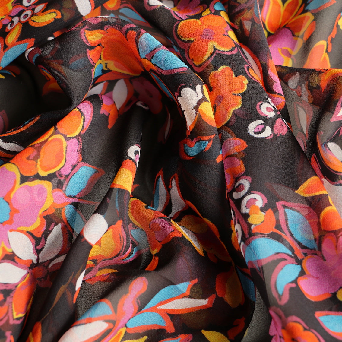 Italian designer black/orange/pink/aqua floral printed 100% silk georgette