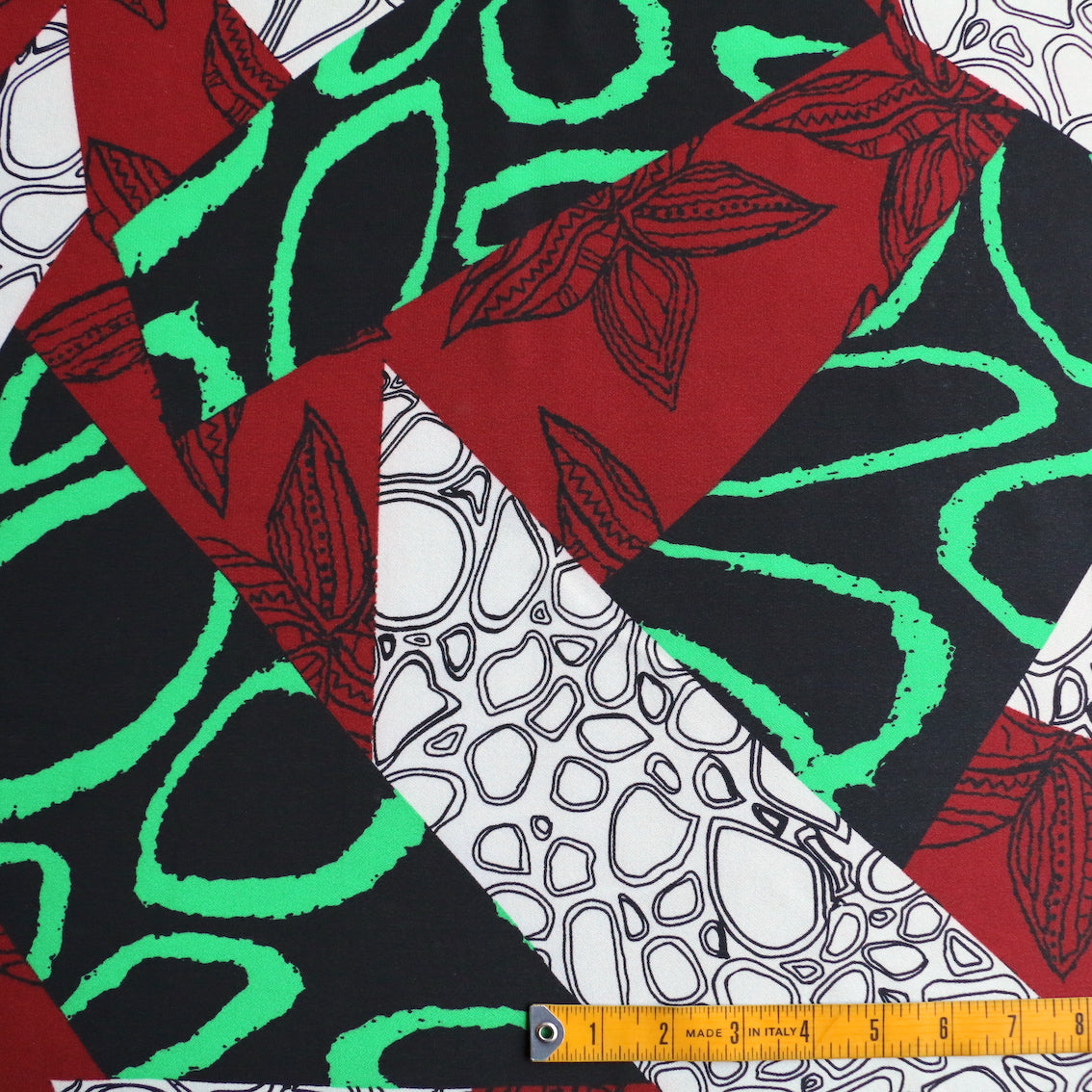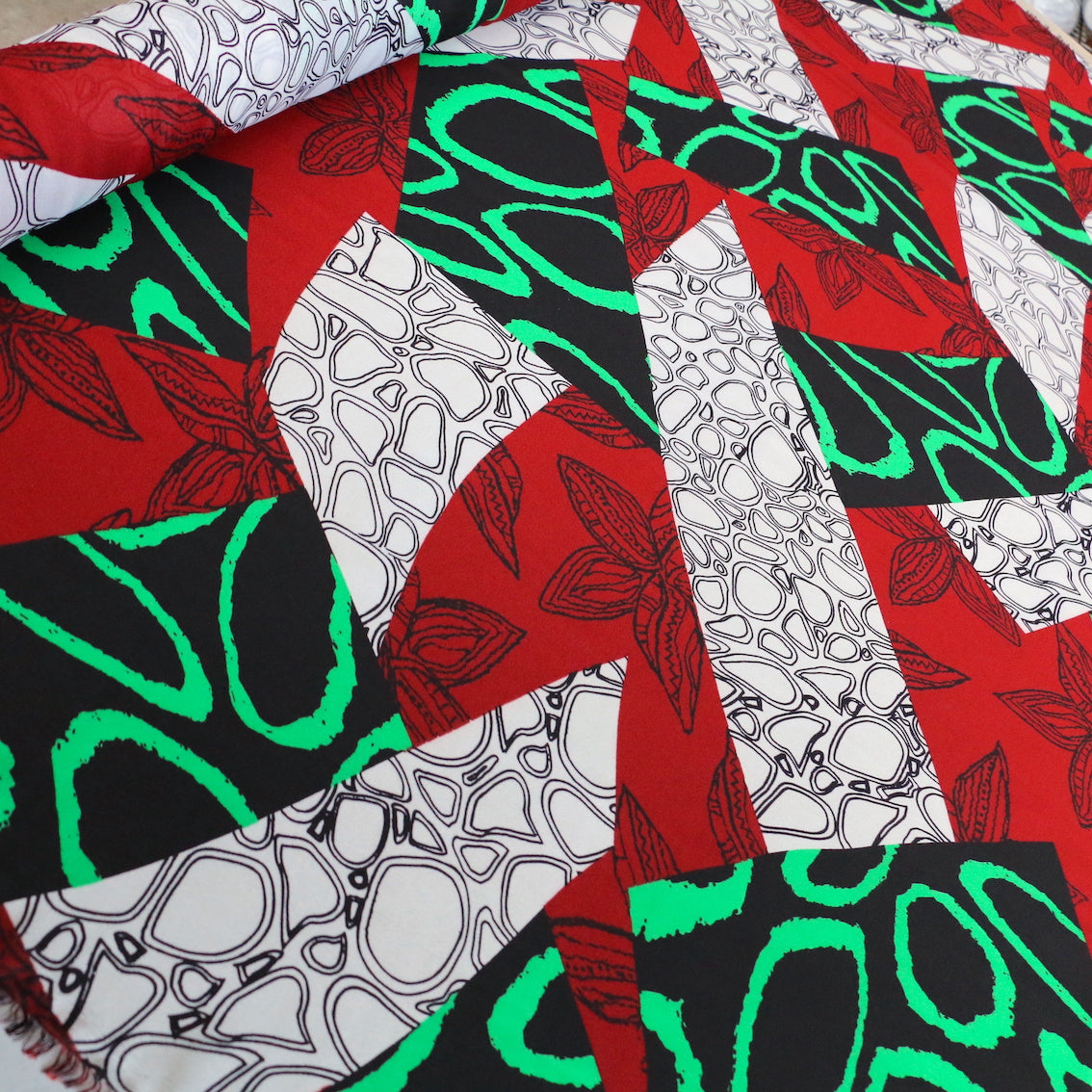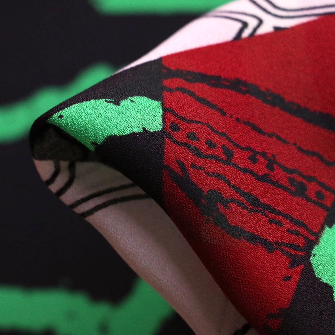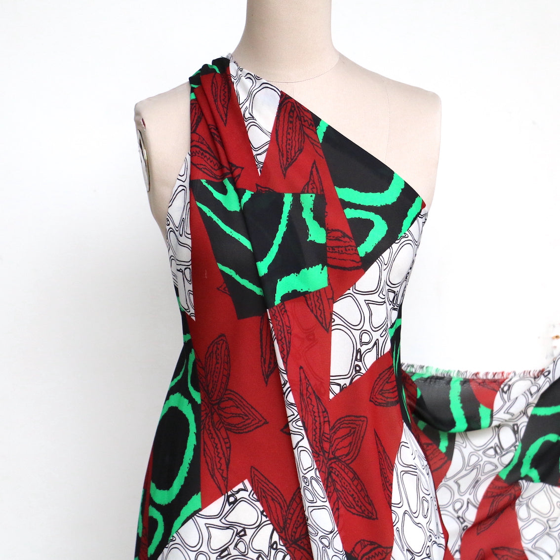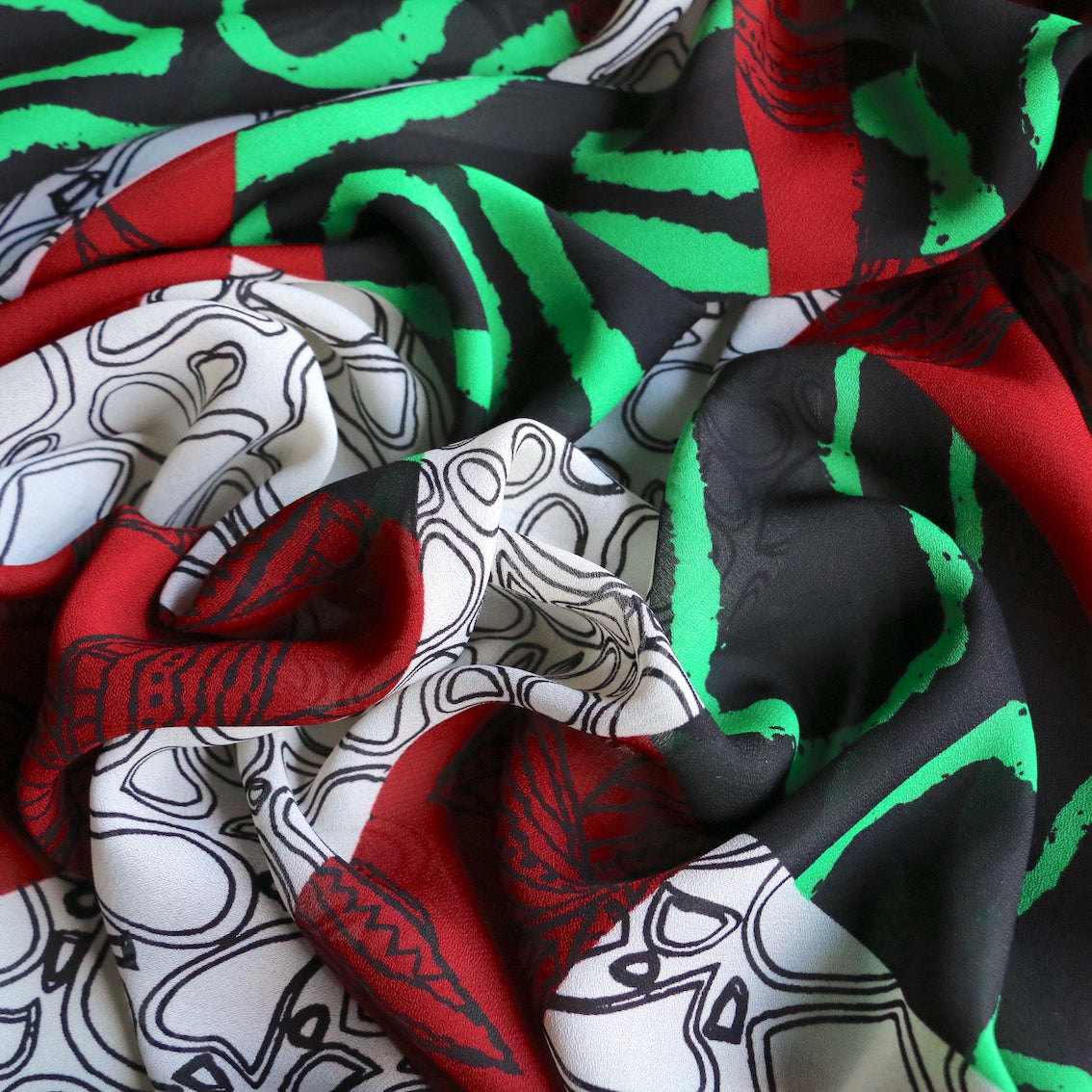 Abstract dark red/green/black/white printed 100% polyester georgette
