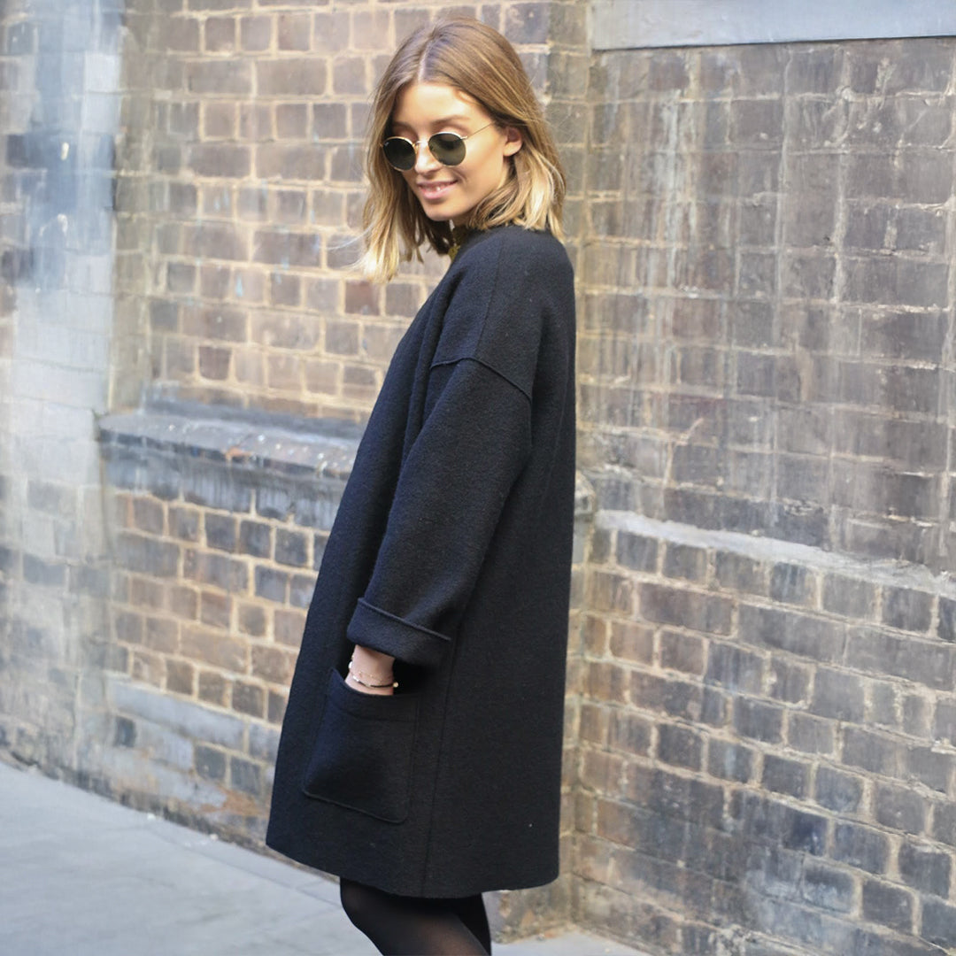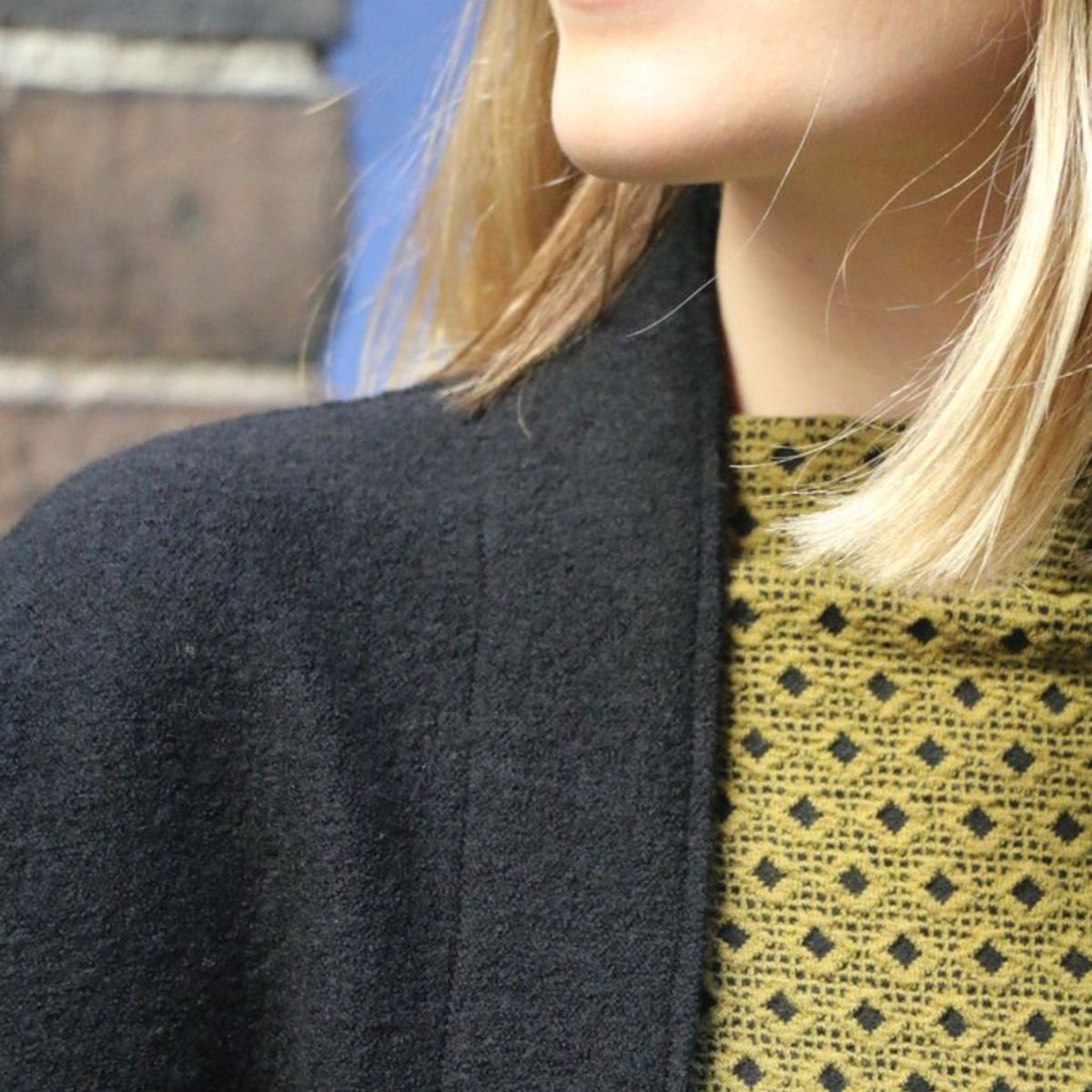 The Berlin Jacket is a collarless, longline jacket featuring patch pockets, extended dropped shoulders and full-length sleeves with a turned back cuff. The back neck is slightly raised. Effortlessly stylish, the jacket is the ideal winter wardrobe staple and perfect for layering over dresses or any casual outfit.