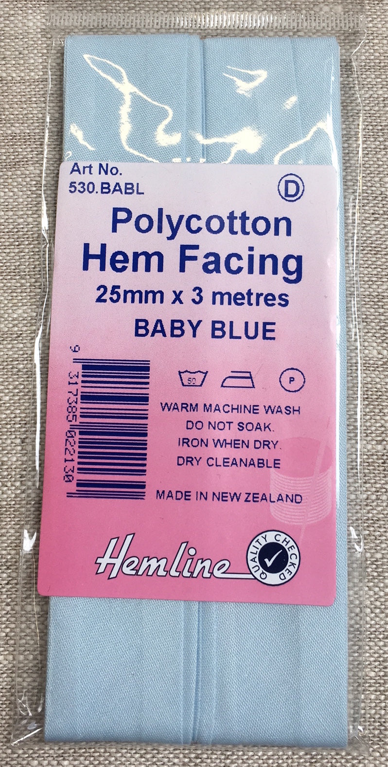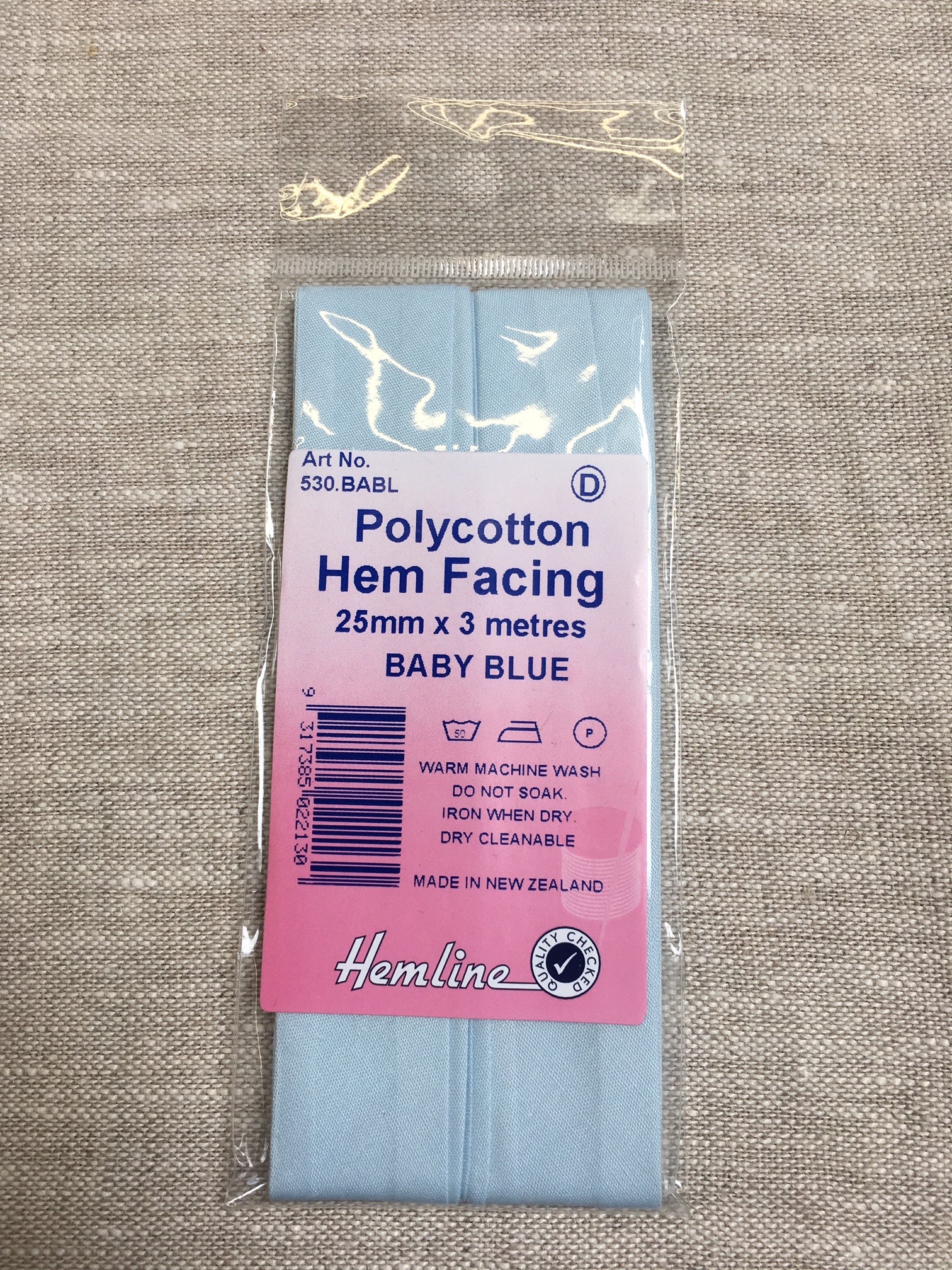 Baby Blue polycotton hem facing, 25mm wide x 3 metres long. Hem facing is used primarily when you are turning a hem down and don’t have enough fabric to properly face it. Available in 12 colours.