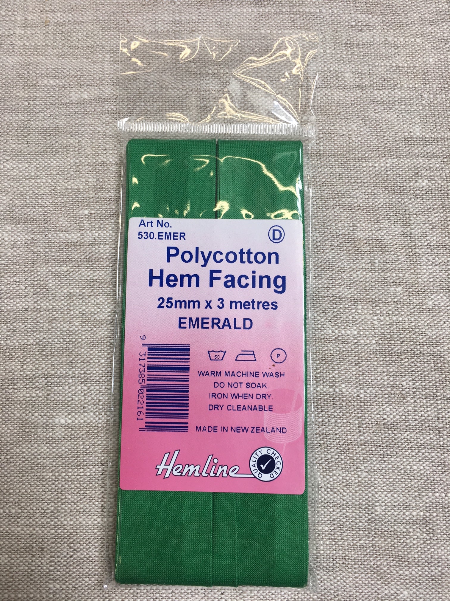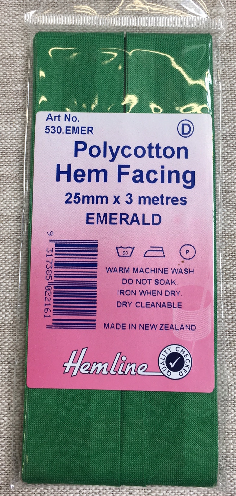 Emerald polycotton hem facing, 25mm wide x 3 metres long. Hem facing is used primarily when you are turning a hem down and don’t have enough fabric to properly face it. Available in 12 colours.