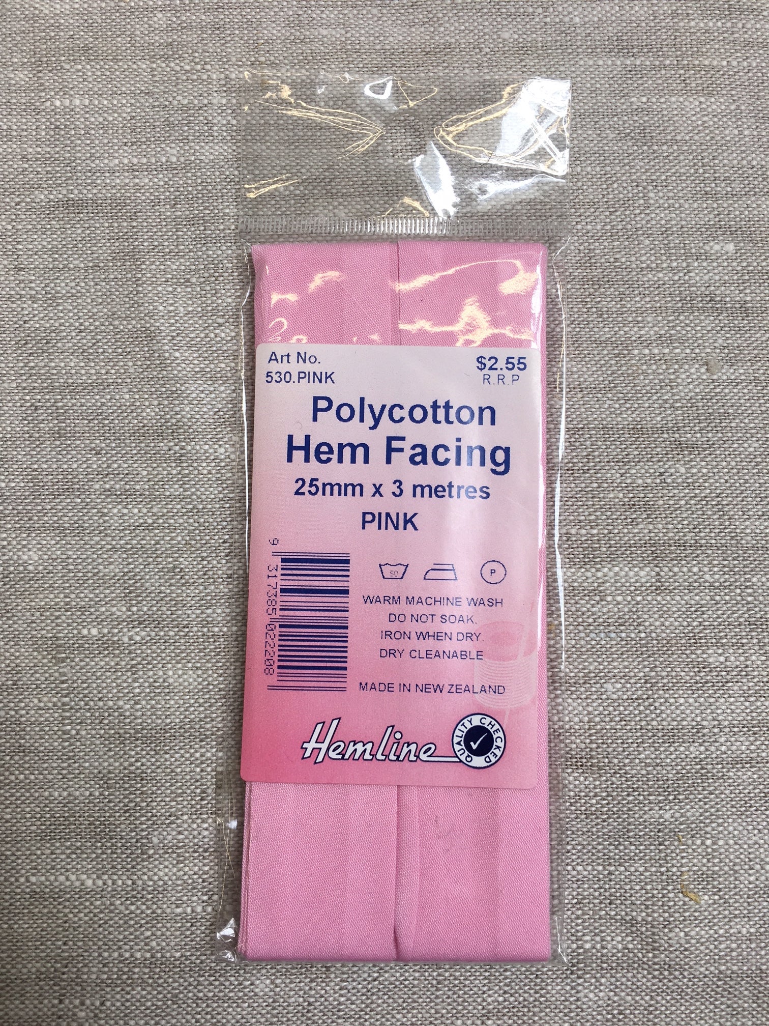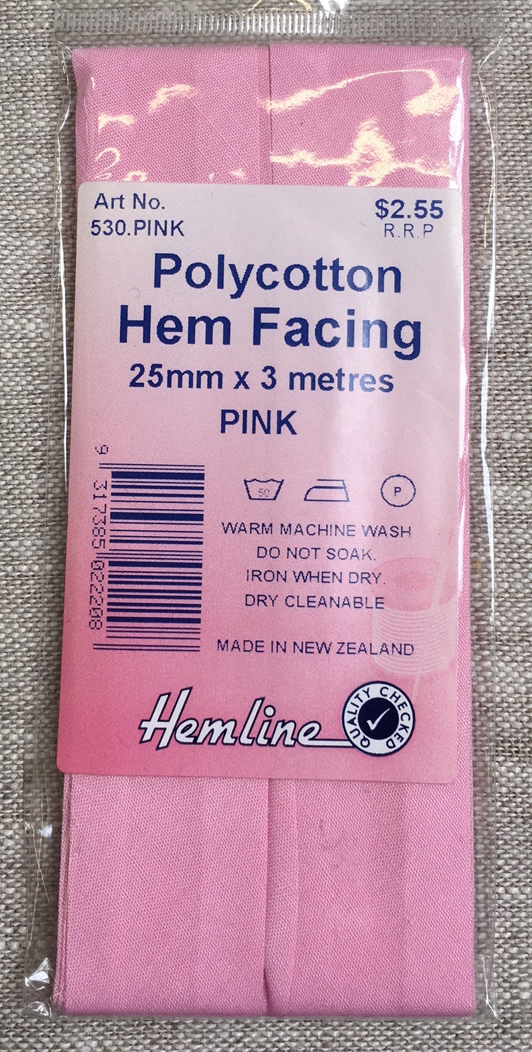 Pink polycotton hem facing, 25mm wide x 3 metres long. Hem facing is used primarily when you are turning a hem down and don’t have enough fabric to properly face it. Available in 12 colours.