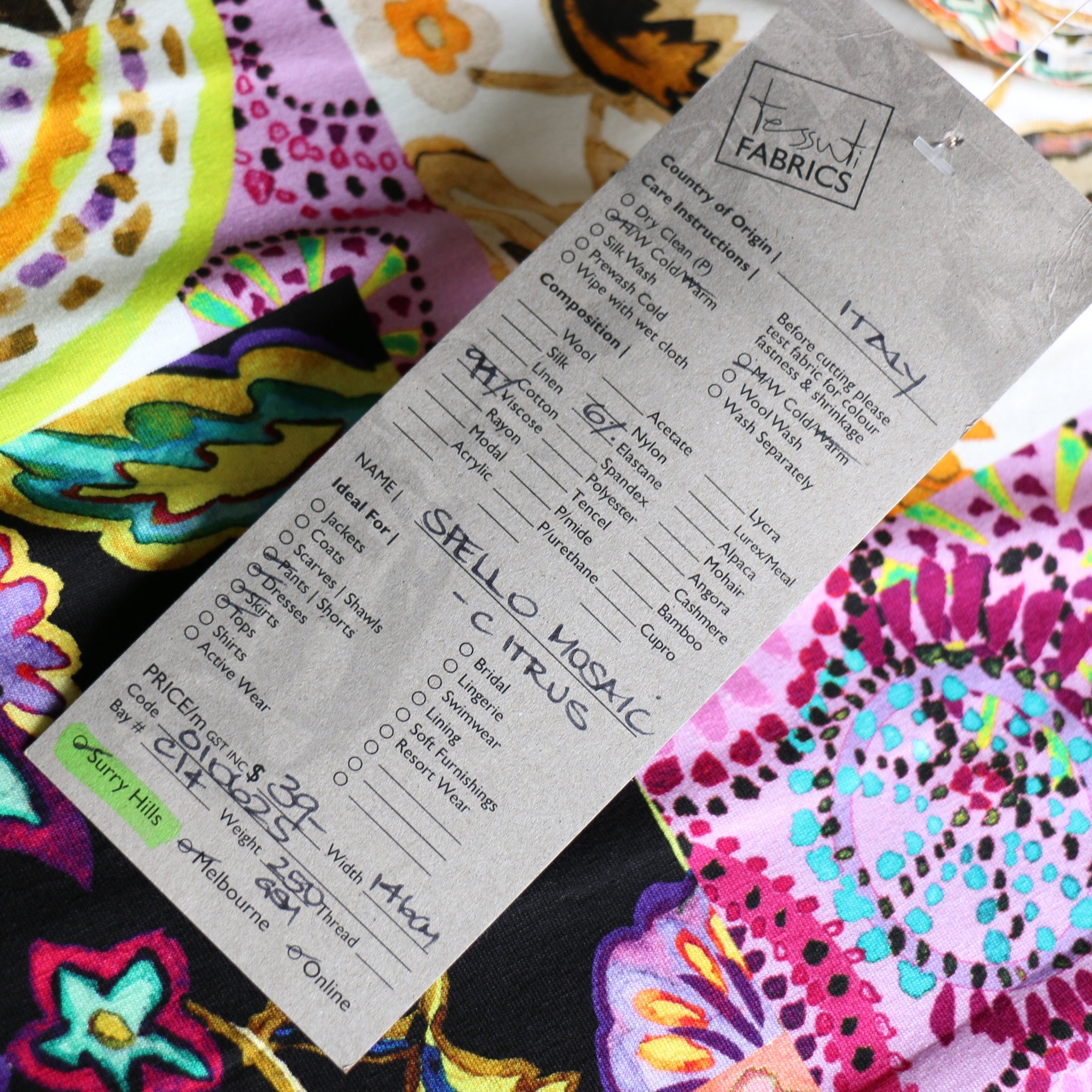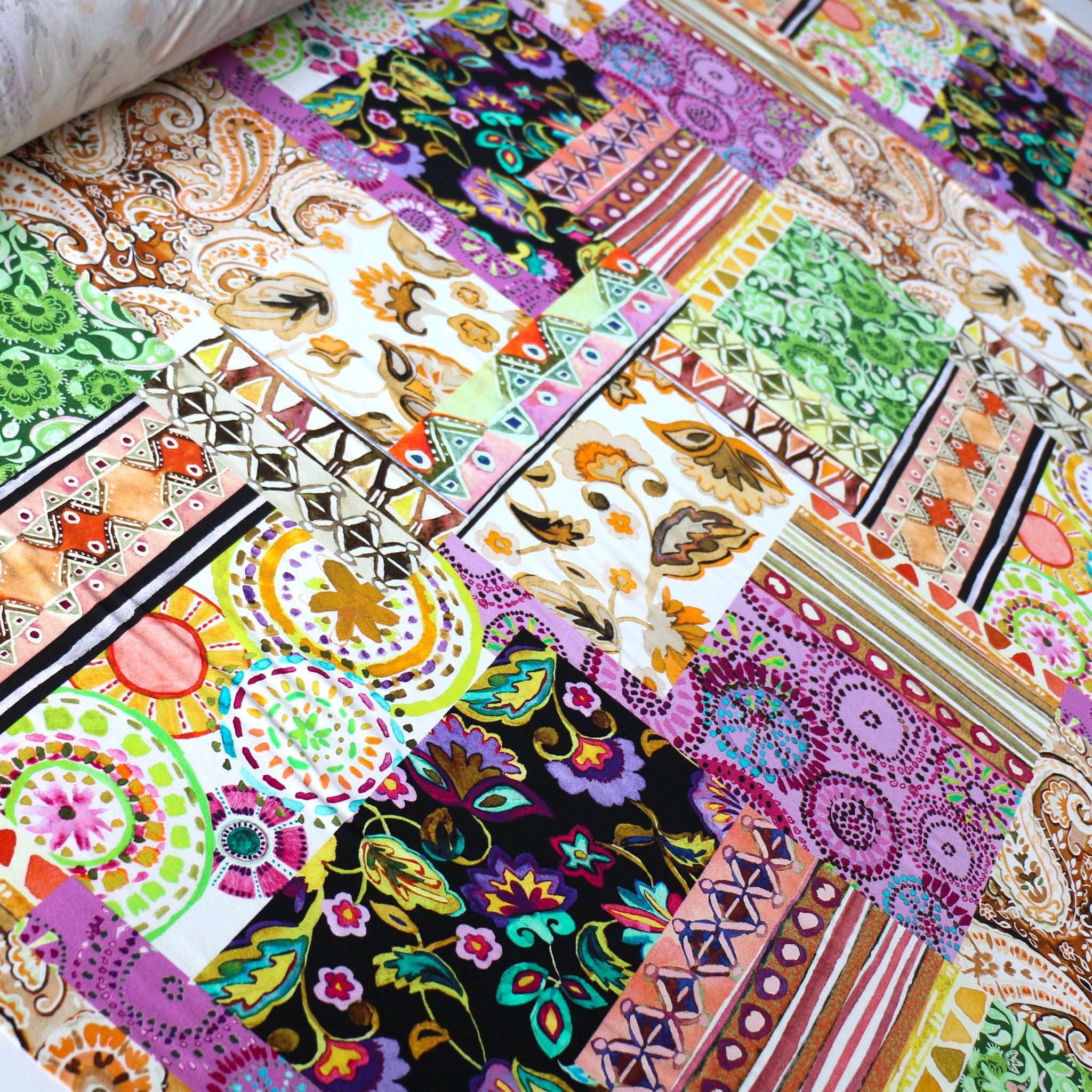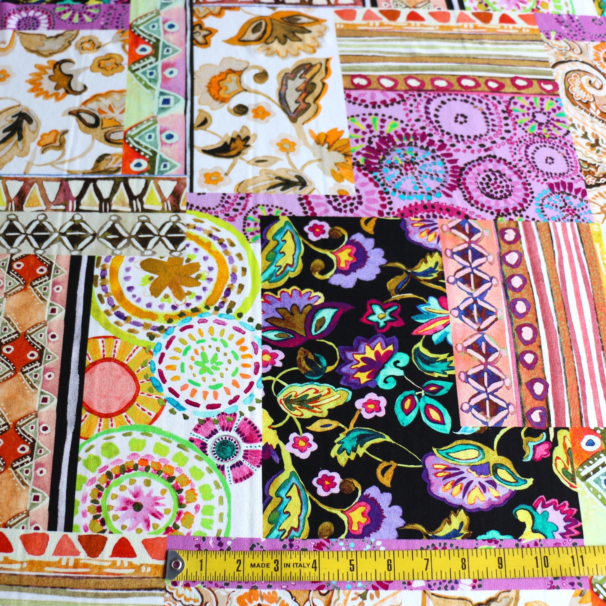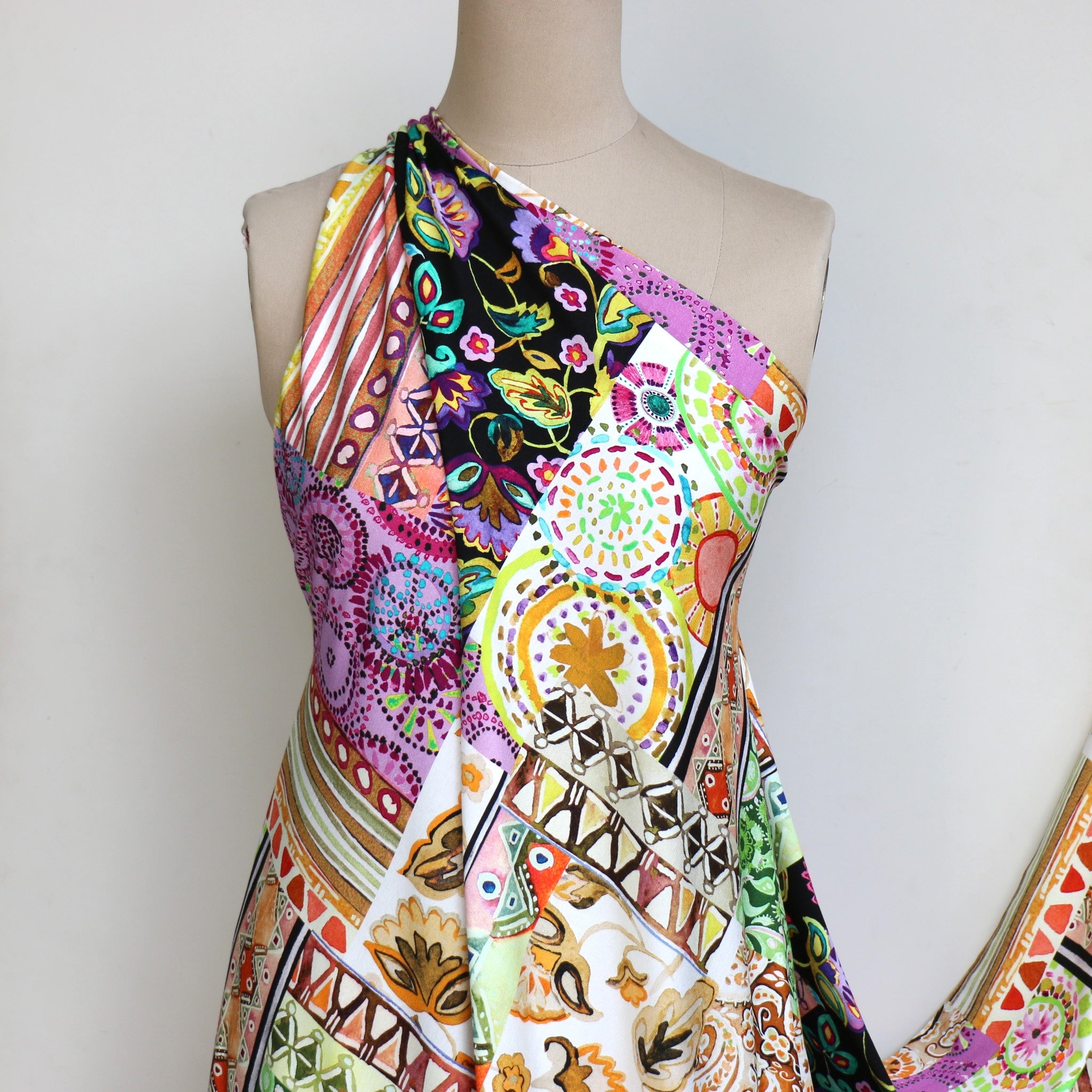 Italian citrus/wisteria multi patchwork printed 94% viscose 6% elastane jersey knit