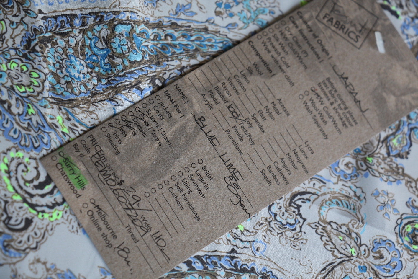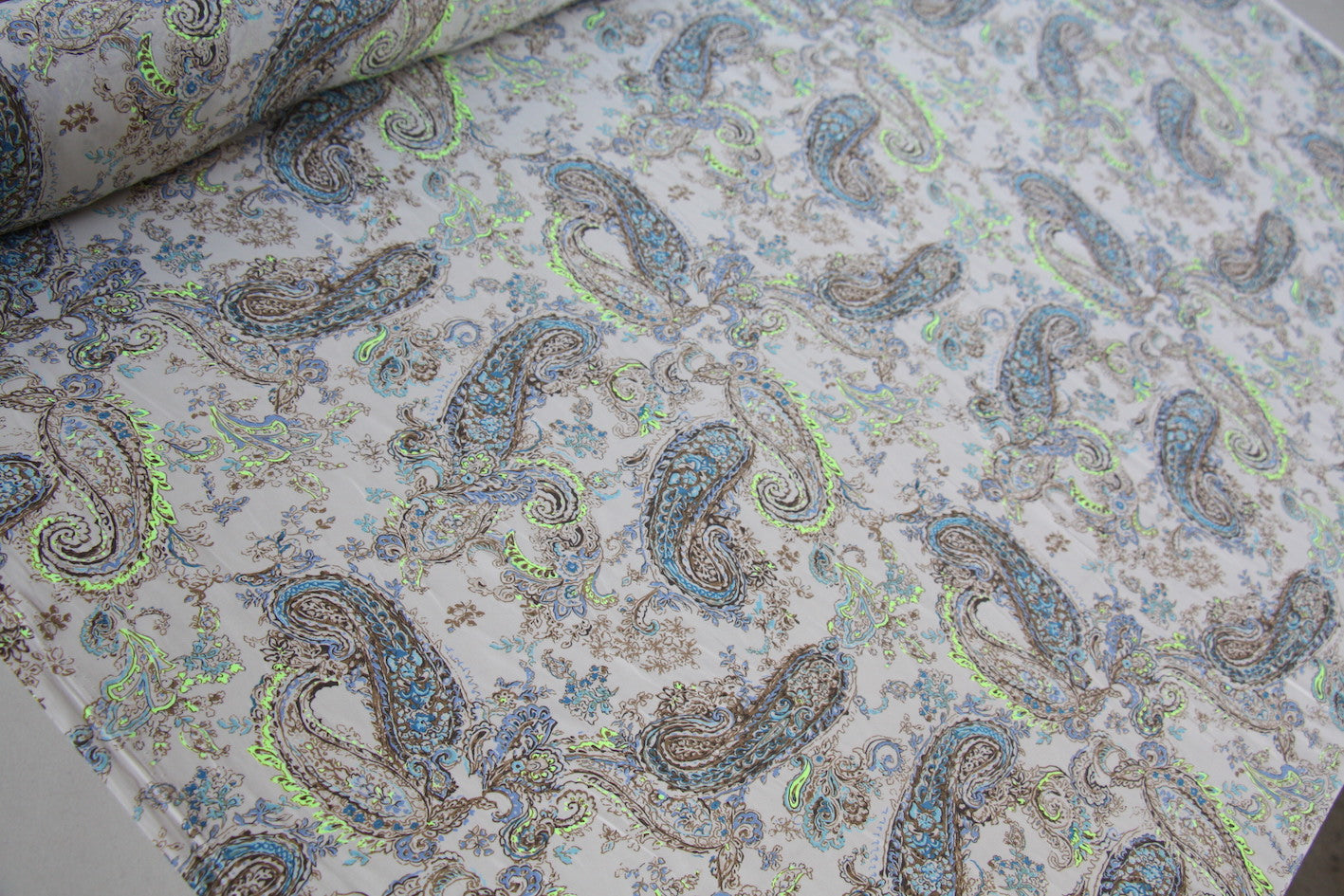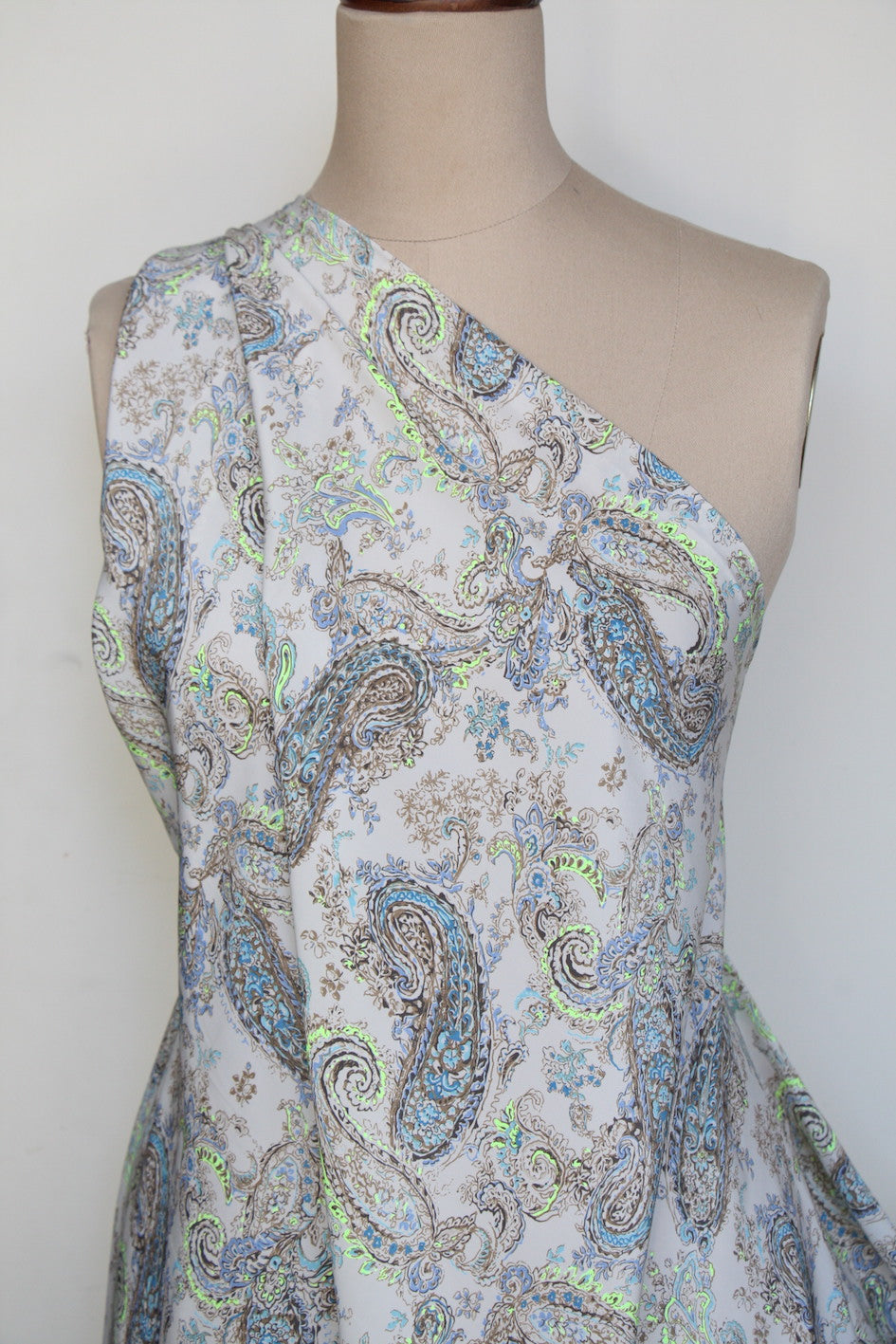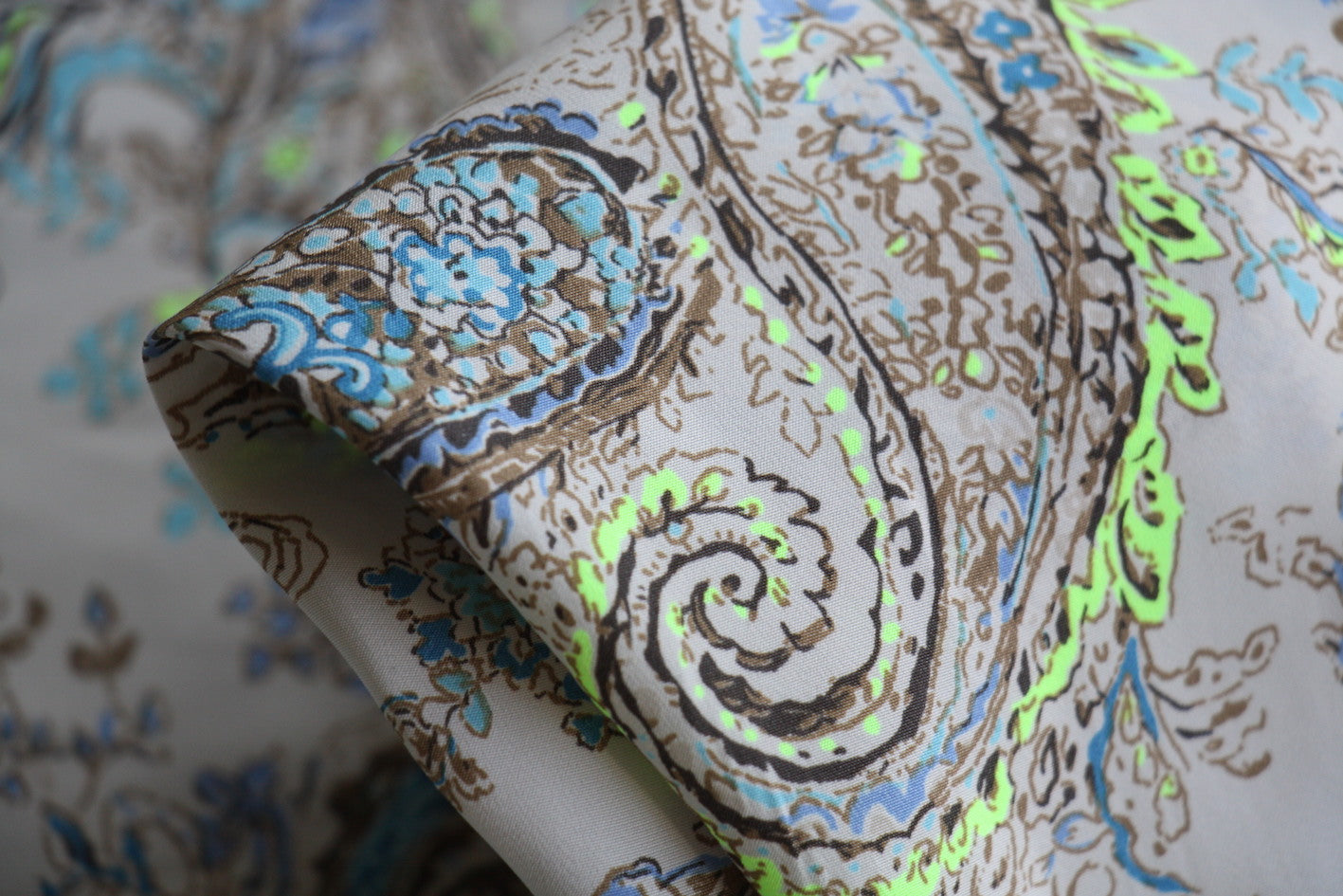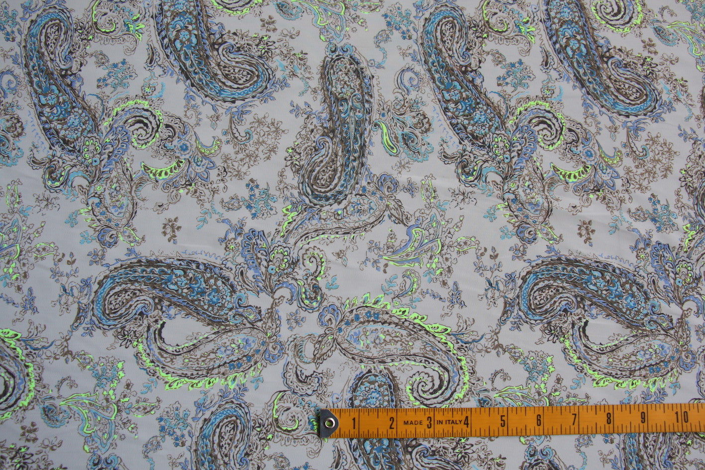 Stone/blue/lime paisley printed Japanese technical 100% polyester. 110cm wide. Weight: 88gsm