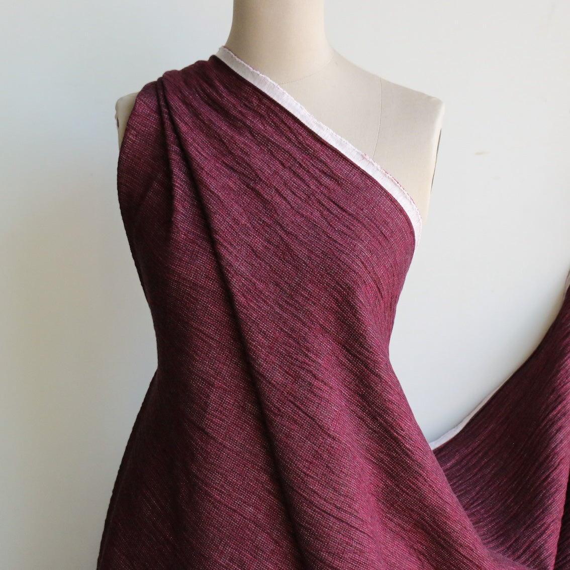 Cherry red yarn-dyed washed textured 55% linen 45% cotton with ecru backing and pin stitch detail.