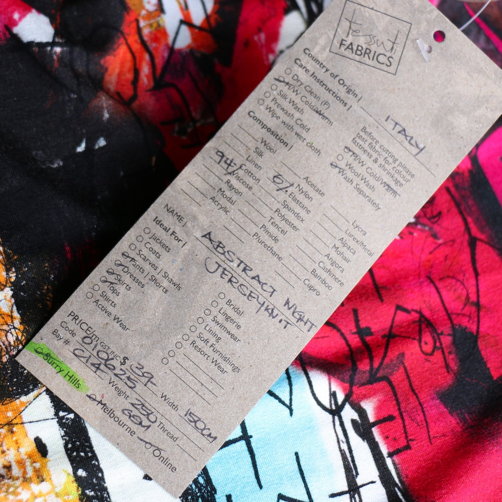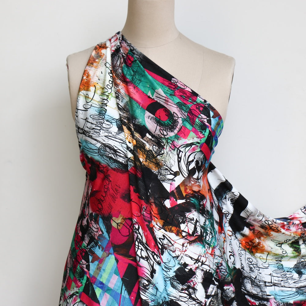 Italian black/white/pink/aqua abstract grafitti printed 94% viscose 6% elastane jersey knit