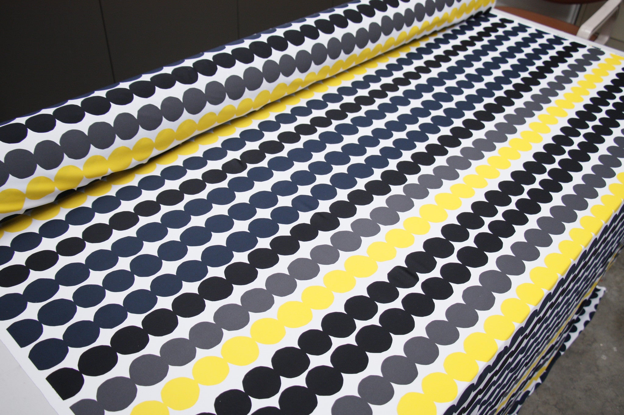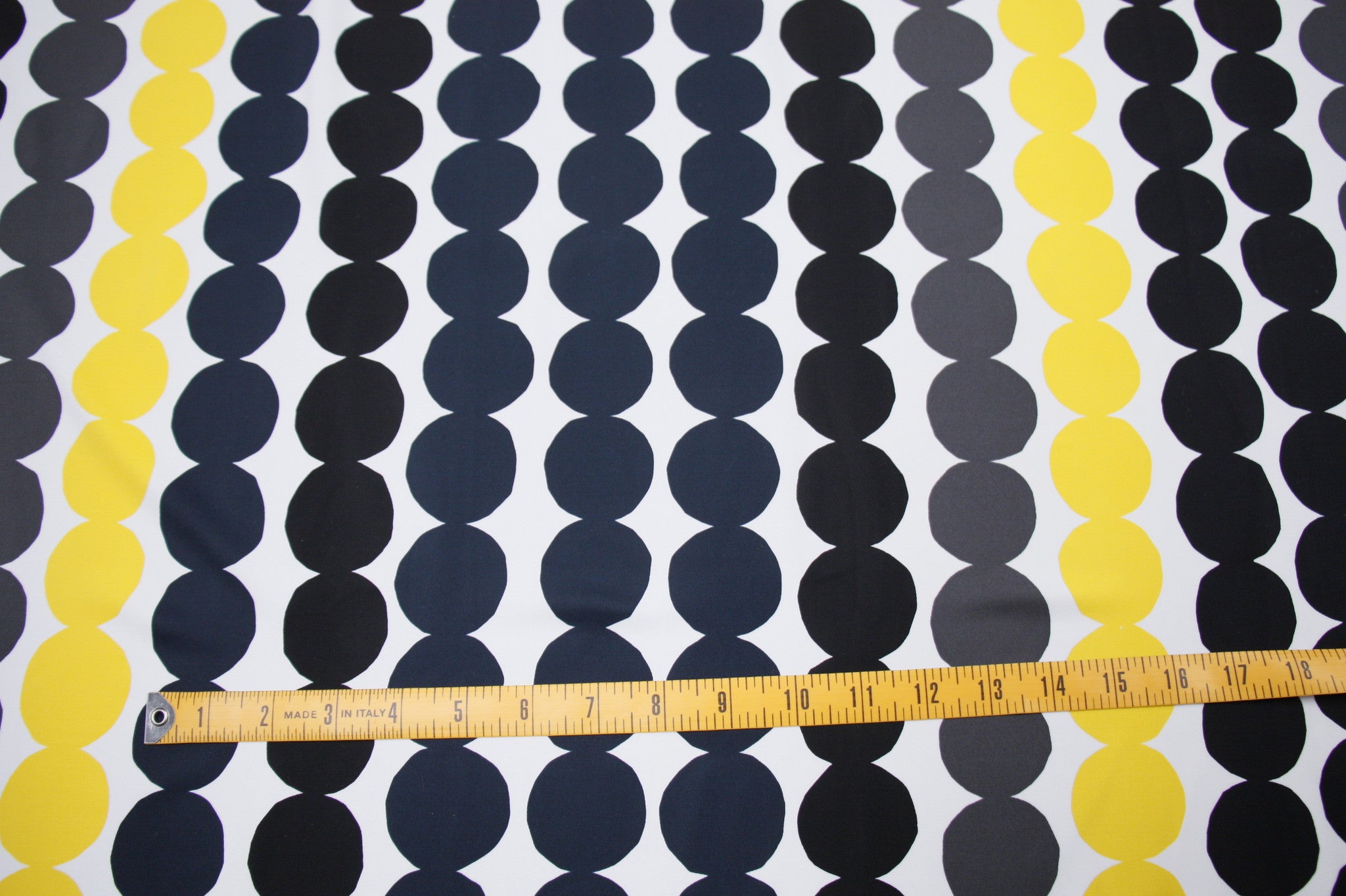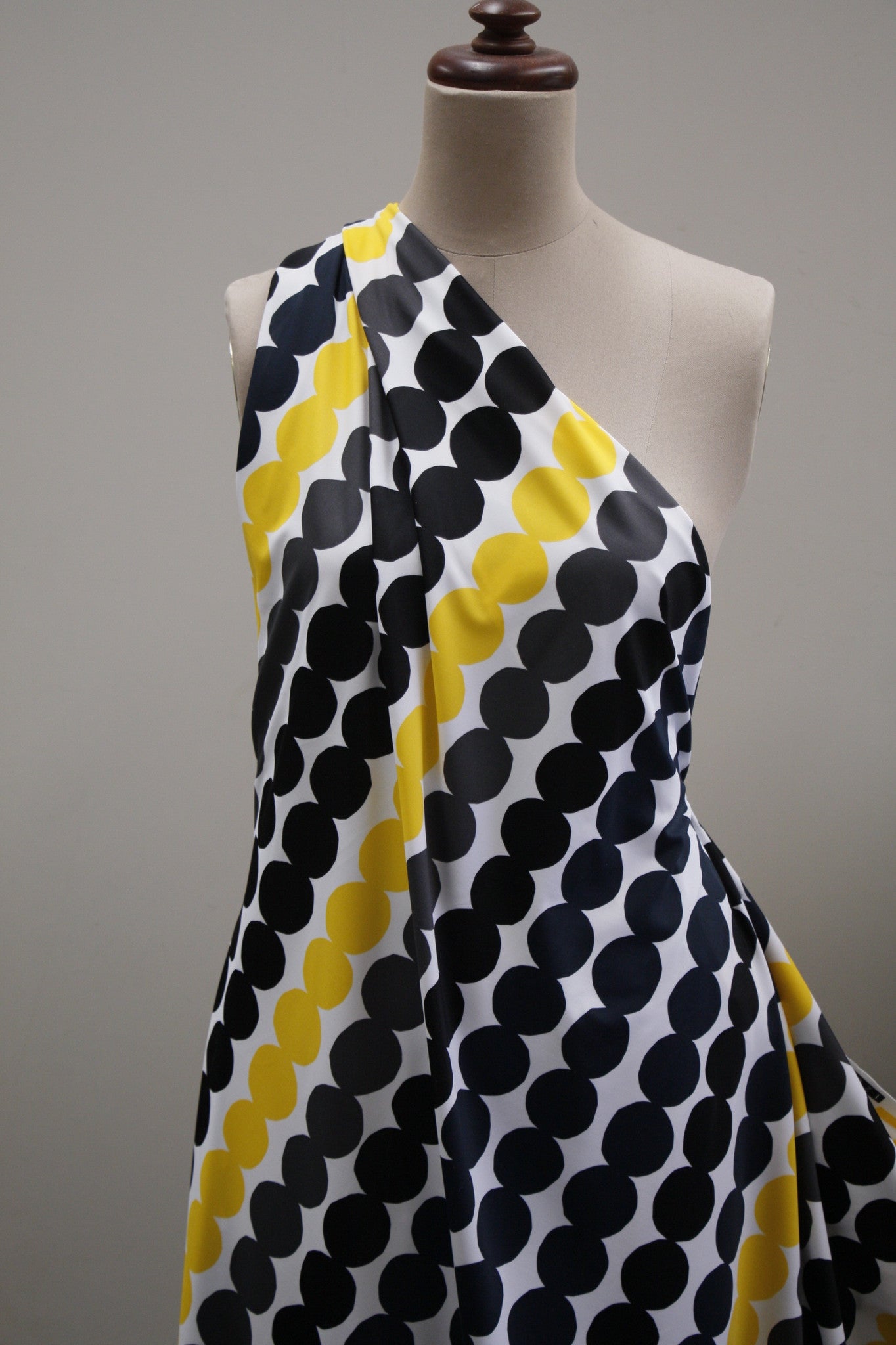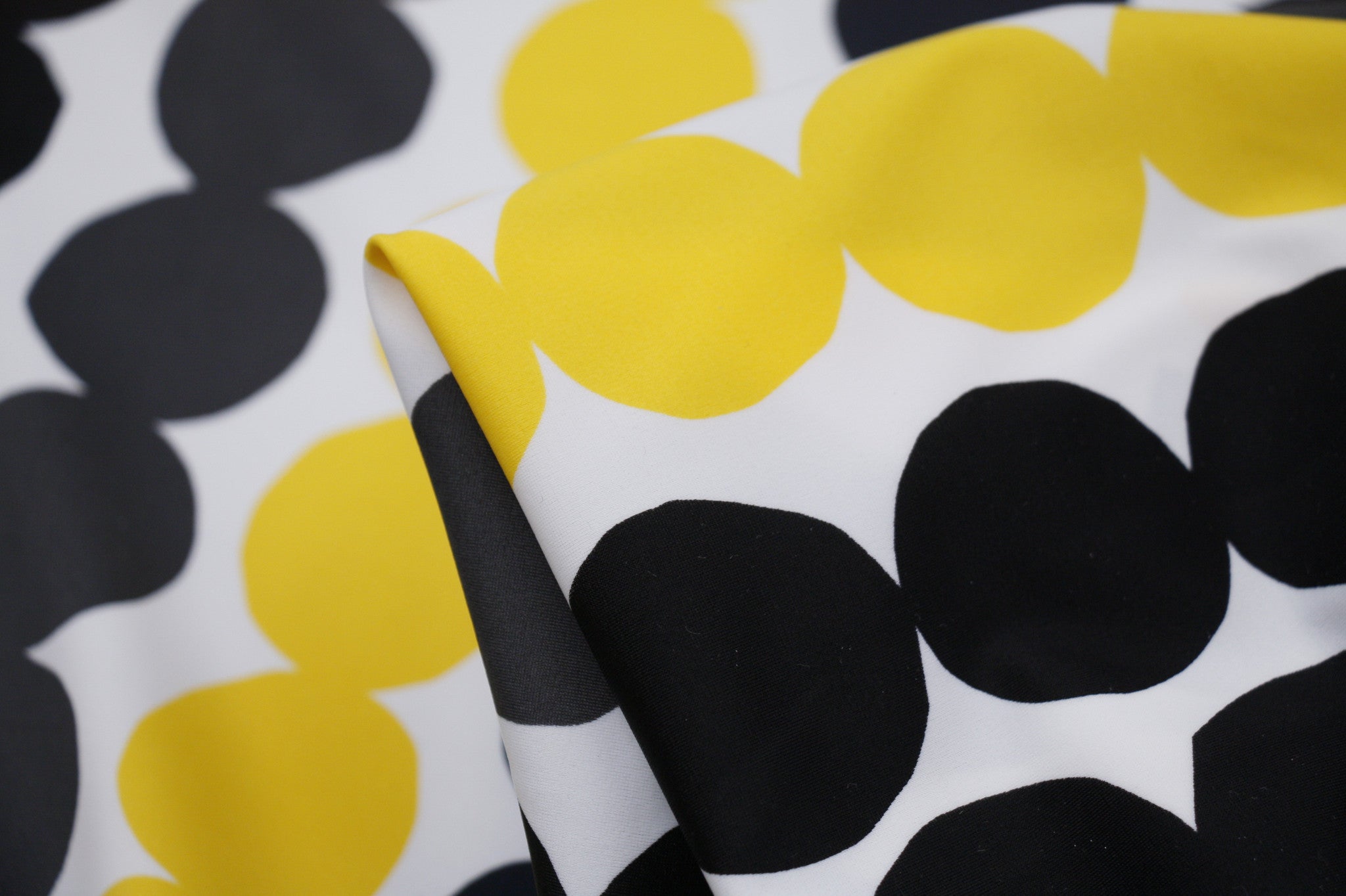 Designer printed black/grey/white/yellow spot nylon/lycra swimwear fabric. Width: 152cm