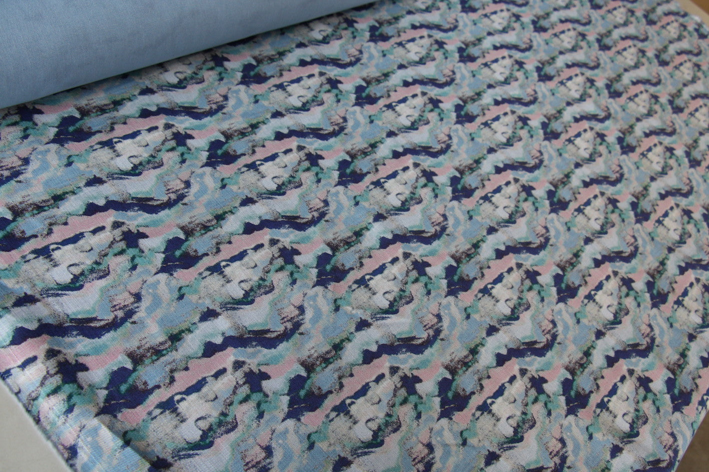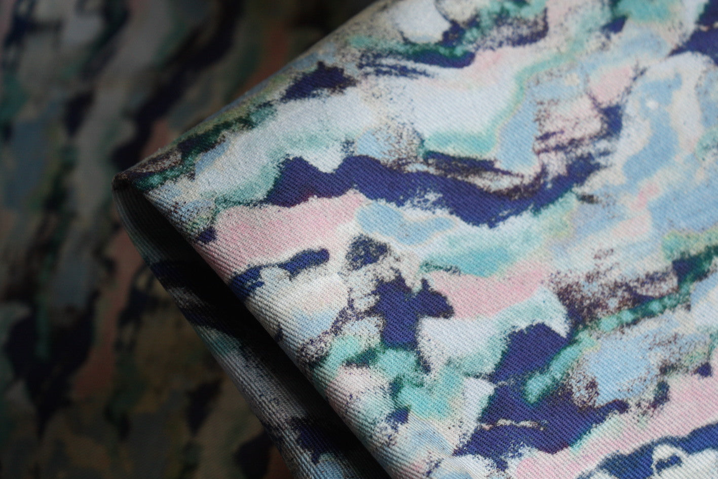 Blue/aqua/pink printed 98% cotton 2% elastane stretch denim.