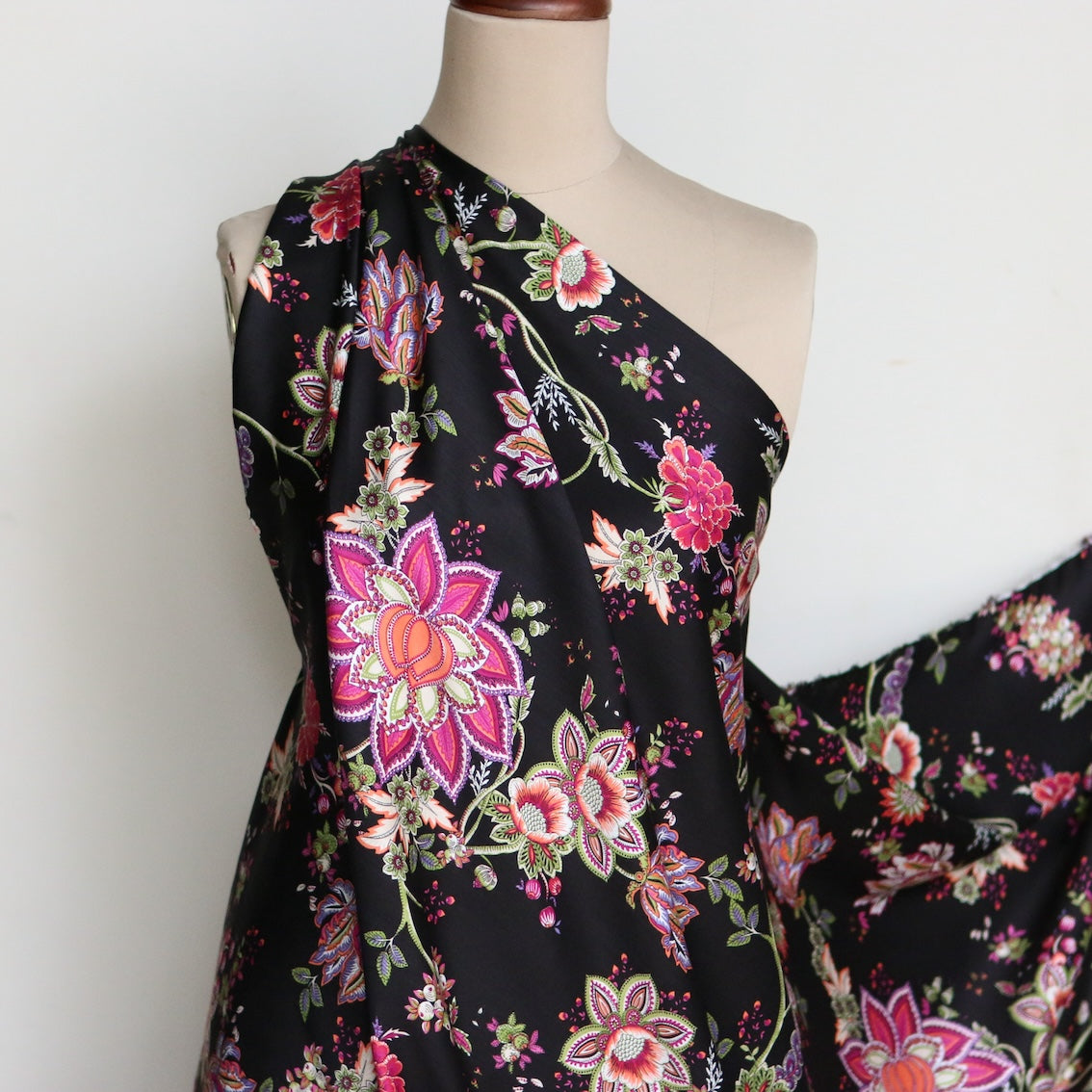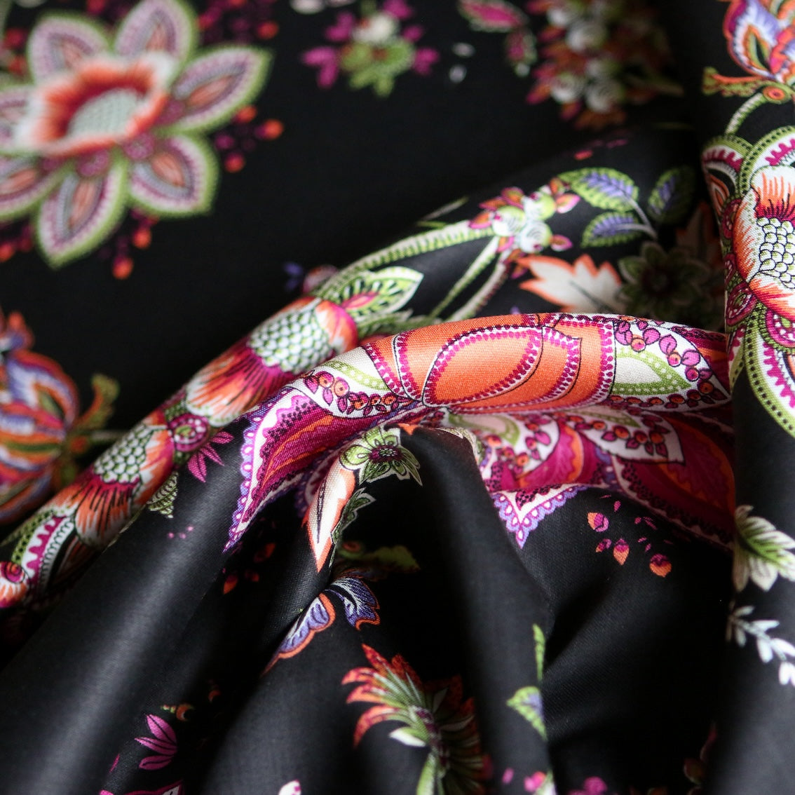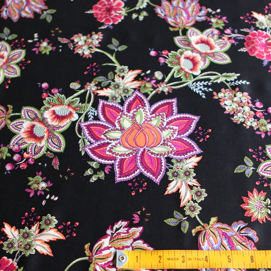 Italian black/pink/green floral printed 100% viscose poplin sateen