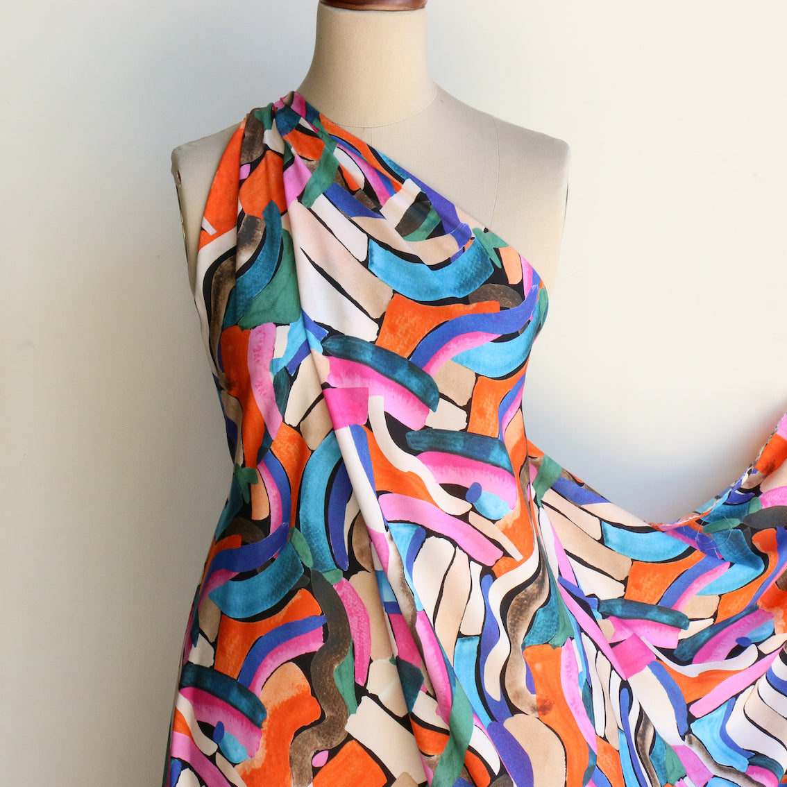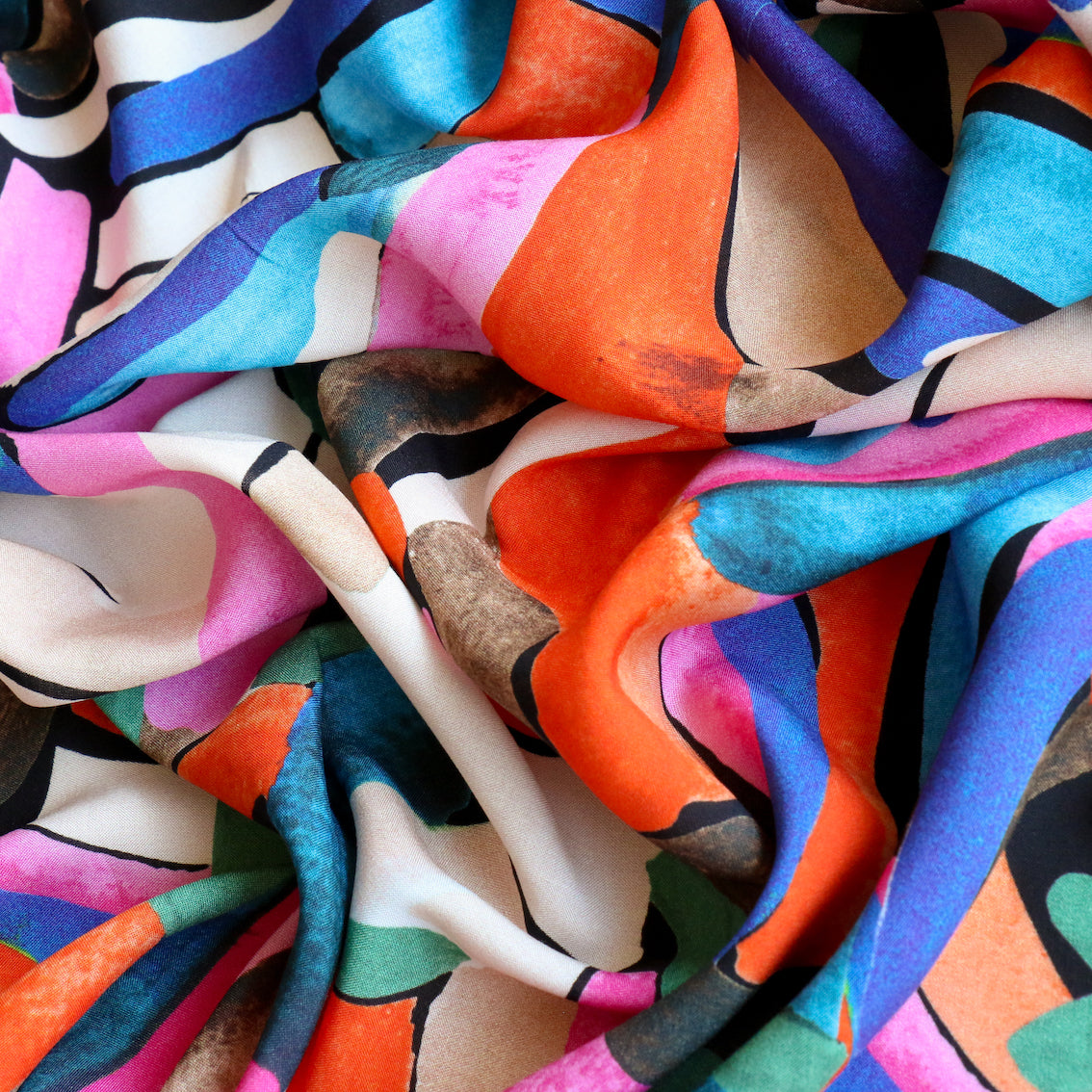 Italian cobalt/pink/orange/black printed 100% viscose challis