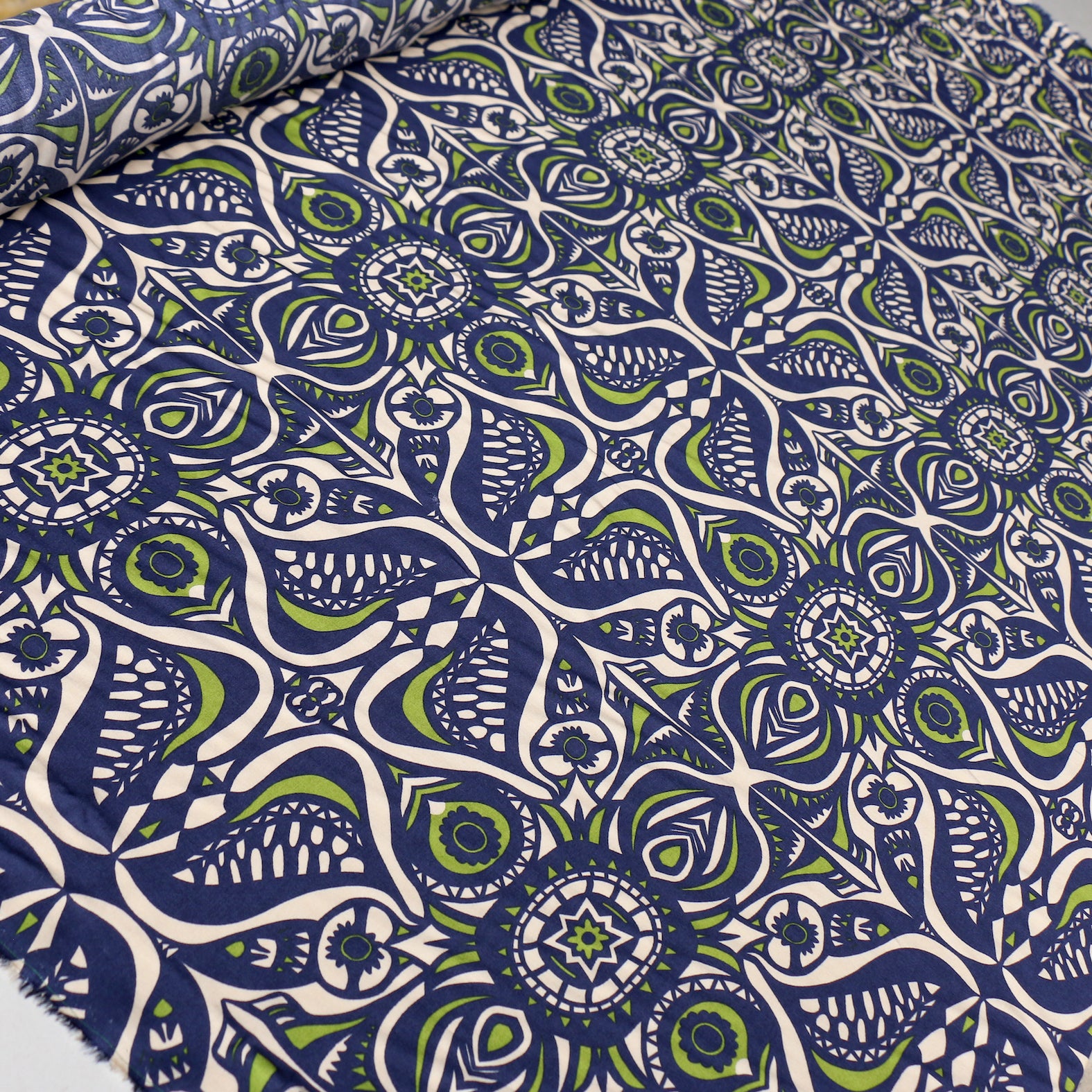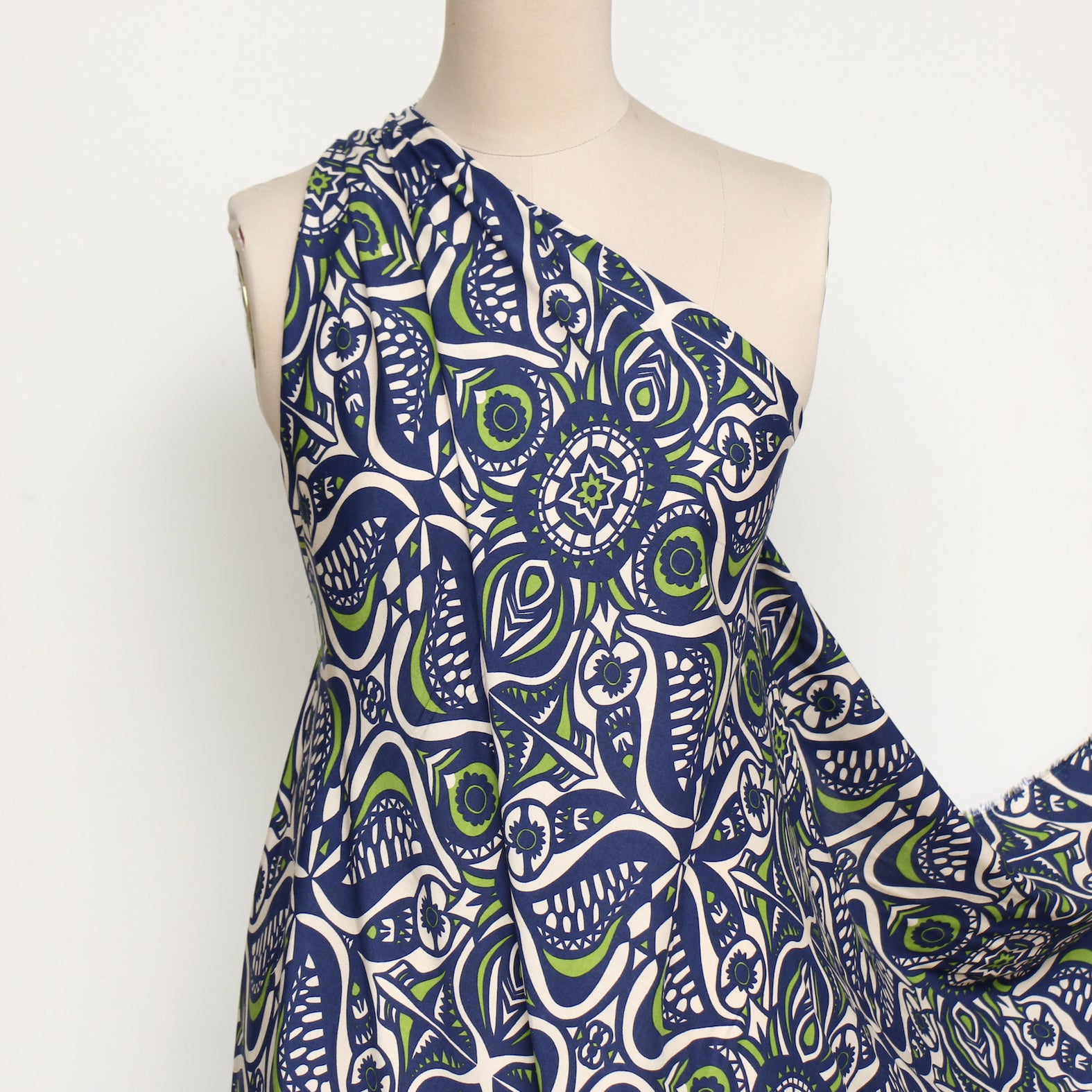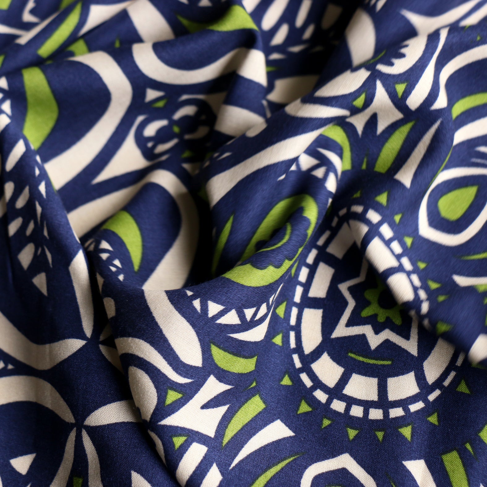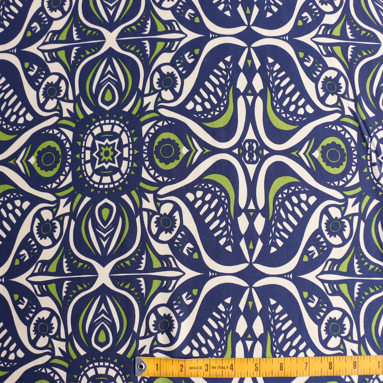 Italian designer navy/ecru/avocado green printed 100% viscose poplin