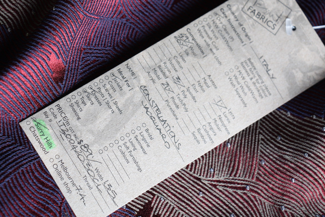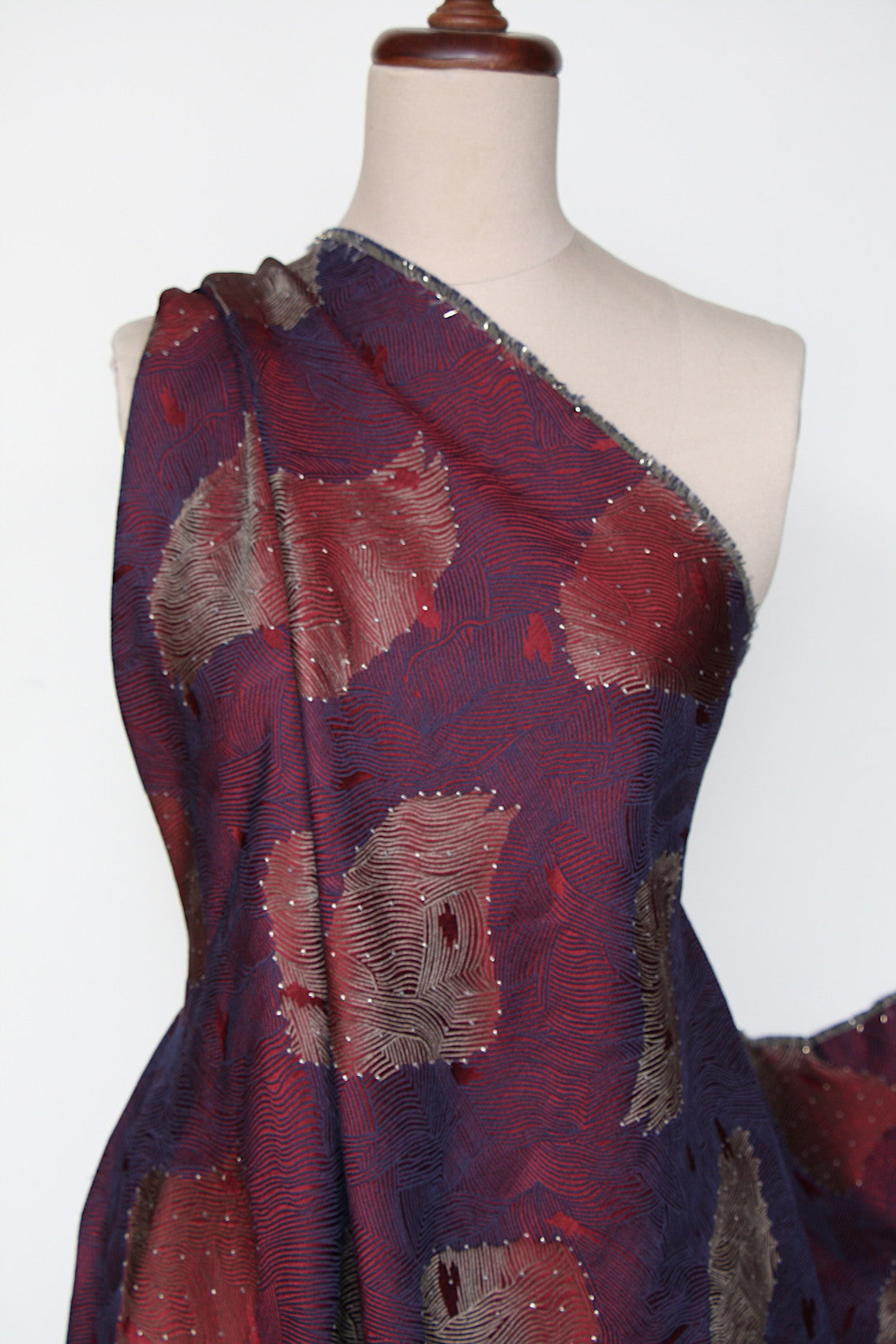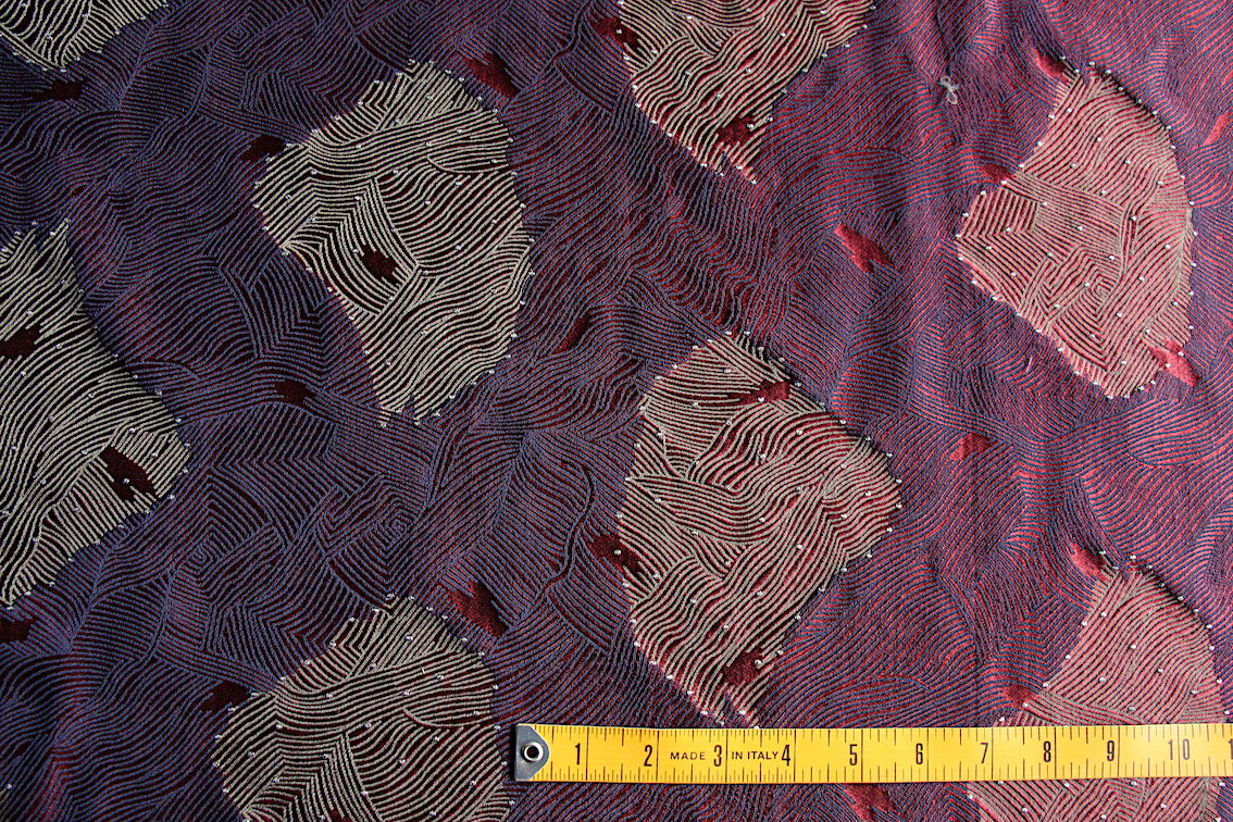 Italian designer garnet/navy/gilt 49% wool 26% silk 21% polyamide 3% polyester 1% poly metal jacquard. Width: 135cm