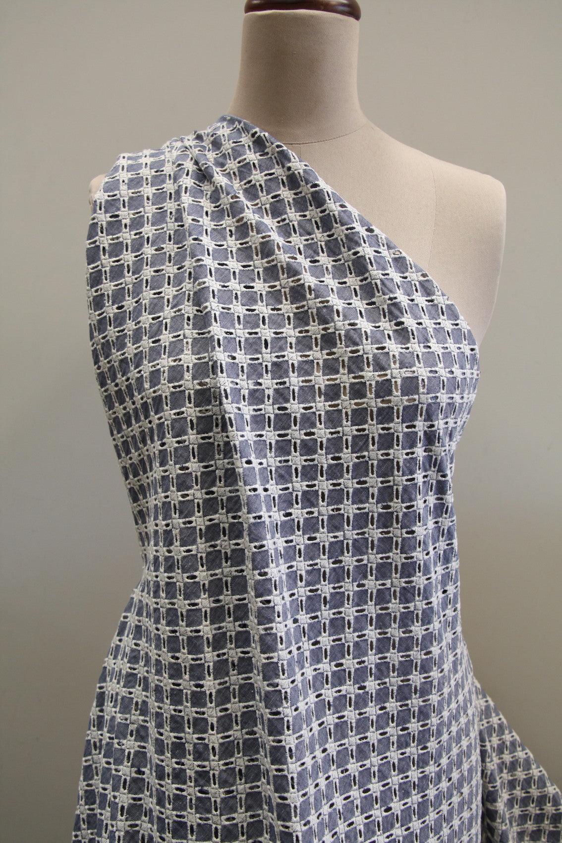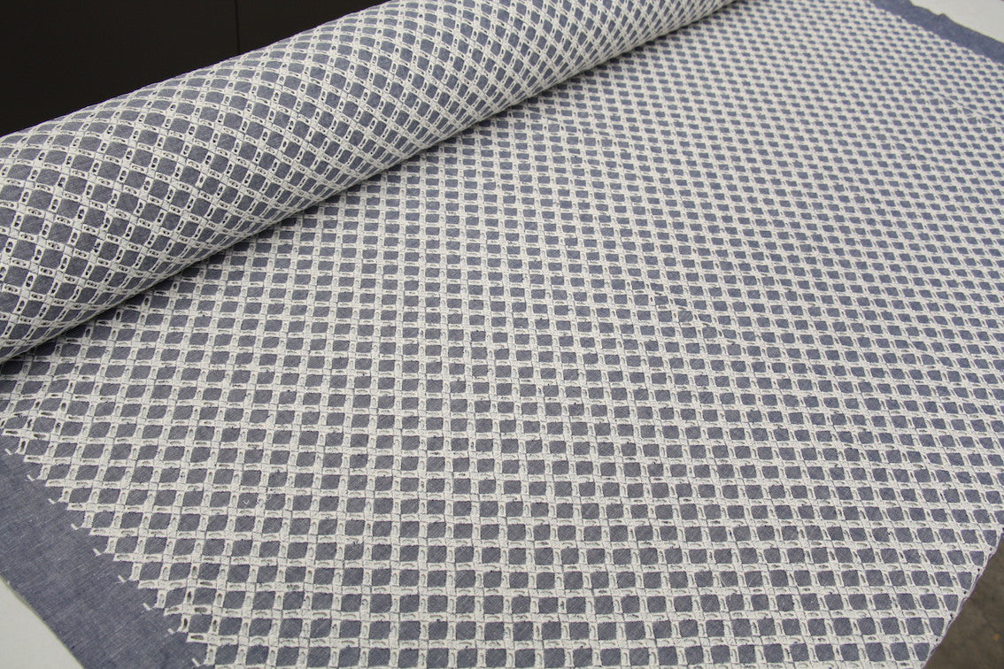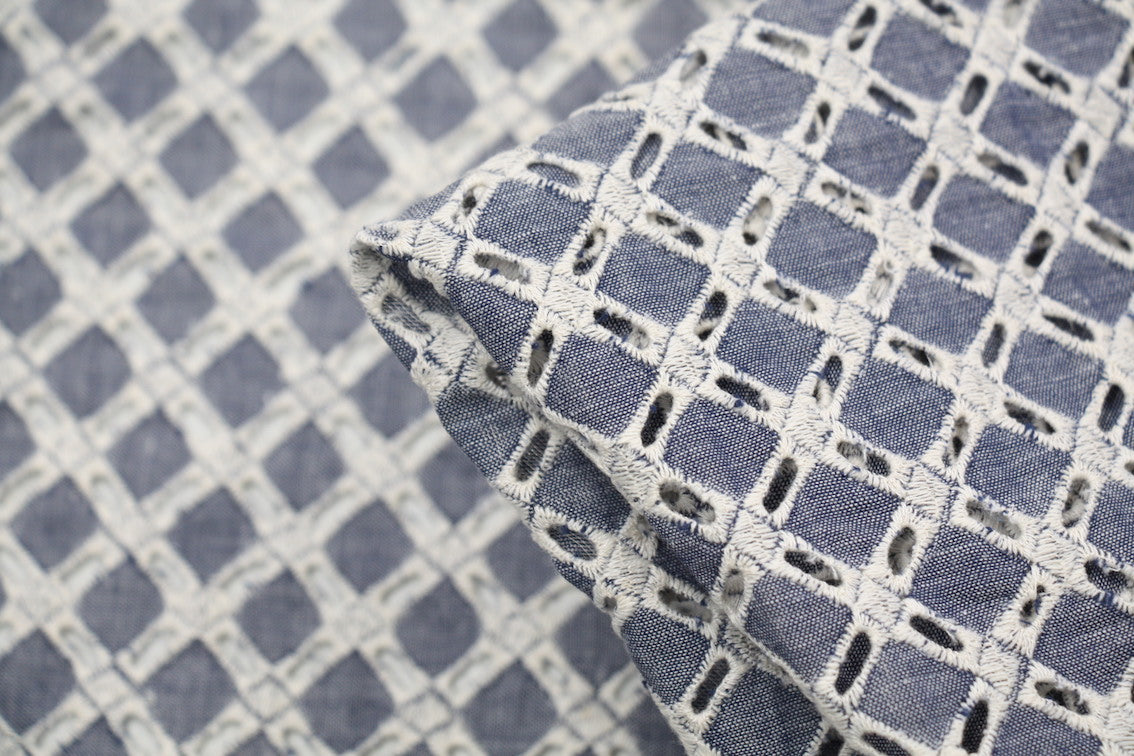 Yarn-dyed denim/natural 75% cotton 25% linen embroidery anglaise. Width: 125cm