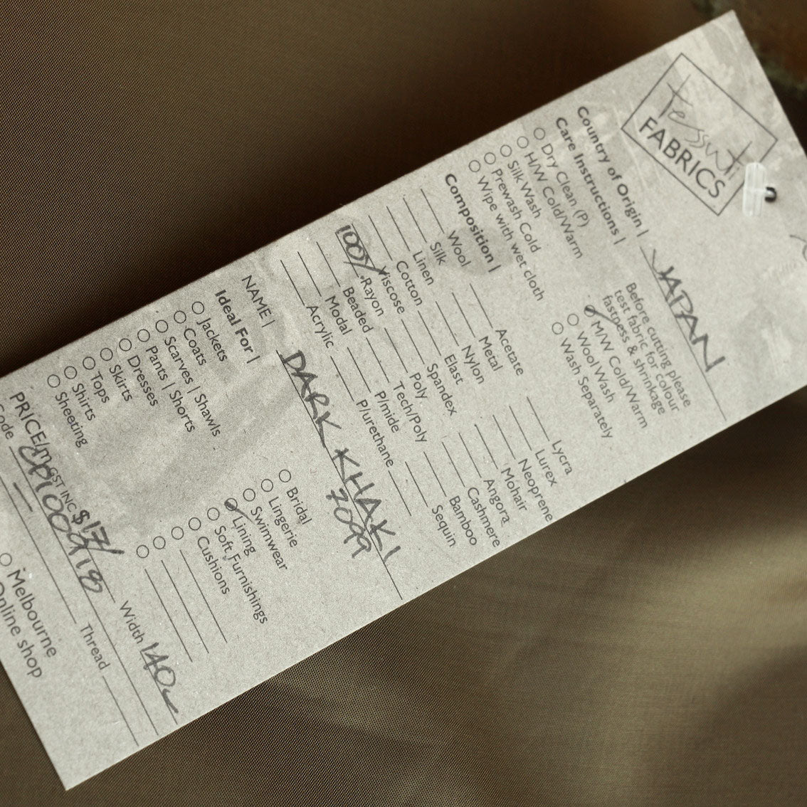 Khaki 100% Japanese Bemberg rayon lining.