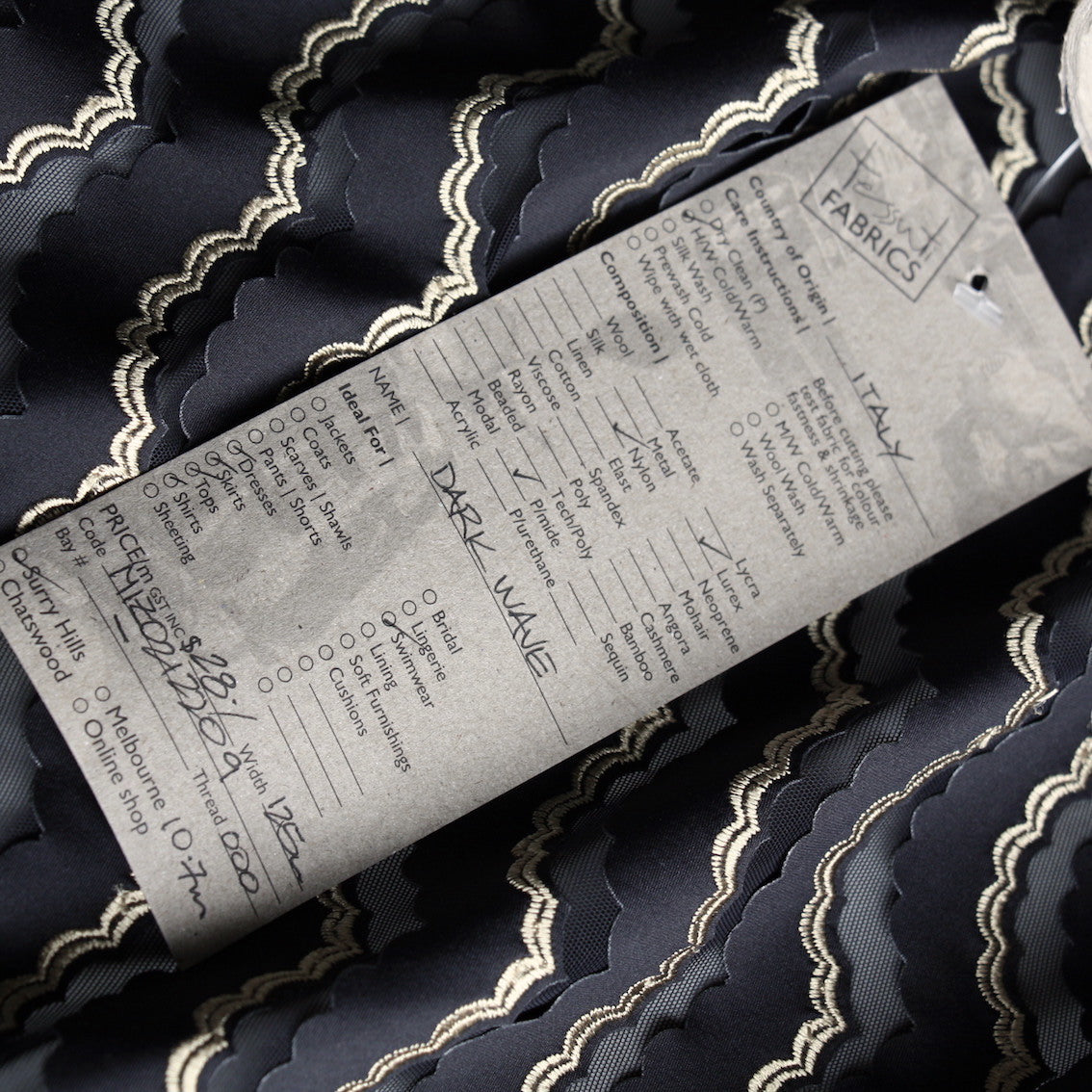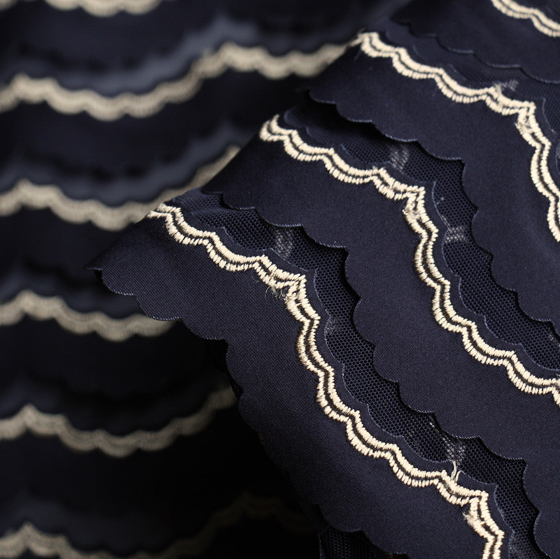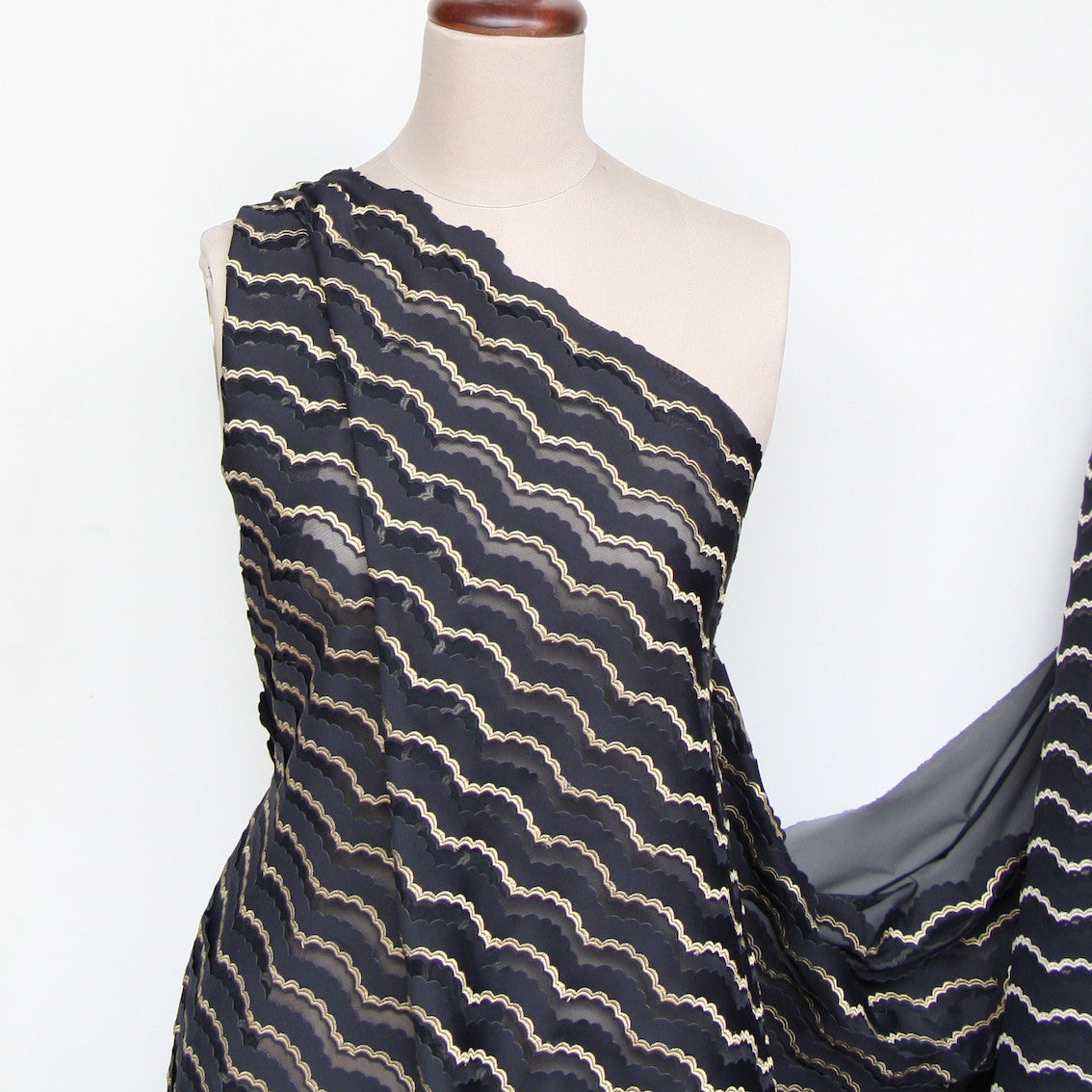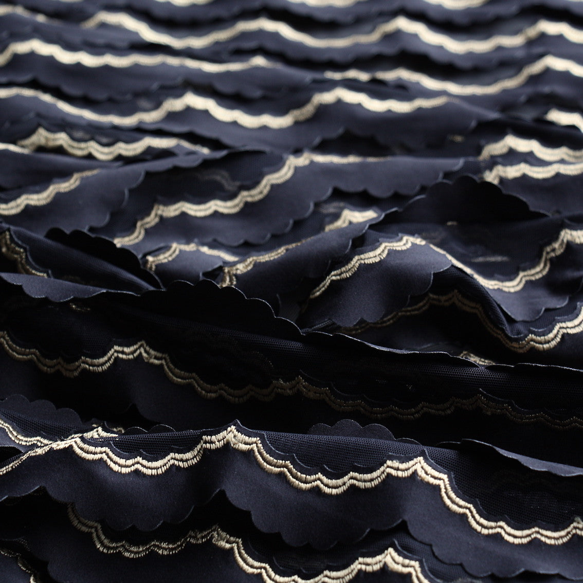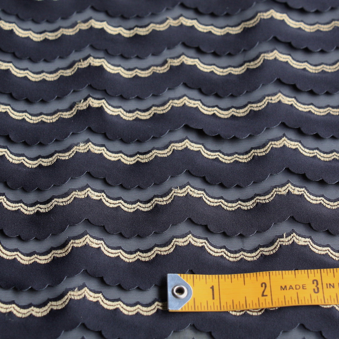 Designer end black & camel nylon/lycra scalloped frill/mesh swimwear fabric.
