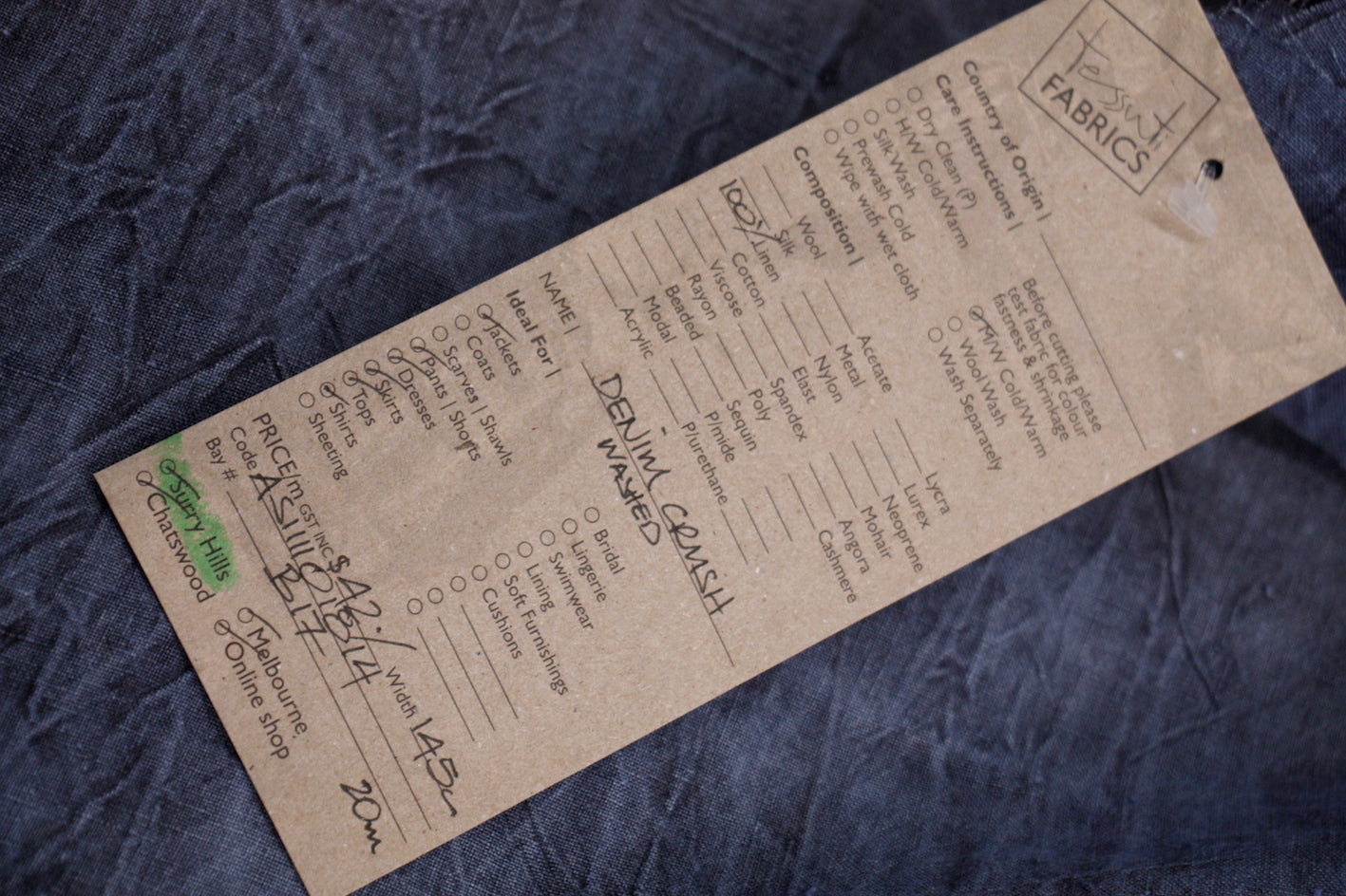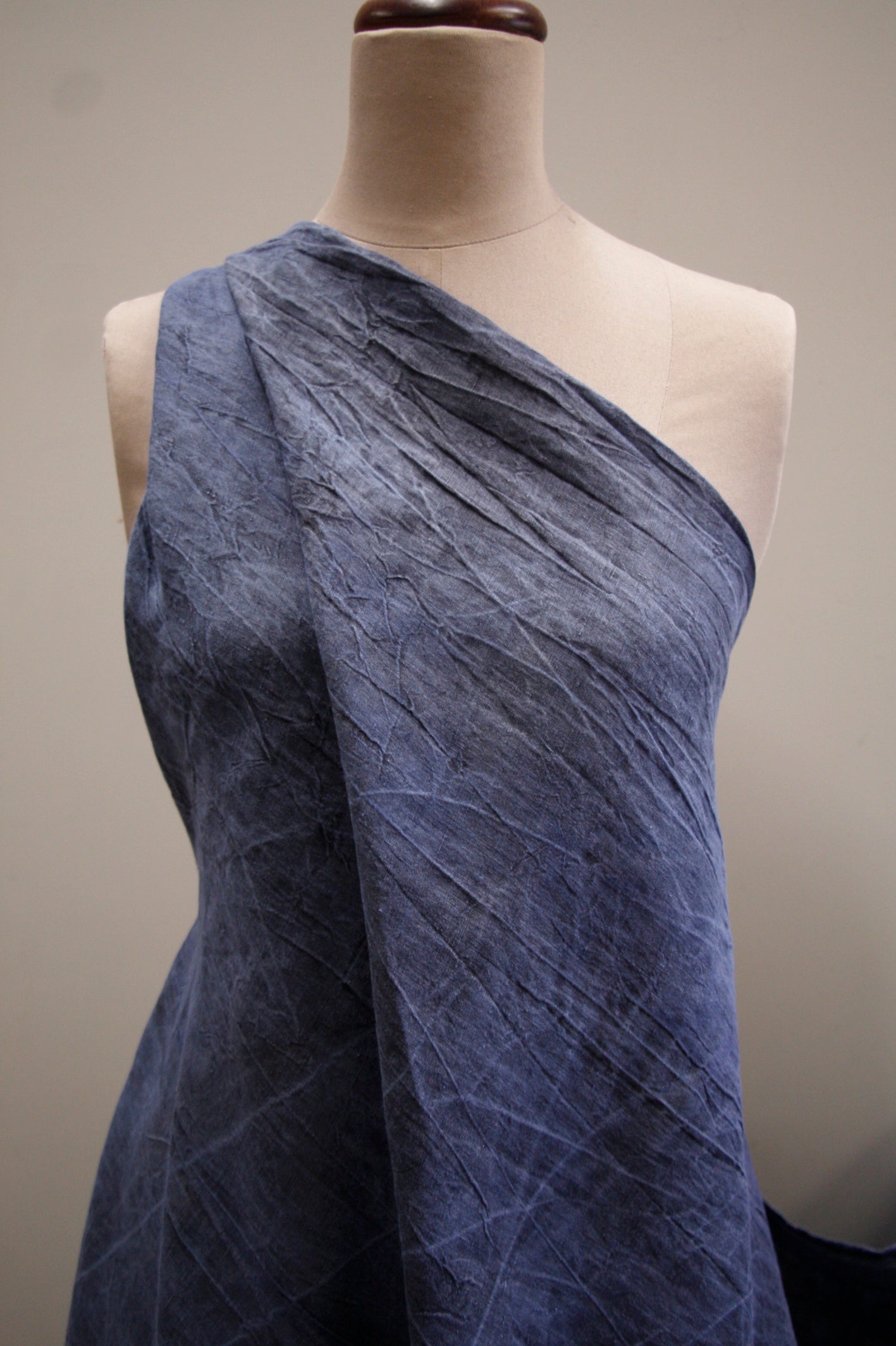 Denim blue washed and crushed look 100% linen. Width:145cm
