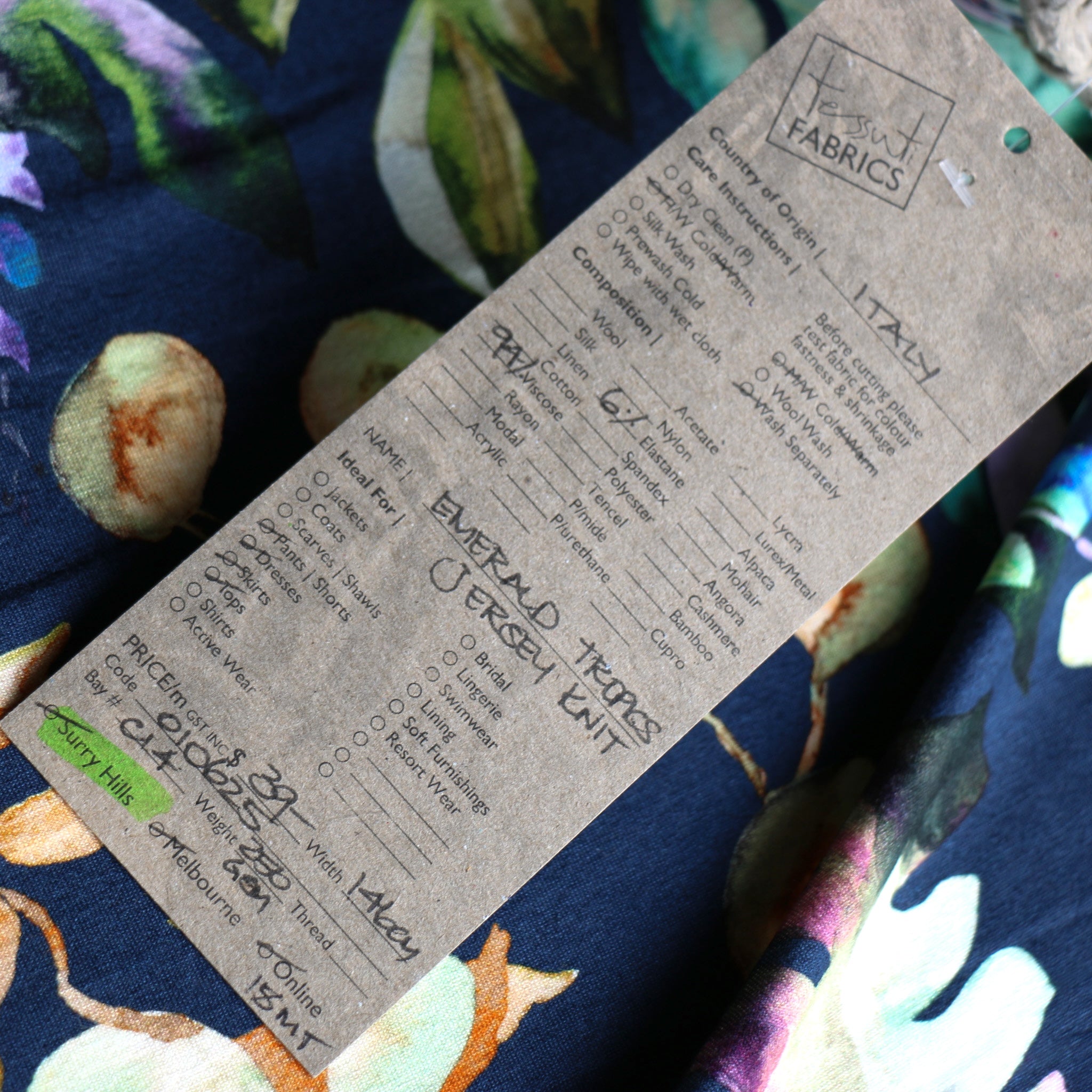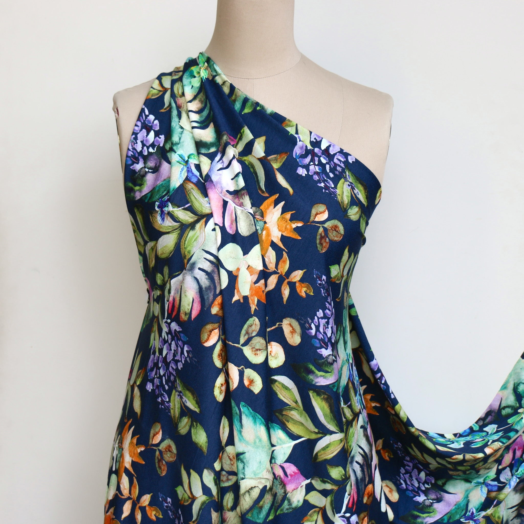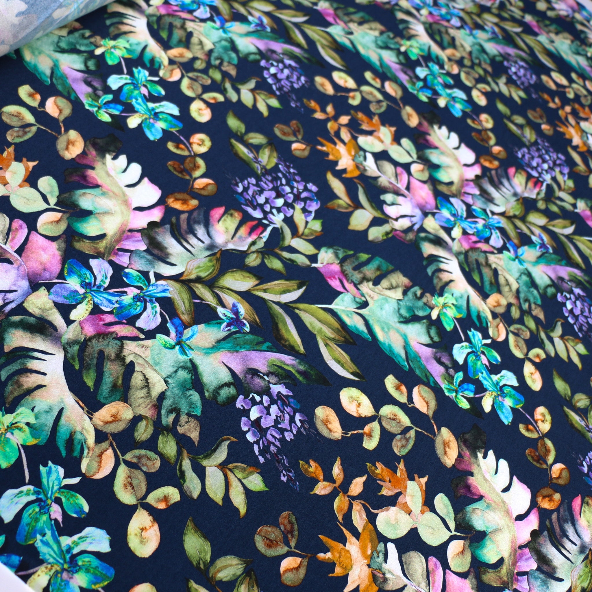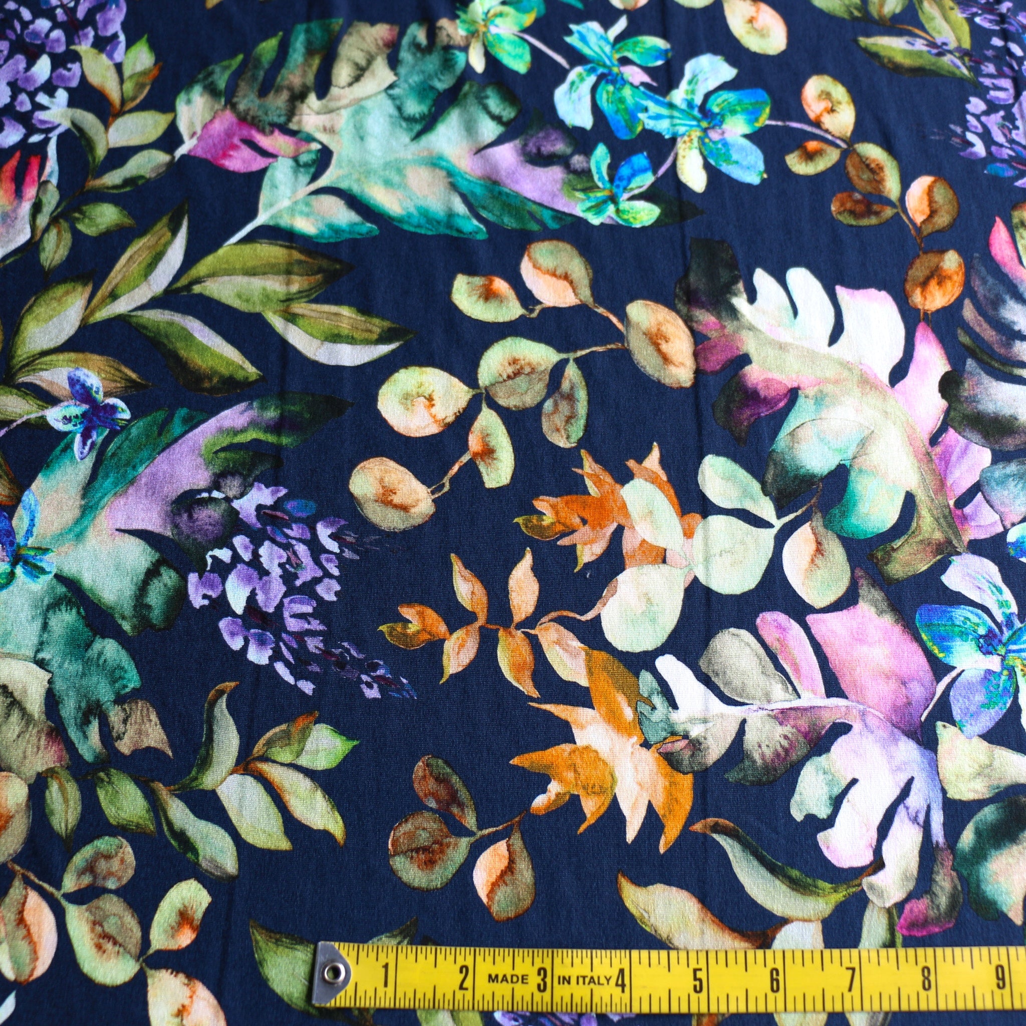 Italian opalescent blue/green floral on navy printed 94% viscose 6% elastane jersey knit
